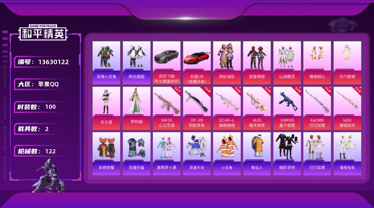 - PX_2081314- 苹果手Q-2王牌印记-6粉装-7特效枪-2载具-76460热力值-138套装-213枪皮-0卓越印记-0传奇印记 【6粉装】,绯穹魔姬,暗夜玫瑰,碧影闪光,水仙星,金风玉露,快乐主宰 【7特效枪】SCAR-L-梦幻火箭-6级 SCAR-L-机甲封神-5级 M416-超新星-3级 M416-五爪金龙-5级 Kar98K-巳巳如意-3级 Kar98K-绿意幻情-4级 M24-星