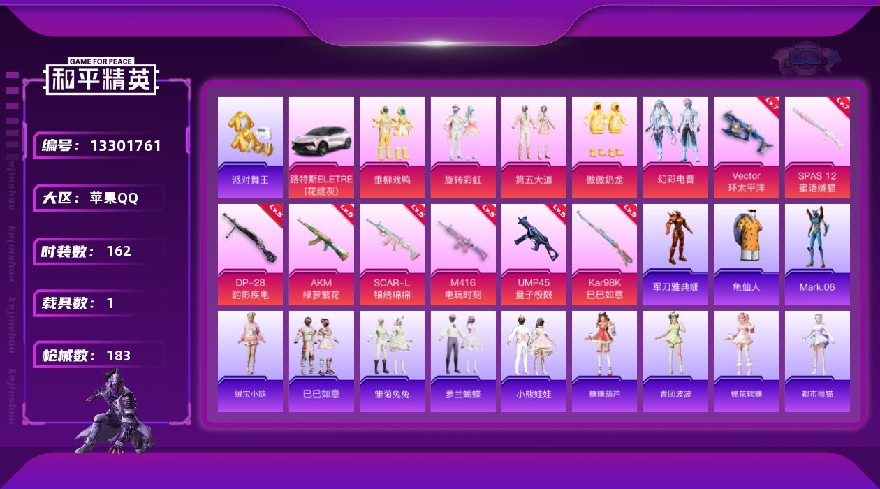 [13301761]【1428】苹果 手Q-5粉装-8特效枪-1载具-0粉色飞行器-60791热力值-12王牌印记-162套装-183枪皮 【热门品类】:套装-派对舞王,角色-军刀雅典娜,套装-龟仙人,角色-Mark.06 【粉色载具】:路特斯ELETRE(花绽灰) 【粉色套装】:粉装-垂柳戏鸭,粉装-旋转彩虹,粉装-第五大道,粉装-傲傲奶龙,粉装-幻彩电音 【粉色枪皮等级】:AKM-绿萝繁花(五级),SCAR-L-锦绣绵绵(五级),M416-电玩时刻(五级),UMP45-量子极限(五级),Vector-环太平洋(七级),Kar98K-巳巳如意(五级),SPAS-12-蜜语绒猫(七级),DP-28-豹影疾电(五级) 【粉色枪皮】:AKM-绿萝繁花,SCAR-L-锦绣绵绵,M416-电玩时刻,UMP45-量子极限,Vector-环太平洋,Kar98K-巳巳如意,SPAS-12-蜜语绒猫,DP-28-豹影疾电 【粉色降落伞】:环太平洋降落伞,旋转彩虹降落伞,猪猪侠降落伞,精灵梦叶罗丽降落伞,精灵之光降落伞,千金淑猫降落伞,星穹咏叹调降落伞,幻彩电音降落伞,荧海星豚降落伞 【稀有套装】:套装-龟仙人,套装-绒宝小鹅,套装-巳巳如意,套装-雏菊兔兔,套装-萝兰蝴蝶,套装-小熊娃娃,套装-糖糖葫芦,套装-青团波波,套装-棉花软糖,角色-都市丽猫,角色-摩登魅猫,套装-燕燕于飞,套装-鱼渊荷华,角色-风玲,套装-粉恋花,套装-紫幽梦,套装-蓝冰羽,套装-极速光影,套装-彩虹兔,套装-云朵鹅,套装-雪绒豹,套装-蜜露汐语,套装-蓝海鲸歌 【稀有枪皮】:AKM-灼热熔岩,AKM-环太平洋,AKM-霓虹街区,AKM-龙的传人,M16A4-幻世战舞者,M16A4-千金淑猫,SCAR-L-玉兔迎春,SCAR-L-红色方程式,M416-糯团青竹,M416-蓝色火焰,GROZA-彩虹符号,GROZA-生命誓言,GROZA-田园牧歌,GROZA-荧海星豚,AUG-天降萌叽,AUG-甜蜜菠萝,AUG-耀粉歌者,M762-天降萌叽,M762-牛气冲天,M762-第五大道,M762-云朵鹅,Mk47-妙红点点,G36C-星穹咏叹调,AC-VAL-天降萌叽,AC-VAL-快闪甜心,蜜獾-天降萌叽,蜜獾-娇憨猪猪,UZI-啾咪啾咪,UZI-天降萌叽,UZI-娇憨猪猪,UMP45-涂山之恋,UMP45-生命誓言,UMP45