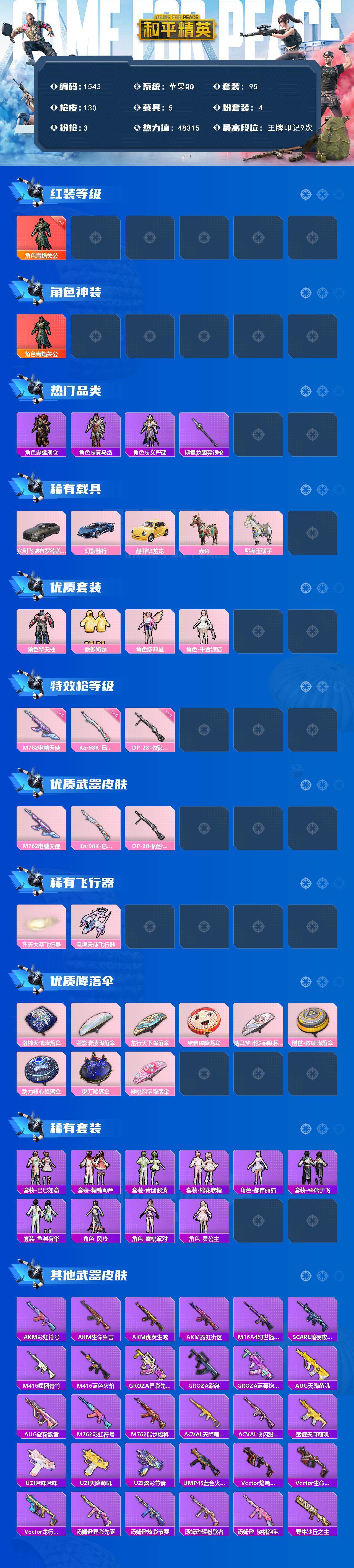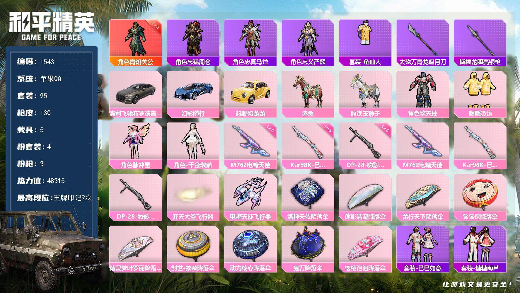 [13630464]【1543】苹果 手Q-1神装-4粉装-3特效枪-5载具-3粉色飞行器-48315热力值-9王牌印记-95套装-130枪皮