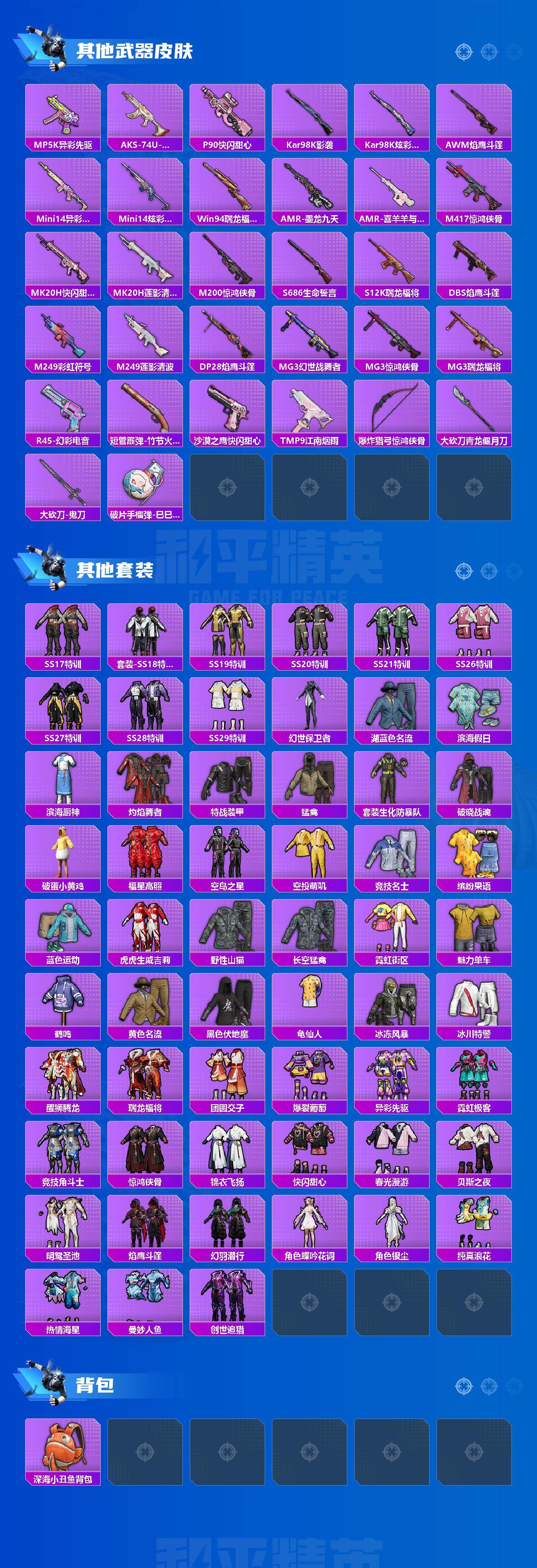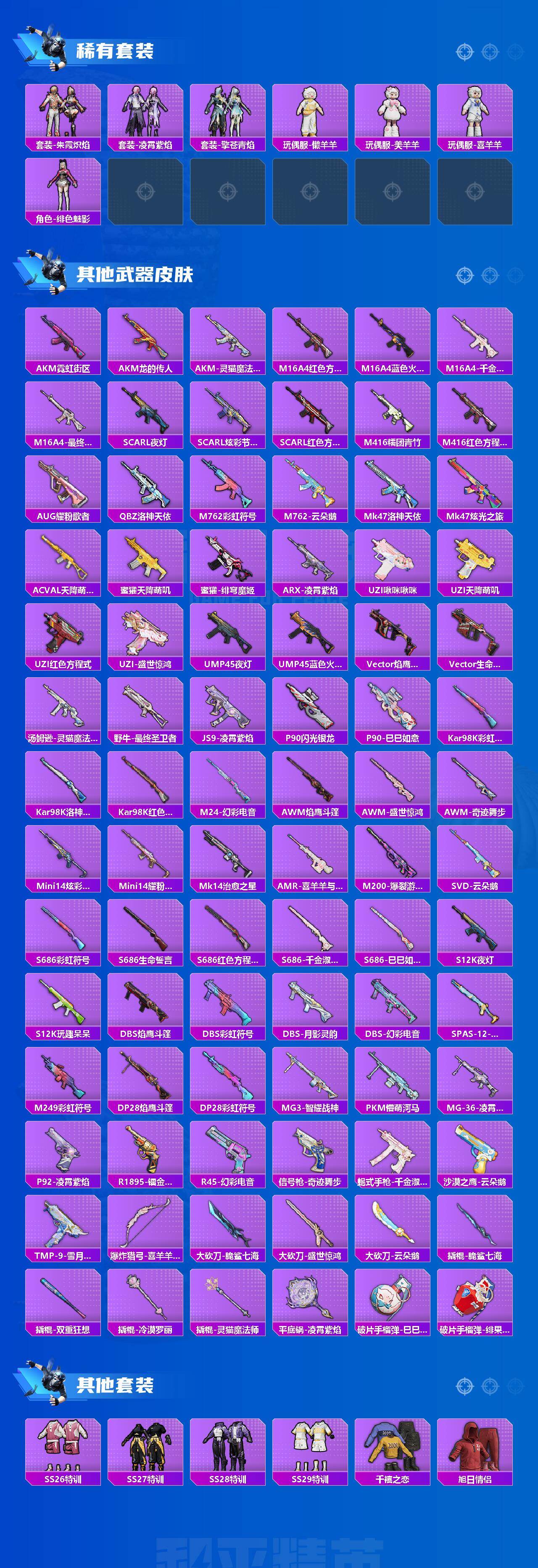 【稀有枪皮】:AKM-彩虹符号,AKM-生命誓言,AKM-虎虎生威,AKM-霓虹街区,M16A4-幻世战舞者,SCAR-L-暗夜玫瑰,M416-糯团青竹,M416-蓝色火焰,GROZA-异彩先驱,GROZA-影袭,GROZA-蓝莓炮弹,AUG-天降萌叽,AUG-耀粉歌者,M762-彩虹符号,M762-瑞龙福将,AC-VAL-天降萌叽,AC-VAL-快闪甜心,蜜獾-天降萌叽,UZI-啾咪啾咪,UZI-天降萌叽,UZI-炫彩节奏,UMP45-蓝色火焰,Vector-焰鹰斗篷,Vector-生命誓言,Vector-龙行天下,汤姆逊-异彩先驱,汤姆逊-炫彩节奏,汤姆逊-耀粉歌者,汤姆逊-樱桃泡泡,野牛-沙丘之主,MP5K-异彩先驱,AKS-74U-鬼刀,P90-快闪甜心,Kar98K-影袭,Kar98K-炫彩节奏,AWM-焰鹰斗篷,Mini14-异彩先驱,Mini14-炫彩节奏,Win94-瑞龙福将,AMR-喜羊羊与灰太狼,AMR-墨龙九天,M417-惊鸿侠骨,MK20-H-快闪甜心,MK20-H-莲影清波,M200-惊鸿侠骨,S686-生命誓