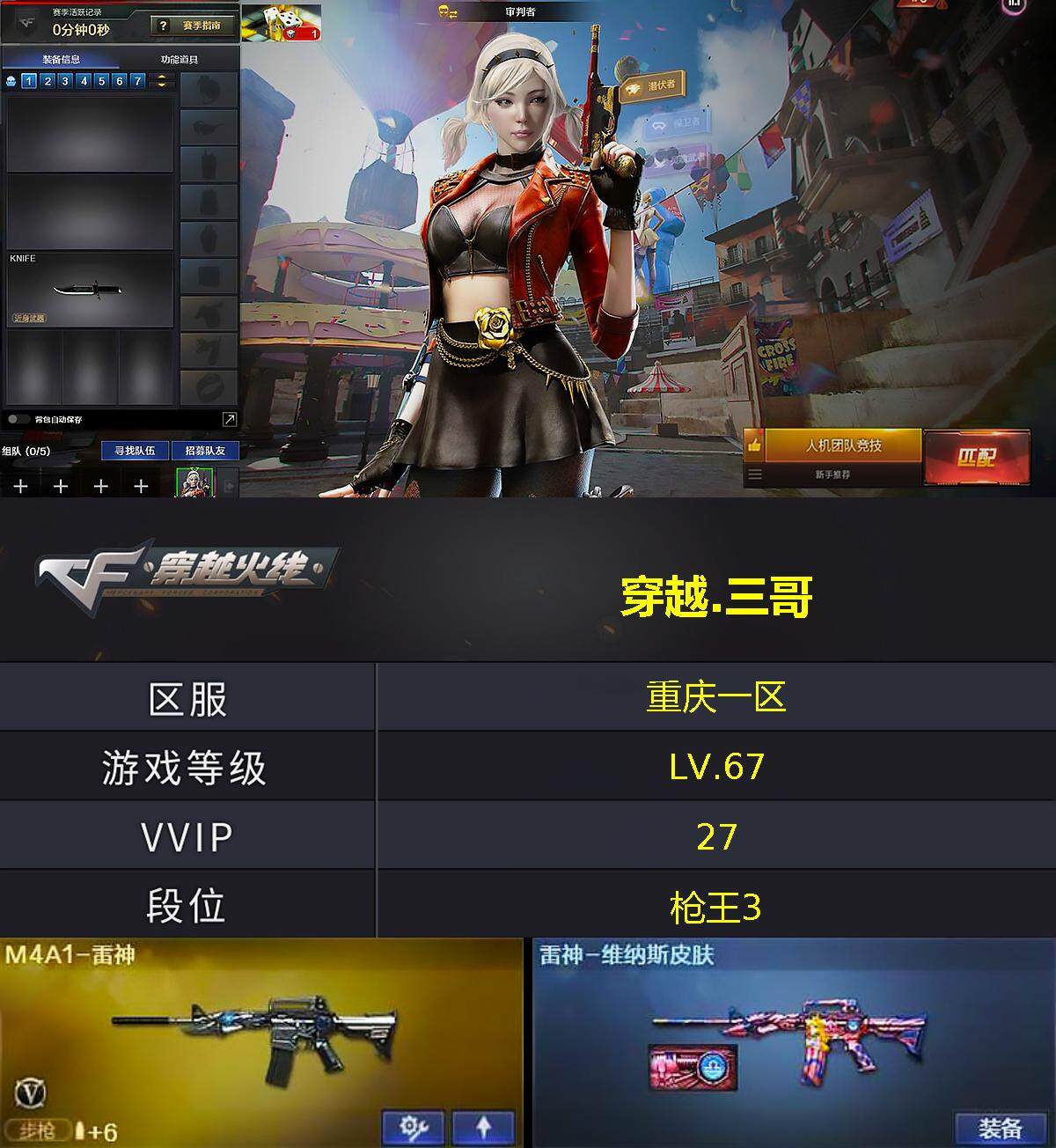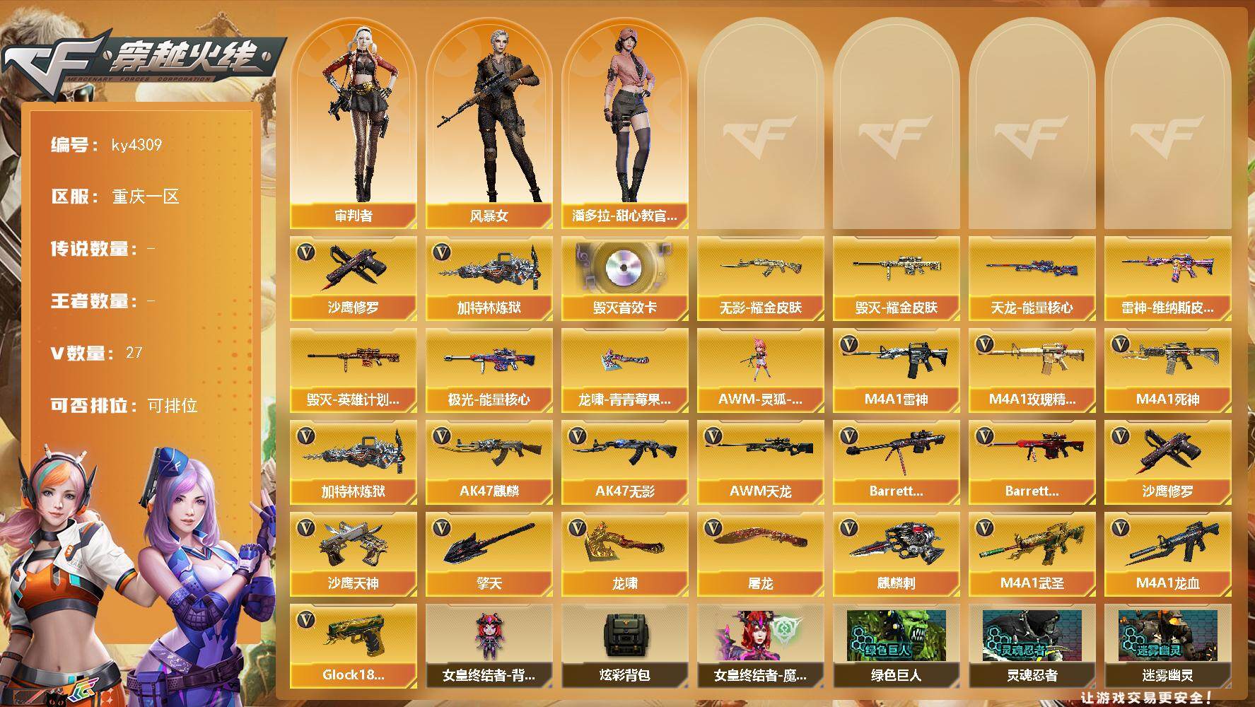 [15247336]重庆一区-27V-0王者-0炫金 【热门武器】:加特林-炼狱,沙鹰-修罗*2 【音效卡】:Barrett-毁灭音效卡 【皮肤】:雷神-维纳斯皮肤,毁灭耀金皮肤,毁灭-英雄计划 皮肤,无影耀金皮肤,天龙-能量核心,极光-能量核心,龙啸-青青莓果 皮肤 【角色】:审判者,风暴女,潘多拉-甜心教官 【人偶武器】:AWM-灵狐-15周年嘉年华 【英雄级武器】:AK47-麒麟*2,M4A1-雷神,AK47-无影,M4A1-死神,M4A1-武圣,M4A1-龙血,M4A1-玫瑰精灵,AWM-天龙,Barrett-毁灭,Barrett-极光*2,加特林-炼狱,沙鹰-修罗*2,沙鹰-天神*2,Glock18-武圣,屠龙*3,龙啸*3,擎天,麒麟刺 【道具】:女皇终结者-背包,炫彩背包,女皇终结者-魔龙之吻,绿色巨人,灵魂忍者,迷雾幽灵,夺命之镰,防化服*2,流光-鎏金之域,防弹头盔*2,防弹衣*2,C4工具钳*2,手雷包*2 【特殊枪械】:1炼狱