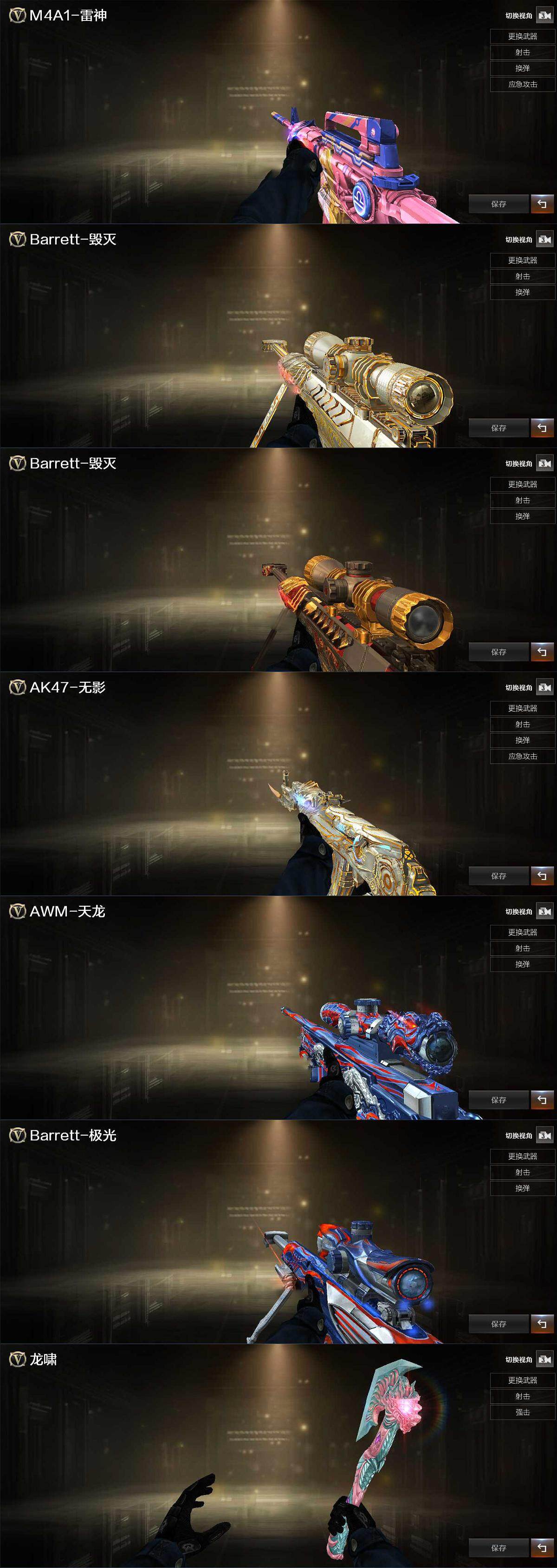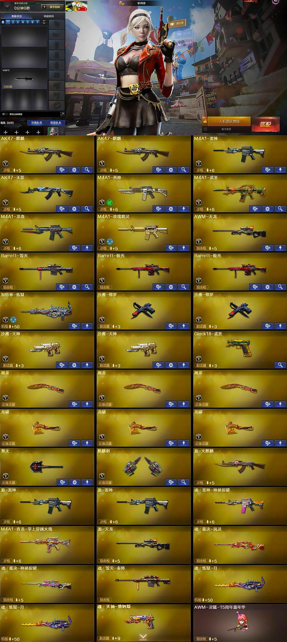 【英雄级武器】:AK47-麒麟*2,M4A1-雷神,AK47-无影,M4A1-死神,M4A1-武圣,M4A1-龙血,M4A1-玫瑰精灵,AWM-天龙,Barrett-毁灭,Barrett-极光*2,加特林-炼狱,沙鹰-修罗*2,沙鹰-天神*2,Glock18-武圣,屠龙*3,龙啸*3,擎天,麒麟刺