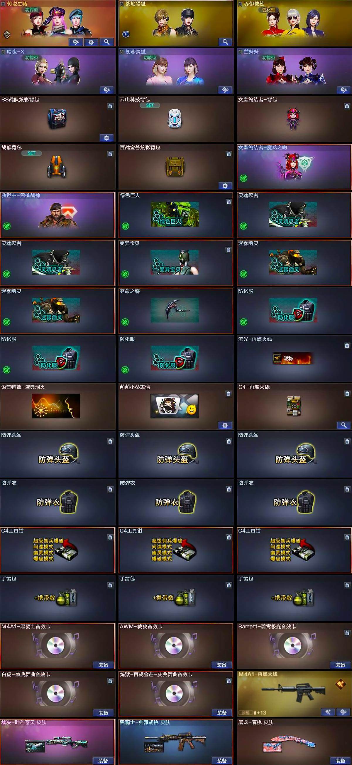 【道具】:BS战队炫彩背包,云山科技背包,女皇终结者-背包,战舰背包,百战金芒炫彩背包,女皇终结者-魔龙之吻,救世主-黑桃战神,绿色巨人,灵魂忍者*2,变异宝贝,迷雾幽灵*2,夺命之镰,防化服*3,流光-再燃火线,语音特效-盛典烟火,萌萌小葵表情,C4-再燃火线,防弹头盔*3,防弹衣*3,C4工具钳*3,手雷包*3