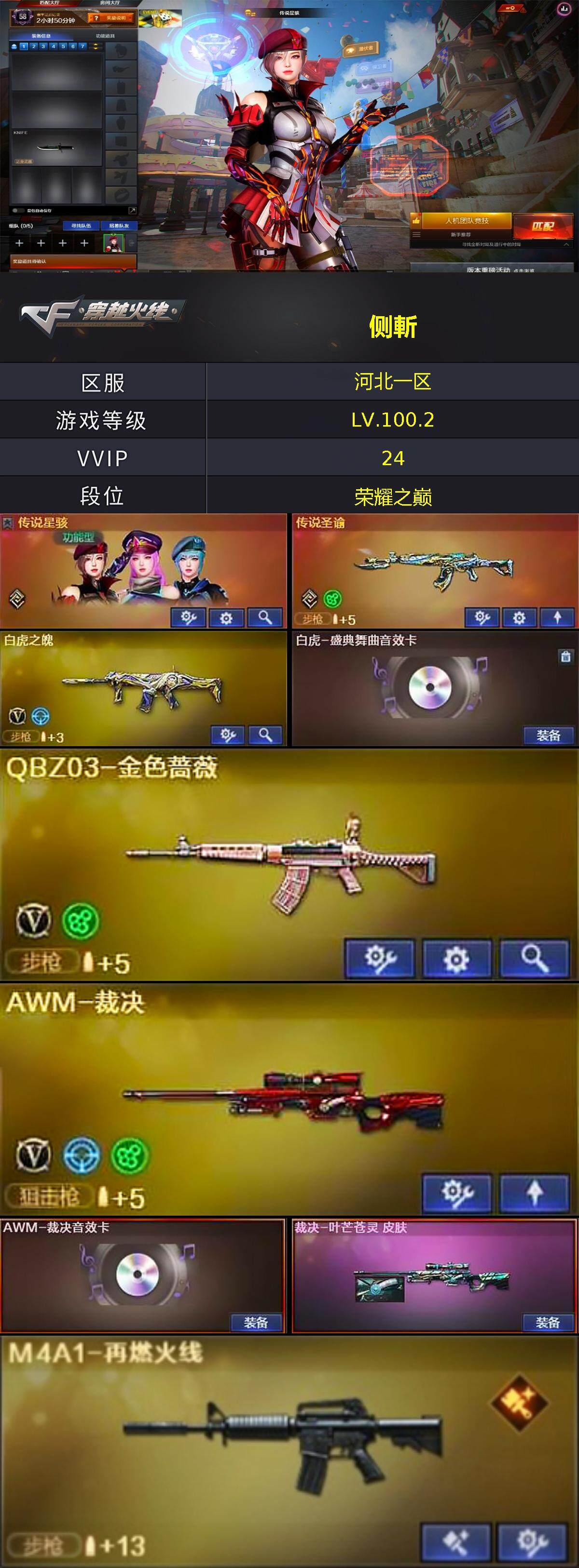 [15249094]河北一区-21V-2王者-0炫金 【传说武器】:传说圣谕 【传说角色】:传说星骇 【热门武器】:传说圣谕,QBZ03-金色蔷薇,M4A1-黑骑士 【王者炫金武器】:王者冰锋 【音效卡】:M4A1-黑骑士音效卡,AWM-裁决音效卡,Barrett-碧霄极光音效卡,白虎-盛典舞曲音效卡,炼狱-百战金芒-庆典舞曲音效卡 【皮肤】:裁决-叶芒苍灵 皮肤,M4A1-再燃火线,黑骑士-典雅胡桃 皮肤,屠龙-春桃 皮肤,轻型军用手斧-再燃火线 【角色】:战地猎狐,乔伊教练,暗夜-X,初恋灵狐,兰妹妹 【人偶武器】:火麒麟-灵狐,AWM-灵狐-15周年嘉年华,生化手雷-机甲核心 【暴走生化】:超级对讲机 【挑战大师】:冰龙粉碎者-白马银枪,激光毁灭者III-白马银枪 【英雄级武器】:M4A1-黑骑士,QBZ03-金色蔷薇,白虎之魄-觉醒版,AWM-裁决,炼狱-百战金芒,屠龙,屠龙-动感闪耀,麒麟刺-百战金芒,高爆手雷-雷暴,闪光弹-雷暴,闪光弹-玄豹,烟雾弹-堕天神,烟雾弹-玄豹*2,M4A1-苍鸣雷神,Barrett-碧霄极光 【道具】:BS战队炫彩背包,云山科技背包,女皇终结者-背包,战舰背包,百战金芒炫彩背包,女皇终结者-魔龙之吻,救世主-黑桃战神,绿色巨人,灵魂忍者*2,变异宝贝,迷雾幽灵*2,夺命之镰,防化服*3,流光-再燃火线,语音特效-盛典烟火,萌萌小葵表情,C4-再燃火线,防弹头盔*3,防弹衣*3,C4工具钳*3,手雷包*3 【特殊枪械】:1黑骑士