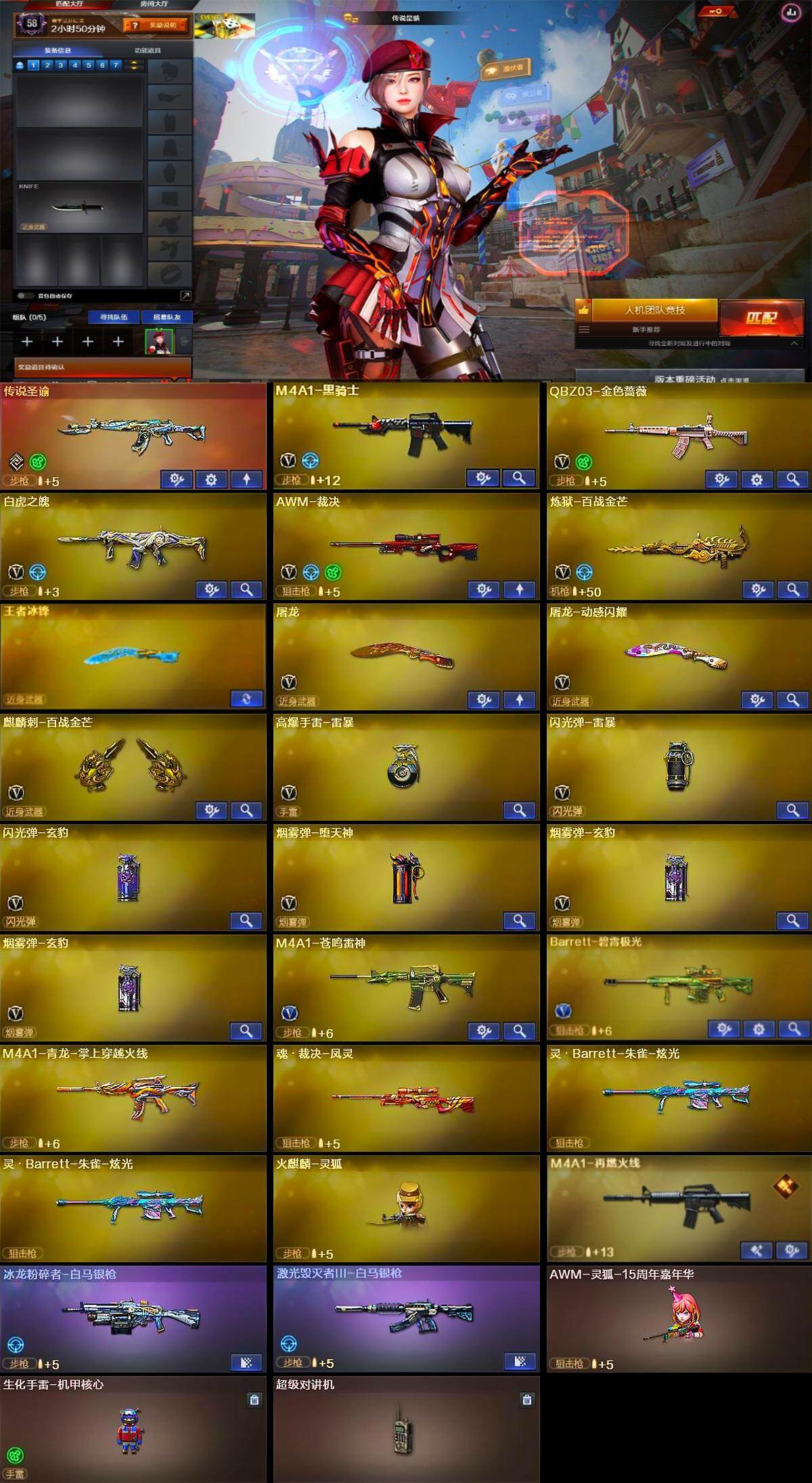 【英雄级武器】:M4A1-黑骑士,QBZ03-金色蔷薇,白虎之魄-觉醒版,AWM-裁决,炼狱-百战金芒,屠龙,屠龙-动感闪耀,麒麟刺-百战金芒,高爆手雷-雷暴,闪光弹-雷暴,闪光弹-玄豹,烟雾弹-堕天神,烟雾弹-玄豹*2,M4A1-苍鸣雷神,Barrett-碧霄极光