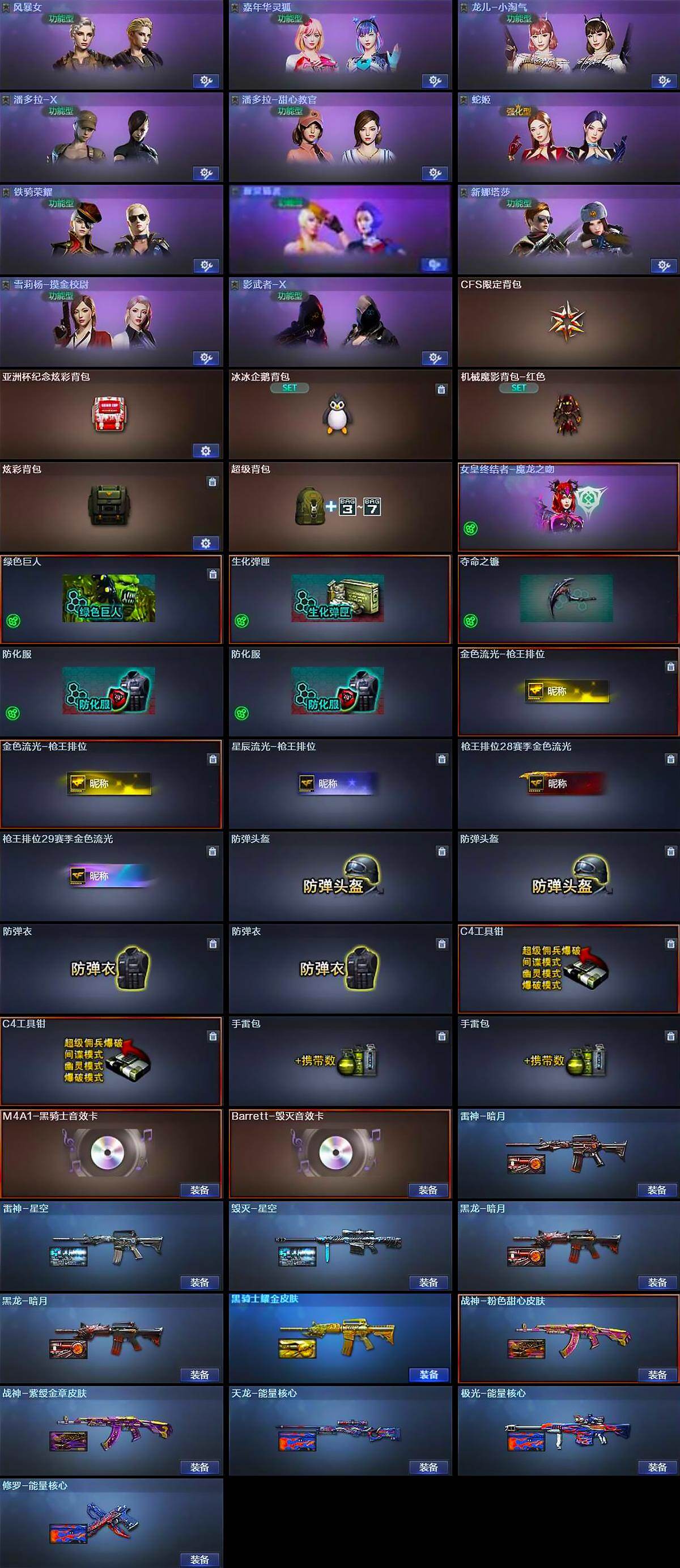 【道具】:CFS限定背包,亚洲杯纪念炫彩背包,冰冰企鹅背包,机械魔影背包-红色,炫彩背包,超级背包,女皇终结者-魔龙之吻,绿色巨人,生化弹匣,夺命之镰,防化服*2,金色流光-枪王排位*2,星辰流光-枪王排位,枪王排位28赛季金色流光,枪王排位29赛季金色流光,防弹头盔*2,防弹衣*2,C4工具钳*2,手雷包*2