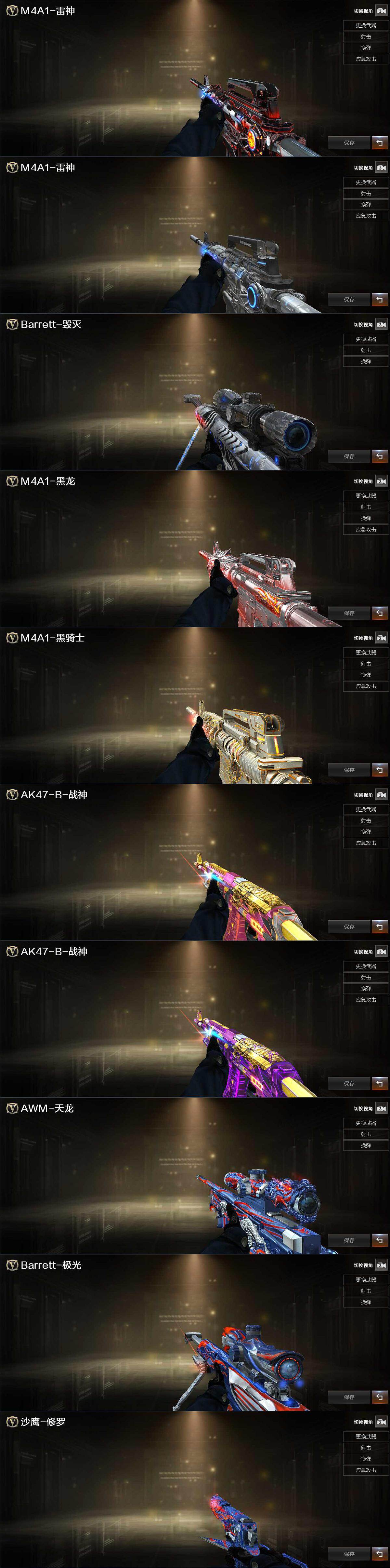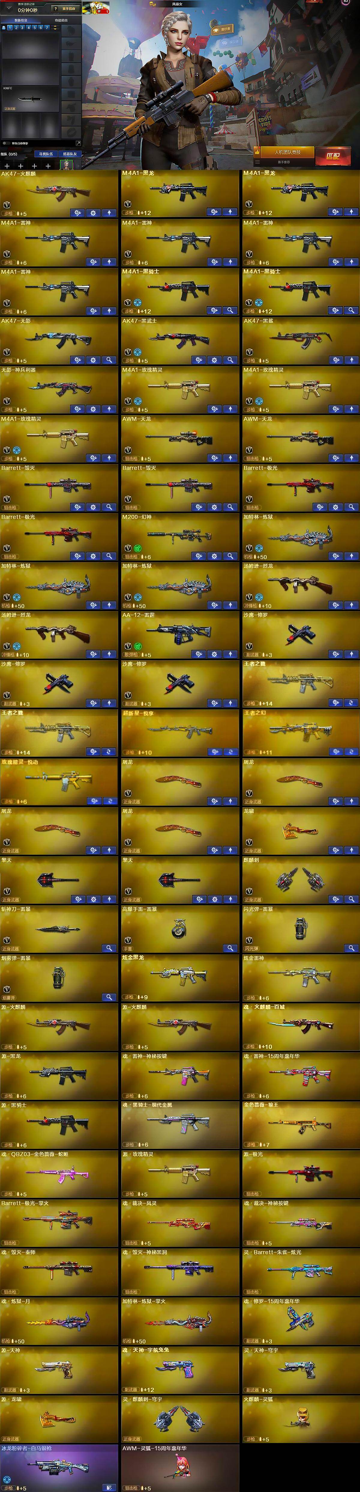 【英雄级武器】:AK47-火麒麟,M4A1-黑龙*2,M4A1-雷神*4,M4A1-黑骑士*2,AK47-无影,AK47-黑武士,AK47-黑鲨,无影-神兵利器,M4A1-玫瑰精灵*3,AWM-天龙*2,Barrett-毁灭*2,Barrett-极光*2,M200-幻神,加特林-炼狱*3,汤姆逊-烈龙*2,AA-12-雷霆,沙鹰-修罗*3,屠龙*4,龙啸,擎天*2,麒麟刺,斩神刀-雷暴,高爆手雷-雷暴,闪光弹-雷暴,烟雾弹-雷暴