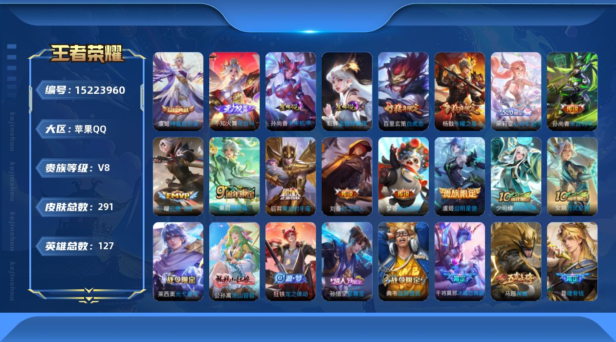 [15223960]【店主推荐捡漏号!可直接换绑】苹果Q-V8-永恒钻石II段位-127英雄-291皮肤-1典藏皮肤-1无双-11传说-90史诗 【英雄全皮】:阿轲全皮,鬼谷子全皮,蒙恬全皮,海诺全皮 【荣耀典藏】:虞姬神鉴启示录 【无双皮肤】:不知火舞花合斗 【传说皮肤】:后羿神树通天,桑启鸣野蒿,朵莉亚心动手记,虞姬启明星使,曜云鹰飞将,刘备时之恋人,百里玄策白虎志,梦奇胖达荣荣,后羿黄金射手座,杨戬永曜之星,孙尚香末日机甲 【限定皮肤】:白起狰,暃埋骨钱,蔡文姬夏日便利店,大乔绒语心约,虞姬夏日便利店,姜子牙天穹之誓,李白谪仙醉月,狄仁杰阴阳师,虞姬凯尔特女王,赵云皇家上将,嬴政白昼王子,孙尚香蔷薇恋人,鲁班七号狮舞东方,庄周玄嵩,庄周高山流水,高渐离死亡摇滚,阿轲迷踪丽影,孙膑妖精王,扁鹊炼金王,芈月重明,吕布猎兽之王,周瑜赤莲之焰,元歌云间偶戏,夏侯惇朔风刀,甄姬游园惊梦,曹操烛龙,典韦穷奇,典韦蓝屏警告,狄仁杰魔术师,狄仁杰万华元夜,达摩沙漠行僧,项羽海滩派对,项羽霸王别姬,老夫子圣诞老人,老夫子醍醐杖,程咬金演武夺筹,露娜一生所爱,刘邦夺宝奇兵,王昭君午后时光,兰陵王驯魔猎人,兰陵王金庭之子,亚瑟潮玩骑士王,孙悟空至尊宝,牛魔御旌,李元芳银河之约,李元芳云中旅人,虞姬启明星使,钟馗神迹守卫,钟馗驱傩正仪,杨玉环遇见飞天,杨戬永曜之星,女娲朔望之晖,干将莫邪冰霜恋舞曲,雅典娜单词大作战,雅典娜黎明之约,蔡文姬繁星吟游,太乙真人饕餮,太乙真人华丽摇滚,东皇太一逐梦之光,鬼谷子原初探秘者,鬼谷子五谷丰年,百里玄策白虎志,弈星混沌棋,沈梦溪星空之诺,沈梦溪大漠名商,明世隐疑决卦,裴擒虎李小龙,裴擒虎擒涛扼浪,狂铁御狮,狂铁电玩高手,米莱狄御霄,米莱狄胡桃异想国,云中君纤云弄巧,盾山御銮,上官婉儿梁祝,蒙犽狂想玩偶喵,鲁班大师探海日志,桑启海盐诗旅,阿古朵江河有灵,张良古海寻踪,蒙恬荣光圣徽,鬼谷子天穹祈灯,姬小满妄想食味,沈梦溪龙舞盛年,刘邦剑破天穹,程咬金群星魔术团,镜青焰无极,项羽苍威无极,朵莉亚心动手记,海诺心动手记,刘备异域游侠,周瑜熔金海岸,不知火舞花合斗 【年限皮肤】:百里玄策白虎志,杨戬永曜之星,庄周玄嵩,马超神威 【赛季限定】:孙膑妖精王,扁鹊炼金王,白起狰,芈月重明,夏侯惇朔风刀,曹操烛龙,典韦穷奇,狄仁杰万华元夜,达摩沙漠行僧,老夫子醍醐杖,程咬金演武夺筹,