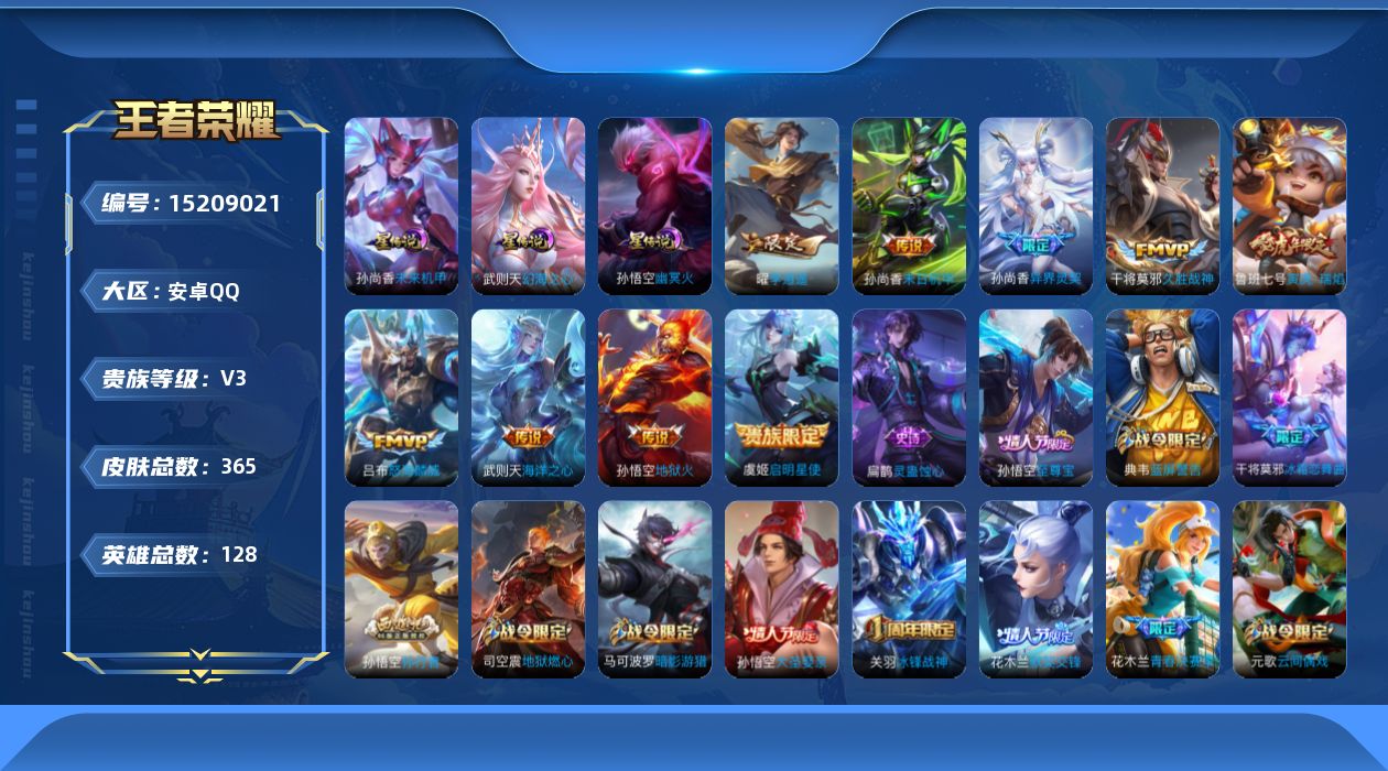 - [12084906]V9 1典藏 27传说 124英雄 338皮肤 典藏英雄武则天 可修改实名 优质装备:星域神启(倪克斯贼亮),黄金狮子座,冠军飞将,云鹰飞将(小将军),黄金白羊座,猫影幻舞,炽阳神光,一念神魔,末日机甲-孙尚香(绿蚂蚱),地狱火,仲夏夜之梦(大飞蛾),零号·赤焰,海洋之心,地狱之眼,游龙清影(小青龙),超时空战士-狄仁杰,挚爱之约,无双飞将,山海·苍雷引(电光曜子) 珍宝阁皮:优雅恋人,玩趣恶龙 限定皮:至尊宝,白虎志(电光耗子),凤求凰(白切鸡),太华(伽罗年限),武陵仙君(小桃花),异界灵契(白毛香),傲雪梅枪,时之彼端,魔法小厨娘,时雨天司(水龙头),神威(电光马子),飞衡(韩信年限),遇见飞天,高山流水,五谷丰年,青龙志(铠年限),冰锋战神,天狼运算者,梁祝,御风骁将(吕布年限),祈雪灵祝(雪兔子),天狼绘梦者,李小龙,逐梦之影,辉光之辰,如梦令-嫦娥,默契交锋-花木兰,真爱至上,孙行者,一生所爱,大圣娶亲,青春决赛季,冰霜恋舞曲,蜜橘之夏,神奇女侠,匿光追影者,寅虎·赤拳(老虎年限),百木心枪,玉兔公主 史诗皮:龙之律动,紫霞仙子,苍穹之光,电玩小子(小书包),白龙吟,黄金分割率,千年之狐,永昼,匿光侦查者,魅语,蒙恬荣光圣徽,无限星赏官,冰冠公主,青蛇,偶像歌手,晚萤,暗夜猫娘,末日机甲-吕布,猫狗日记-孙策,猫狗日记-大乔,乱世虎臣,节奏热浪,修罗,女仆咖啡,摇滚巨星,水果甜心,绅士熊喵,天才门将,星夜王子,心灵骇客,时之奇旅-安琪拉,功夫厨神,德古拉伯爵,暗隐猎兽者,幽灵船长,鬼剑武藏,暗渊魔法,心灵战警,舞动绿茵,地狱岩魂,纤云弄巧,繁星吟游(呼啦呼啦),拒霜思,缤纷独角兽,乘风破浪,逐浪之夏,水晶猎龙者,热力回旋,箭羽风息,金属风暴,原初追逐者,圣诞狂欢,圣诞恋歌,鹰眼统帅,魅力维加斯,黎明之约,雪上飞焰,赏金猎手,奇遇舞章,天秀·音浪,千筹问战,无心,未来纪元-赵云