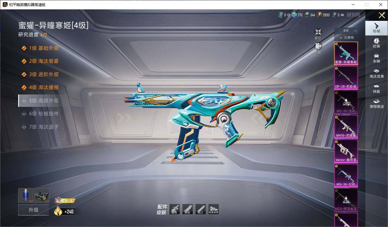 AKM-梦之光华,SCAR-L-青春物语,M416-心之恋语,M416-至情至圣,M416-墨龙九天,GROZA-巴啦啦小魔仙,GROZA-精灵之光,AUG-星梦奇缘,M762-激战未来,UMP45-宇宙意志,P90-沙丘之主,Kar98K-巳巳如意,M24-镜域双华,AMR-鸢尾晶梦,M417-第五大道,M200-梦海之灵,DP-28-千金淑猫,MG3-梦幻舞会,烟雾弹-丁香清露,破片手榴弹-粉粉猫爪