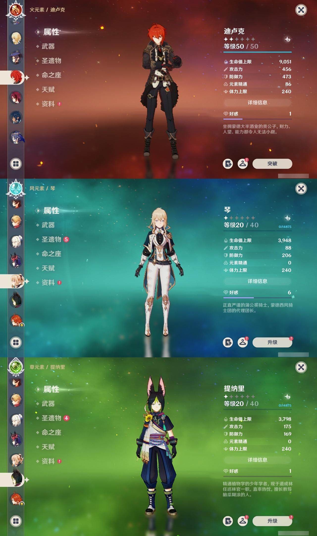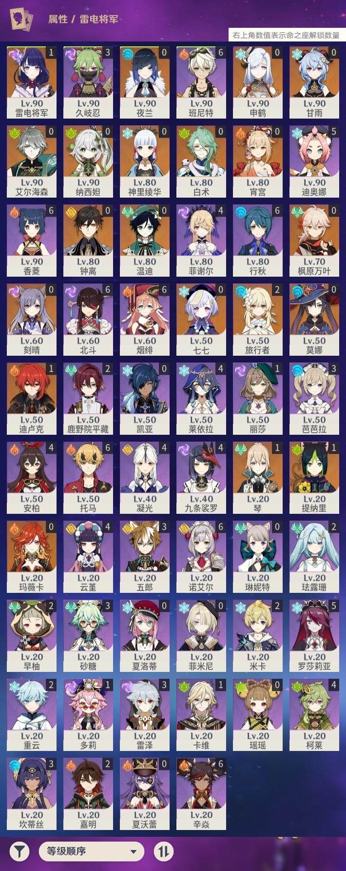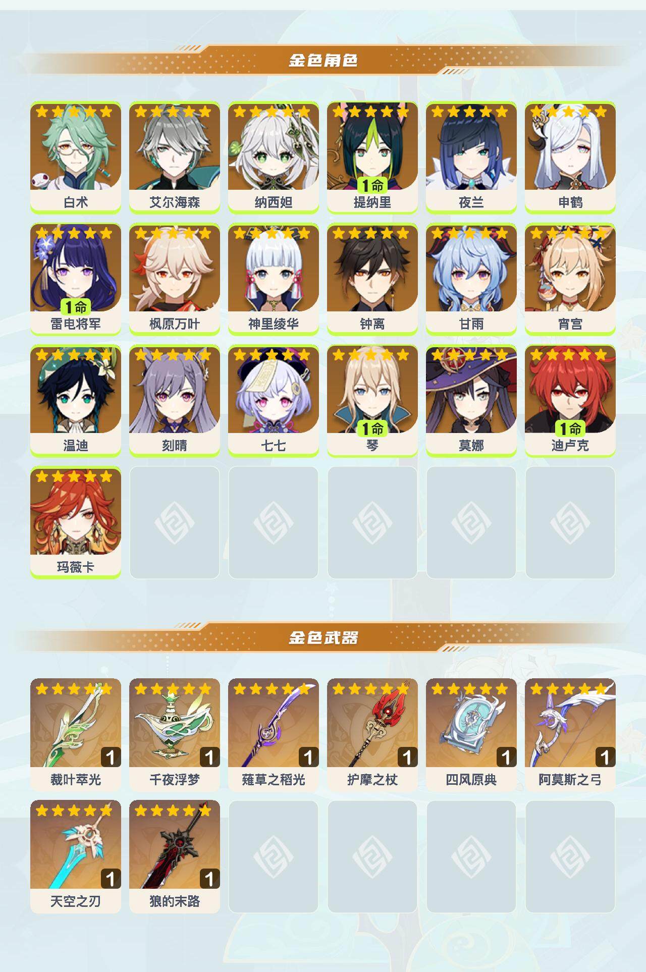 0命白术,0命艾尔海森,0命纳西妲,1命提纳里,0命夜兰,0命申鹤,1命雷电将军,0命枫原万叶,0命神里绫华,0命钟离,0命甘雨,0命宵宫,0命温迪,0命刻晴,0命七七,1命琴,0命莫娜,1命迪卢克,0命玛薇卡,精1裁叶萃光,精1千夜浮梦,精1薙草之稻光,精1护摩之杖,精1四风原典,精1阿莫斯之弓,精1天空之刃,精1狼的末路