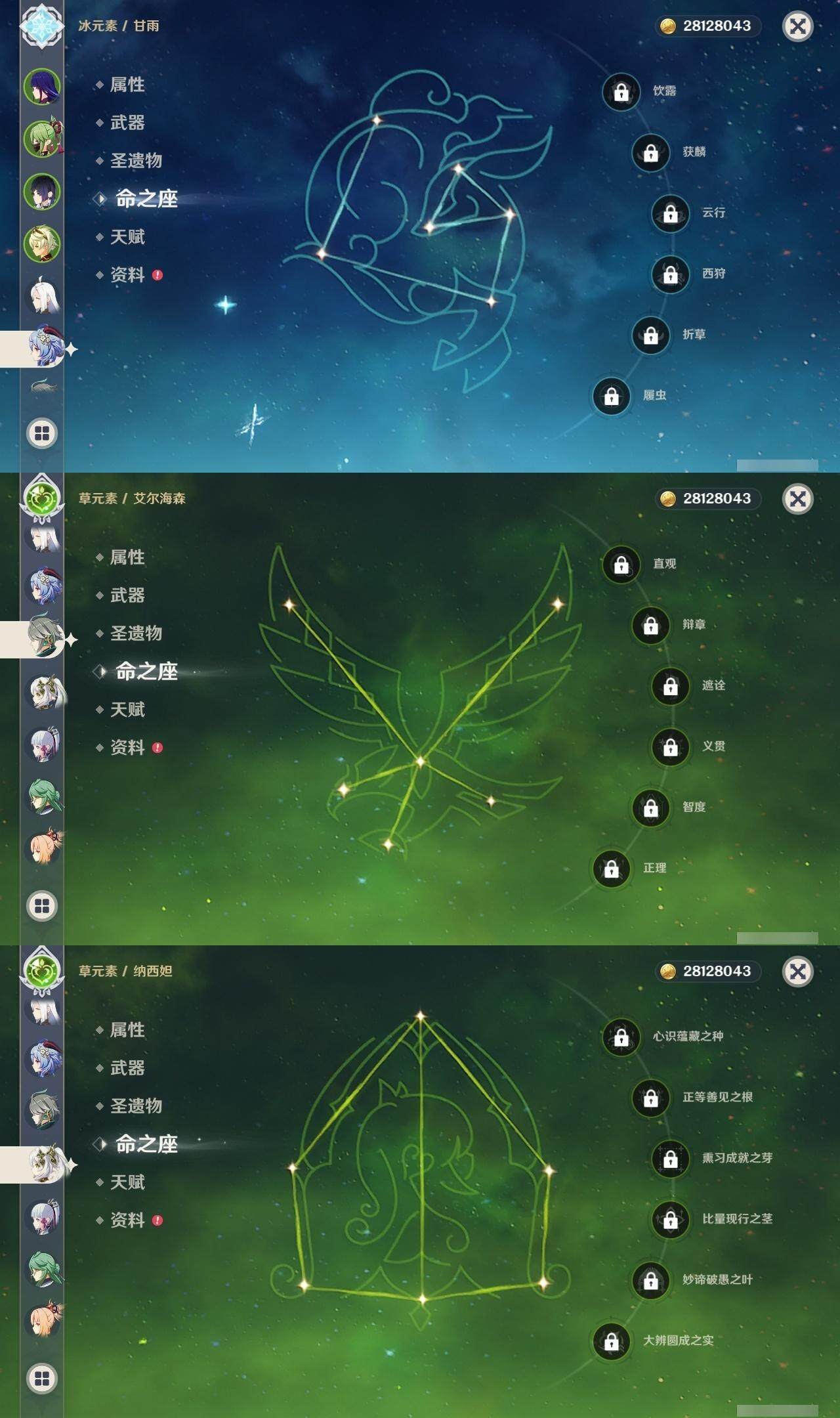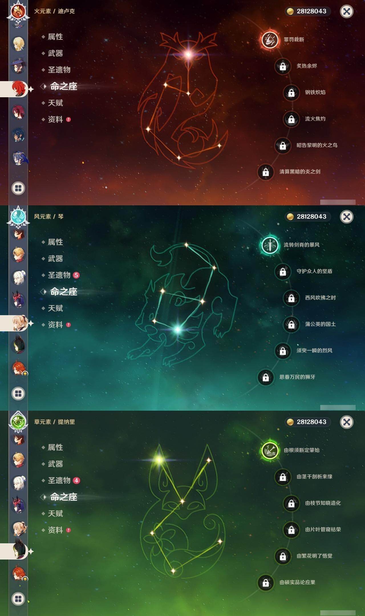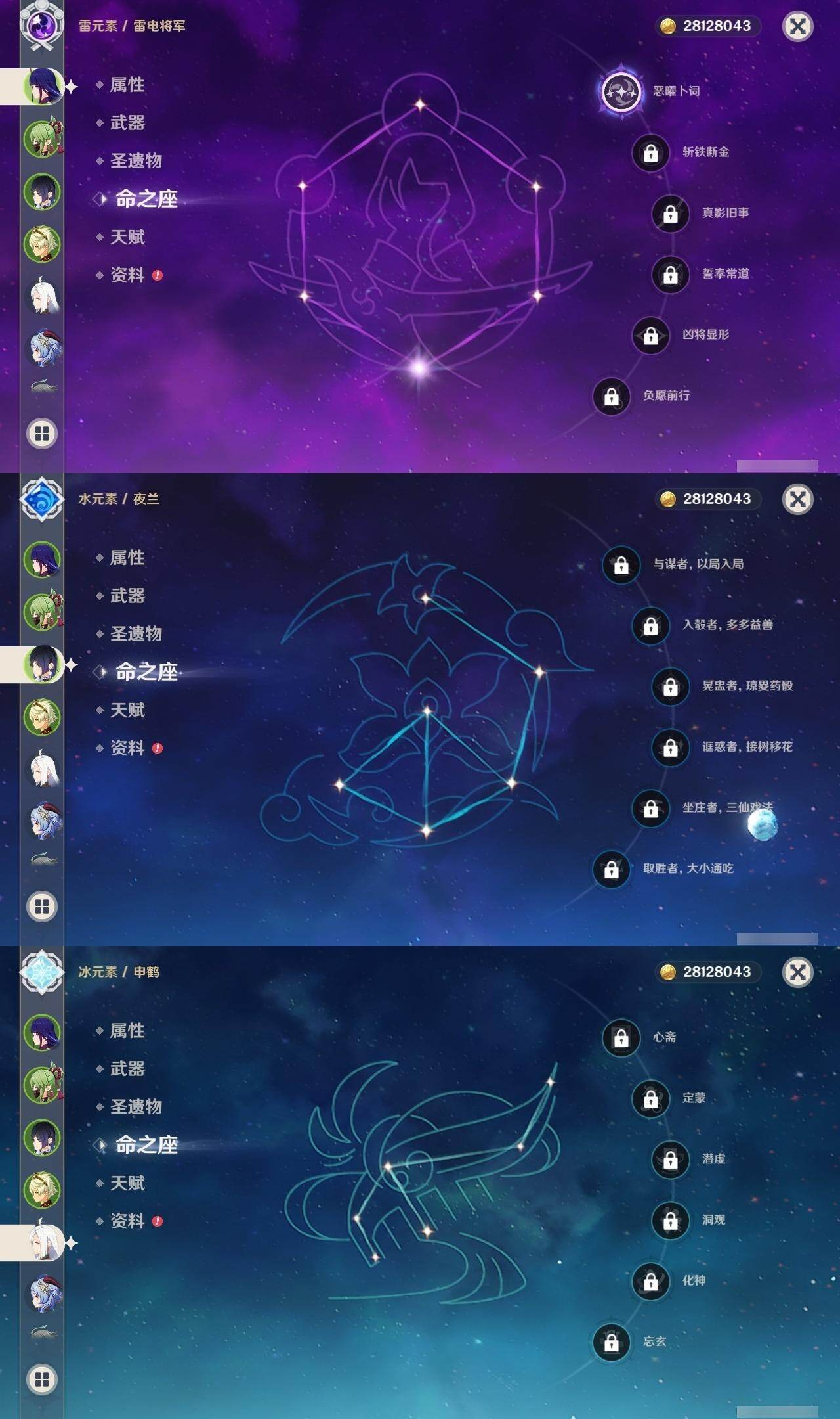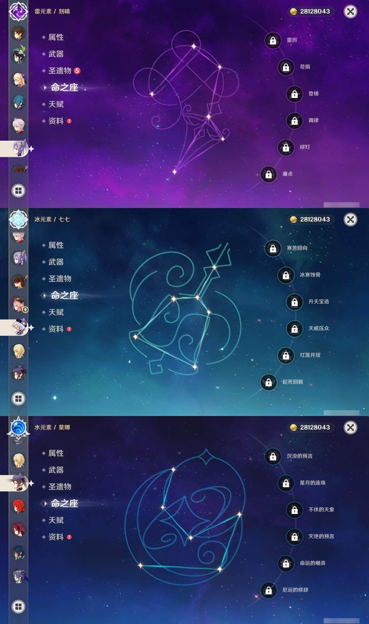 0命白术,0命艾尔海森,0命纳西妲,1命提纳里,0命夜兰,0命申鹤,1命雷电将军,0命枫原万叶,0命神里绫华,0命钟离,0命甘雨,0命宵宫,0命温迪,0命刻晴,0命七七,1命琴,0命莫娜,1命迪卢克,0命玛薇卡,精1裁叶萃光,精1千夜浮梦,精1薙草之稻光,精1护摩之杖,精1四风原典,精1阿莫斯之弓,精1天空之刃,精1狼的末路