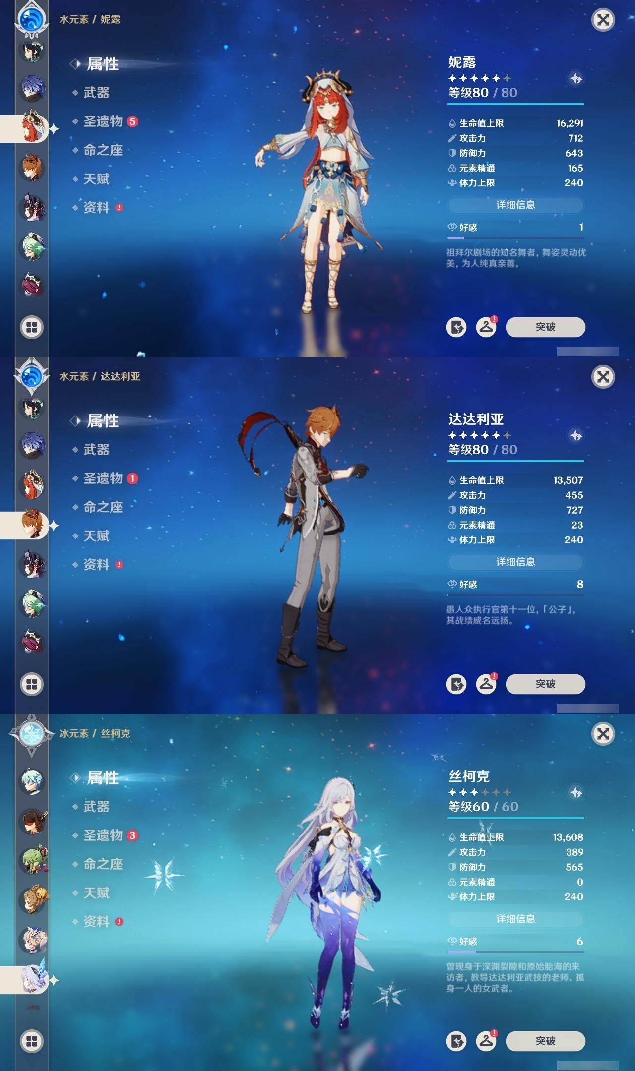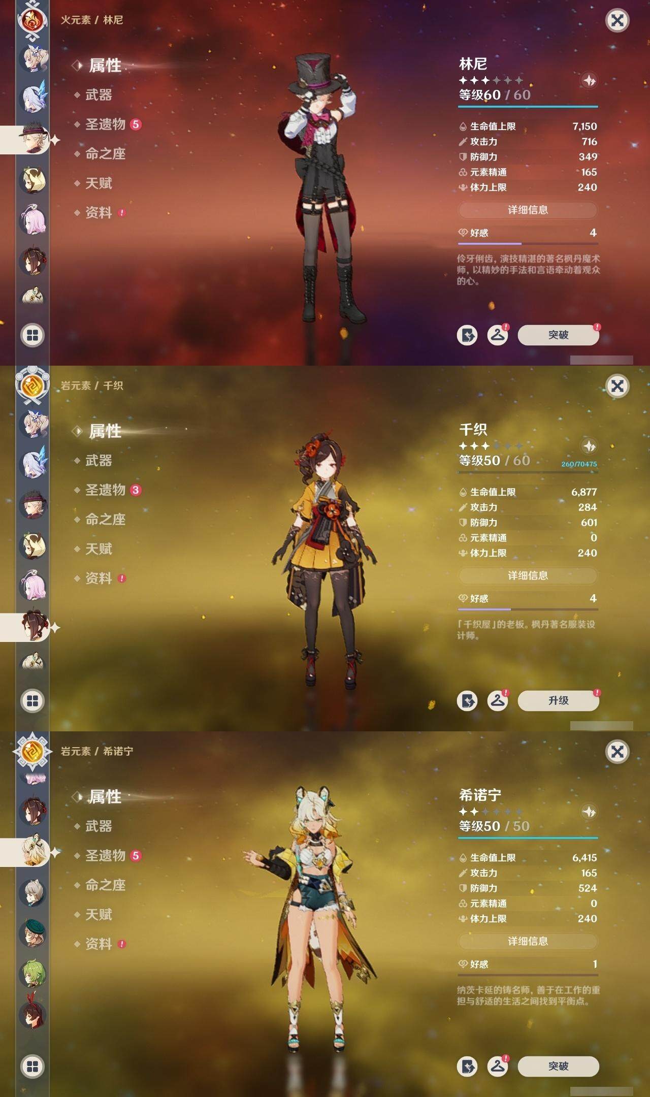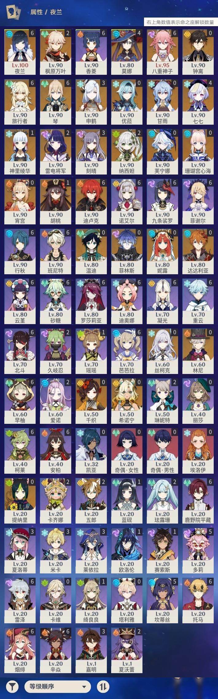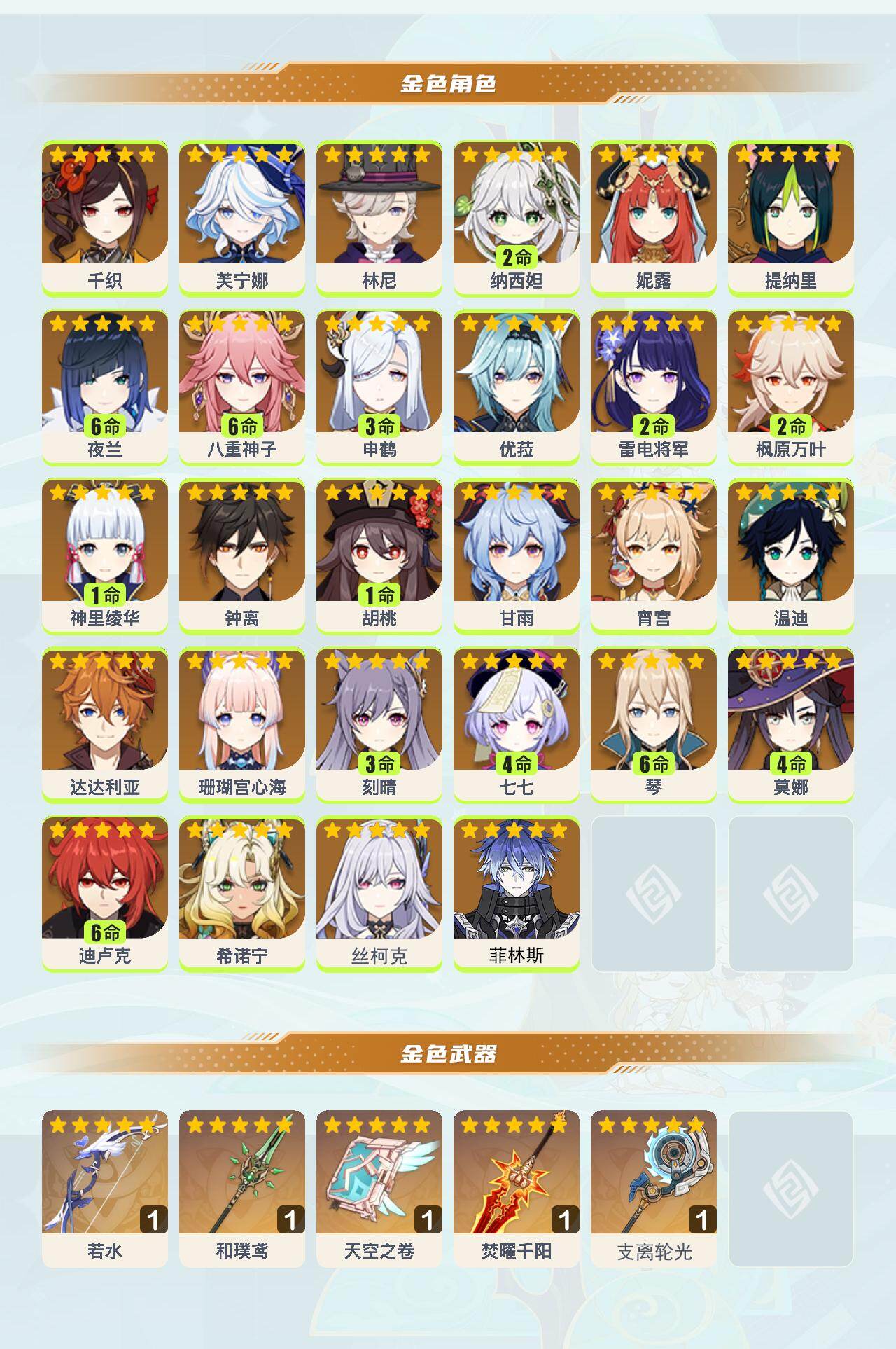 0命千织,0命芙宁娜,0命林尼,2命纳西妲,0命妮露,0命提纳里,满命夜兰,满命八重神子,3命申鹤,0命优菈,2命雷电将军,2命枫原万叶,1命神里绫华,0命钟离,1命胡桃,0命甘雨,0命宵宫,0命温迪,0命达达利亚,0命珊瑚宫心海,3命刻晴,4命七七,满命琴,4命莫娜,满命迪卢克,0命希诺宁,0命丝柯克,0命菲林斯,精1若水,精1和璞鸢,精1天空之卷,精1焚曜千阳,精1支离轮光