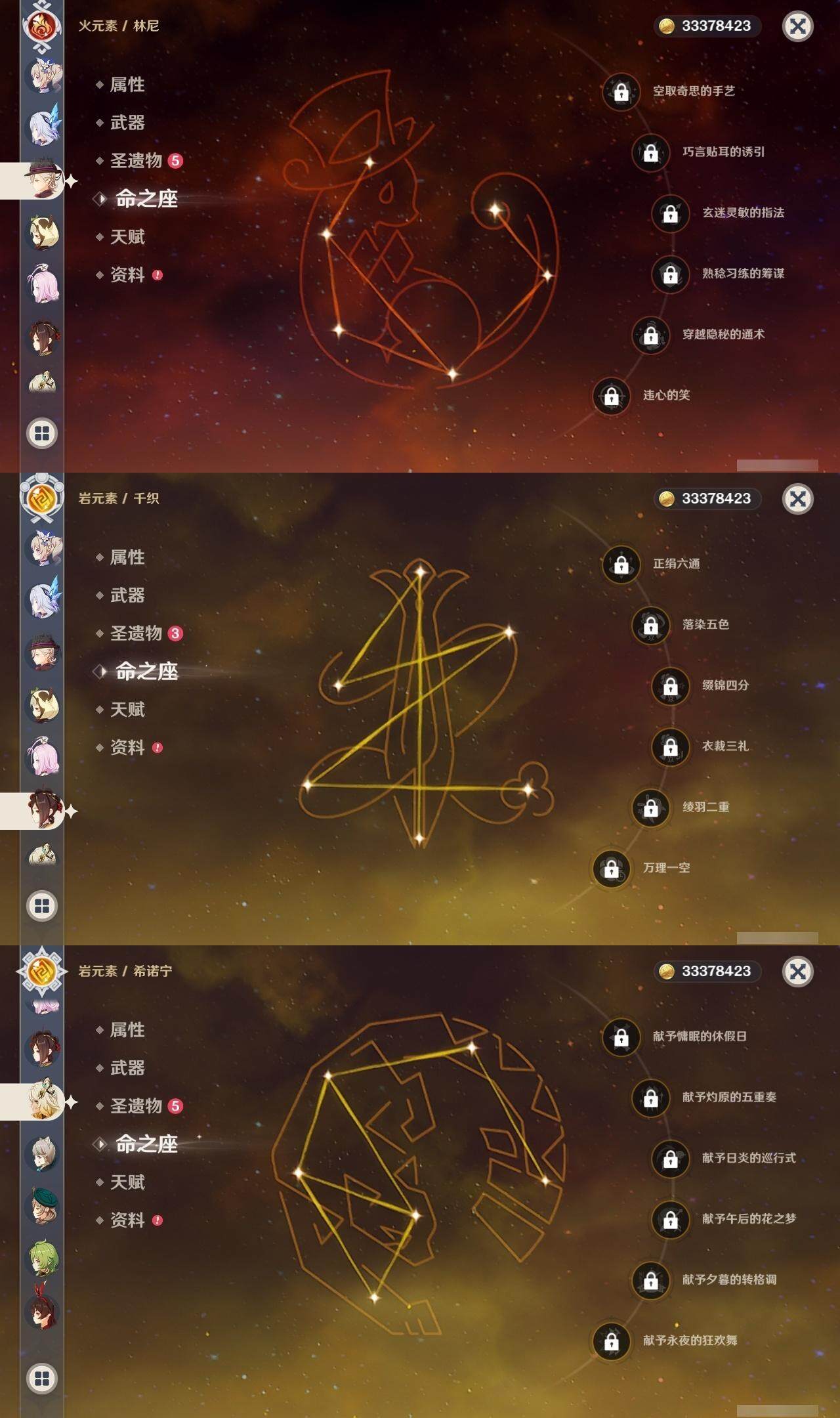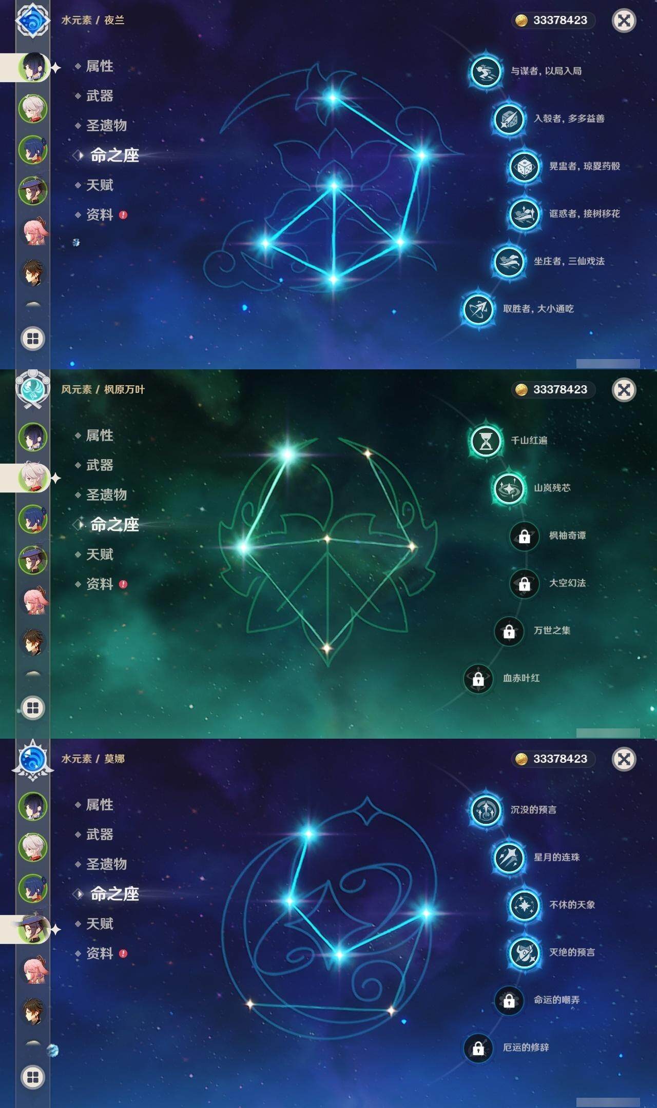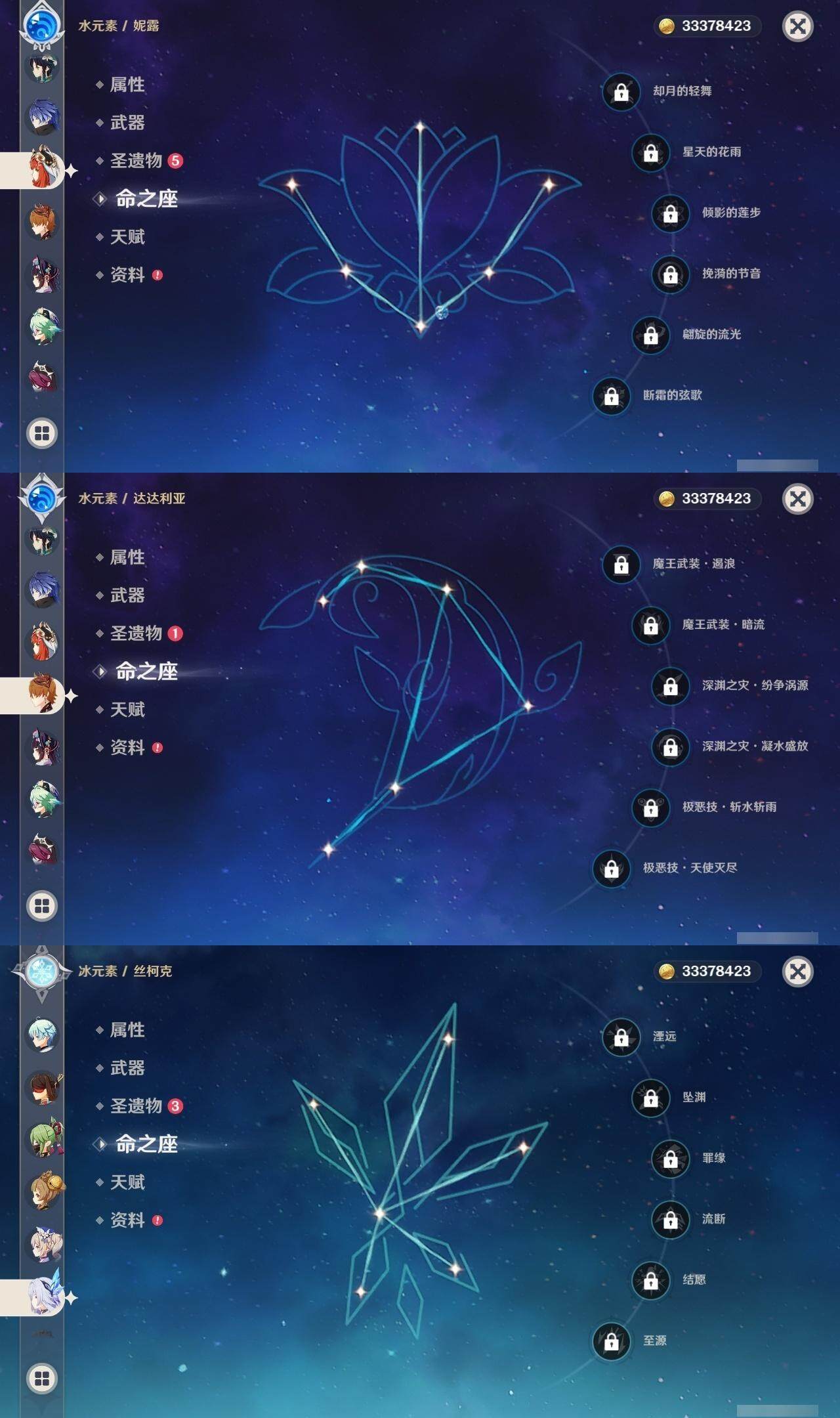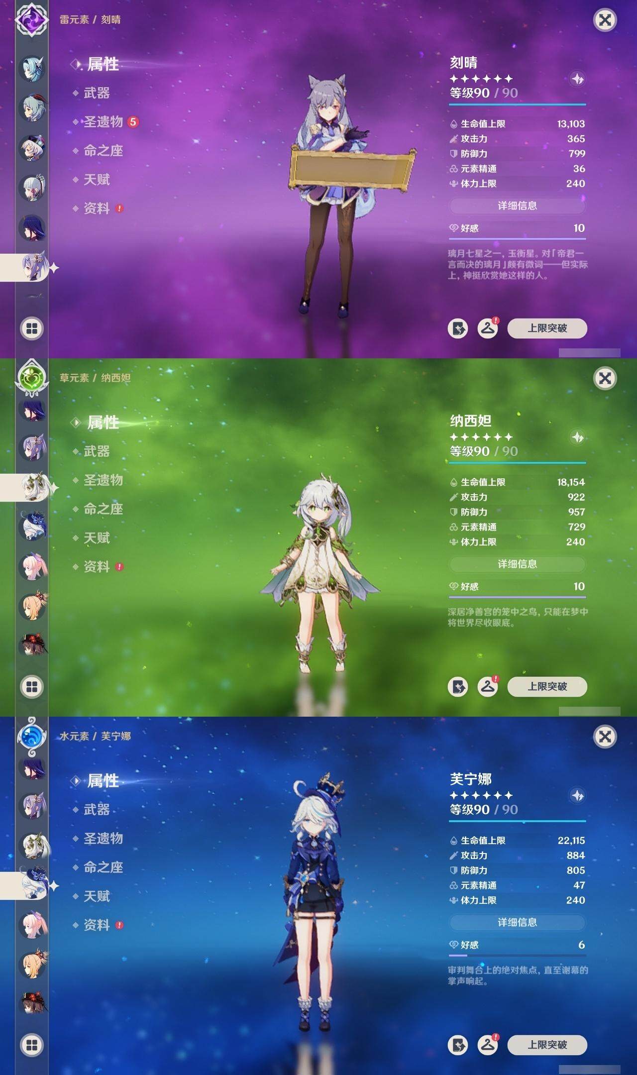 0命千织,0命芙宁娜,0命林尼,2命纳西妲,0命妮露,0命提纳里,满命夜兰,满命八重神子,3命申鹤,0命优菈,2命雷电将军,2命枫原万叶,1命神里绫华,0命钟离,1命胡桃,0命甘雨,0命宵宫,0命温迪,0命达达利亚,0命珊瑚宫心海,3命刻晴,4命七七,满命琴,4命莫娜,满命迪卢克,0命希诺宁,0命丝柯克,0命菲林斯,精1若水,精1和璞鸢,精1天空之卷,精1焚曜千阳,精1支离轮光