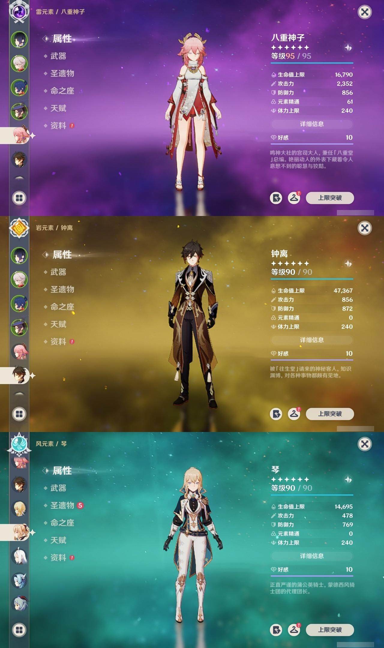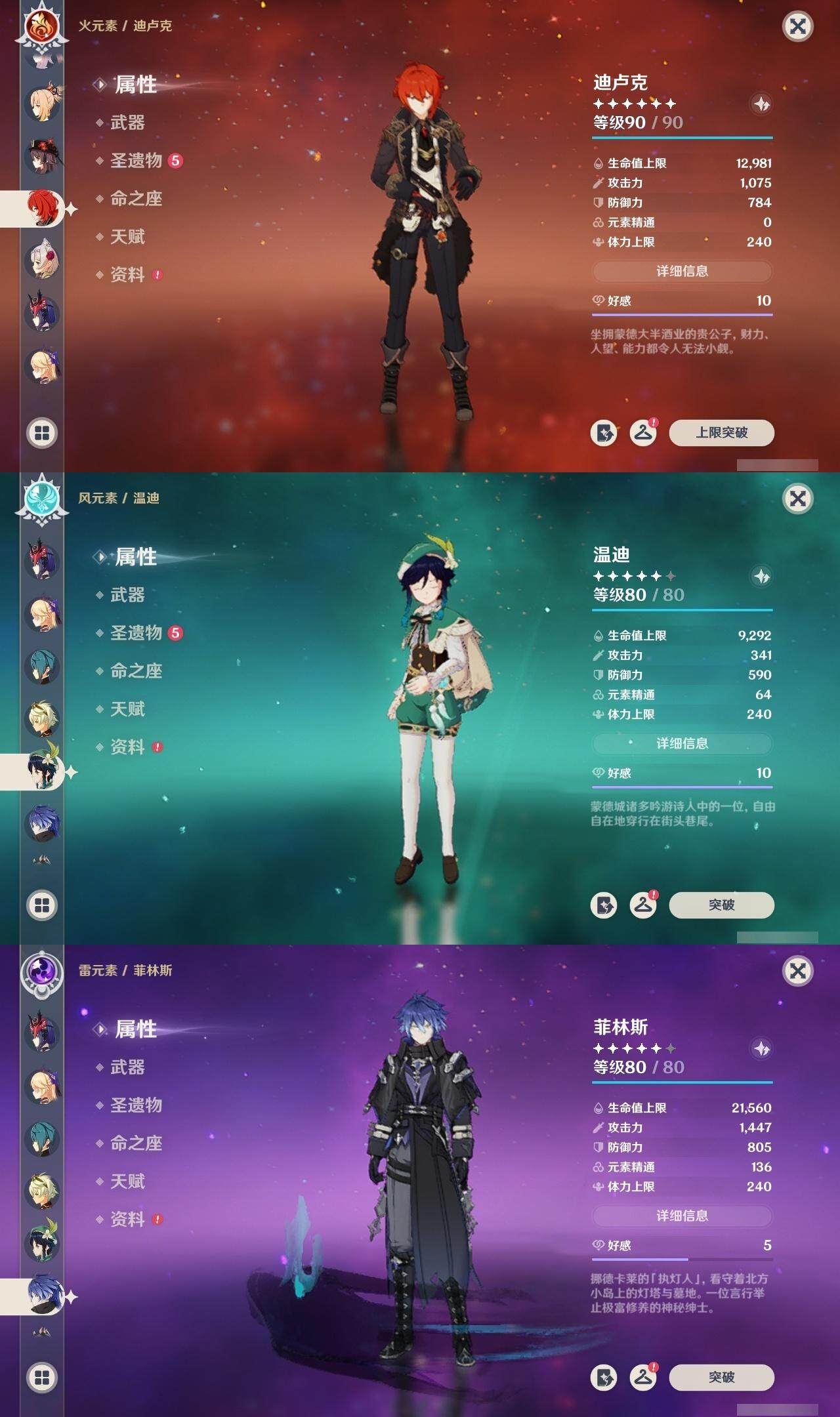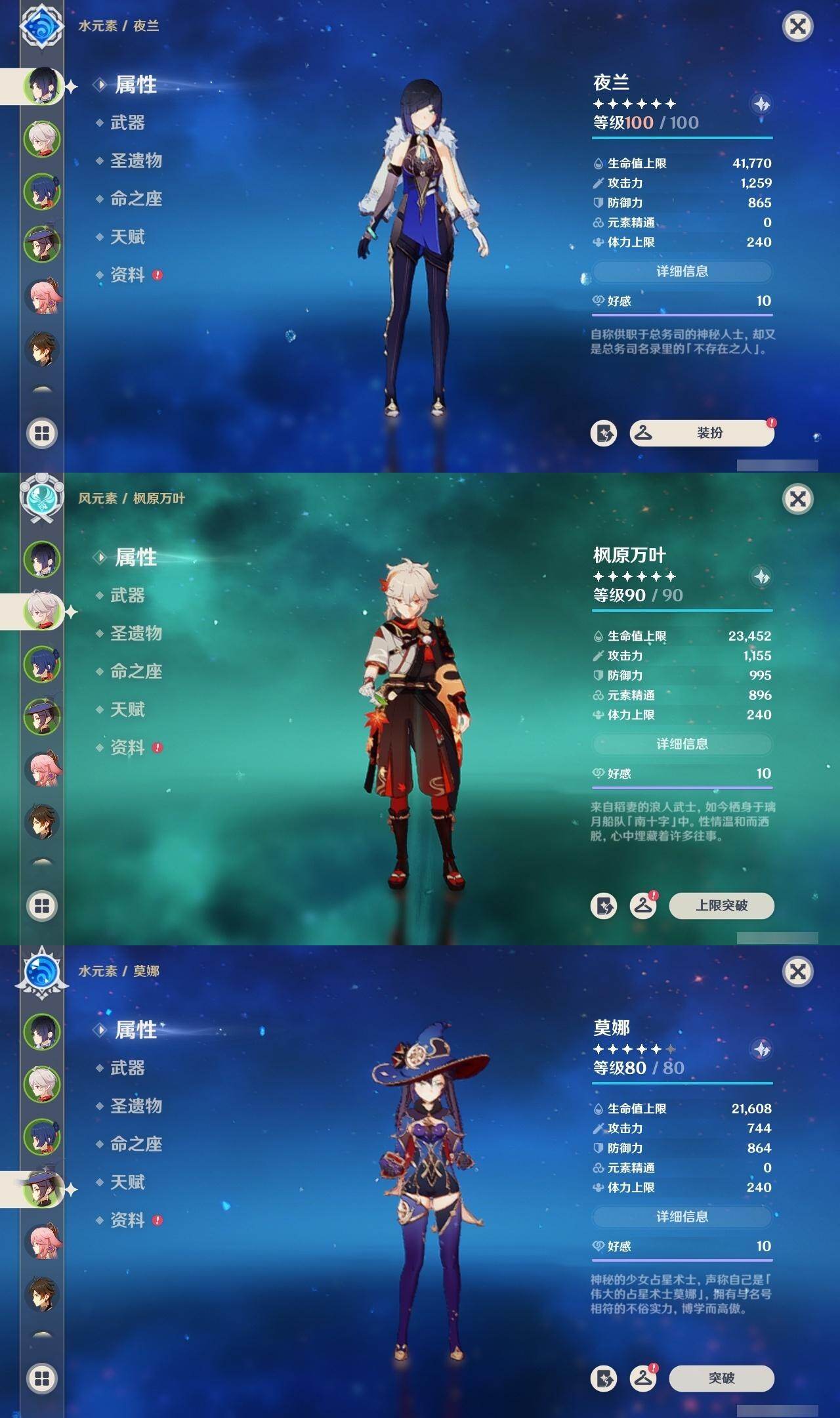 枫原万叶,莫娜,八重神子,钟离,琴,申鹤,优菈,甘雨,七七,神里凌华,雷电将军,刻晴,珊瑚宫心海,宵宫,胡桃,迪卢克,温迪,达达利亚