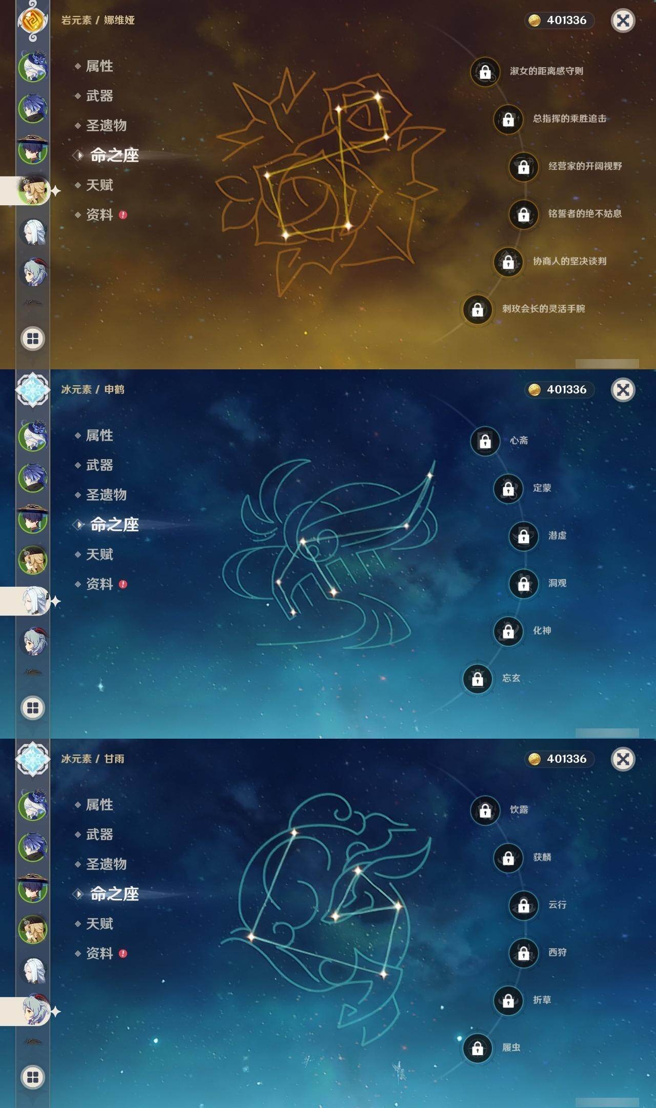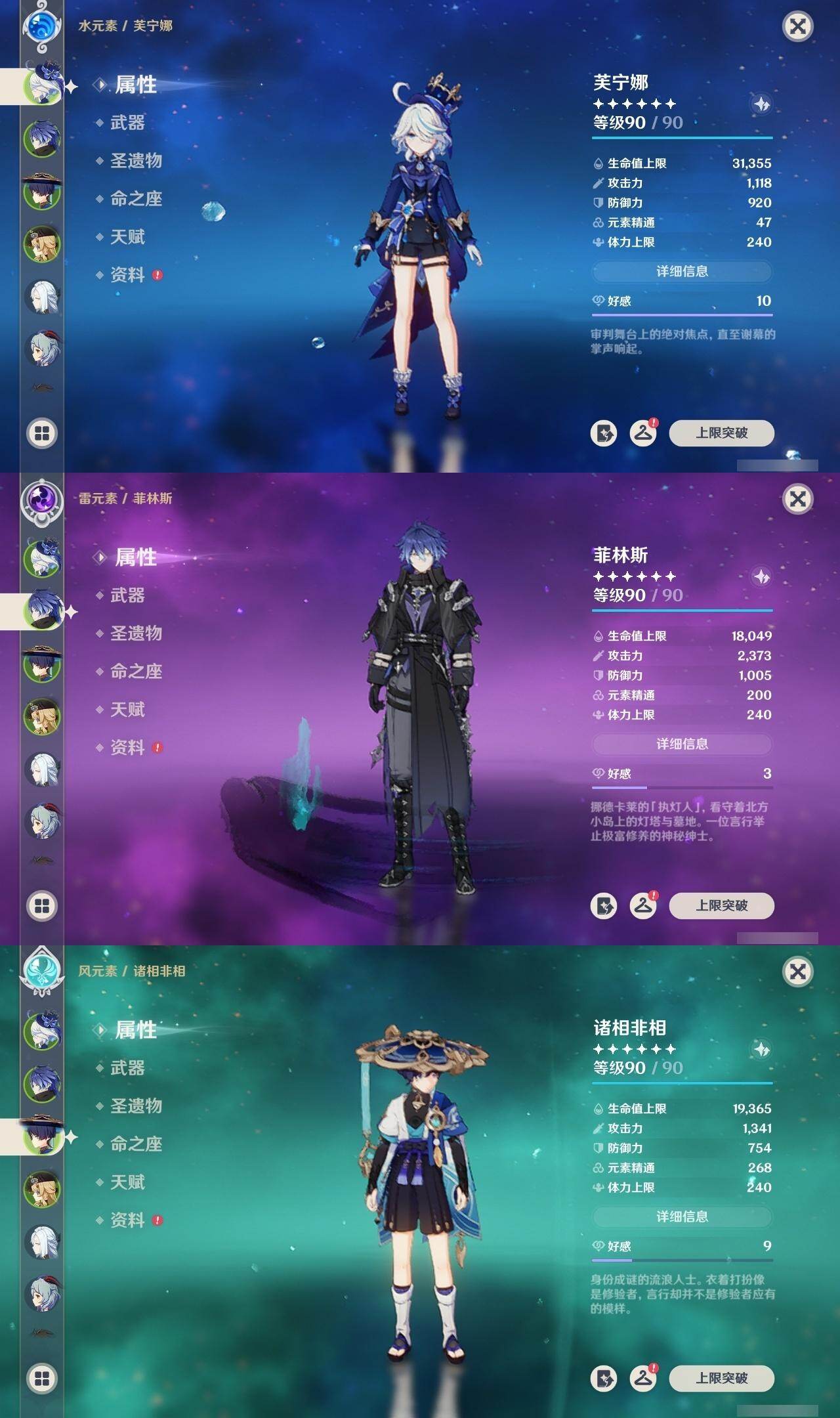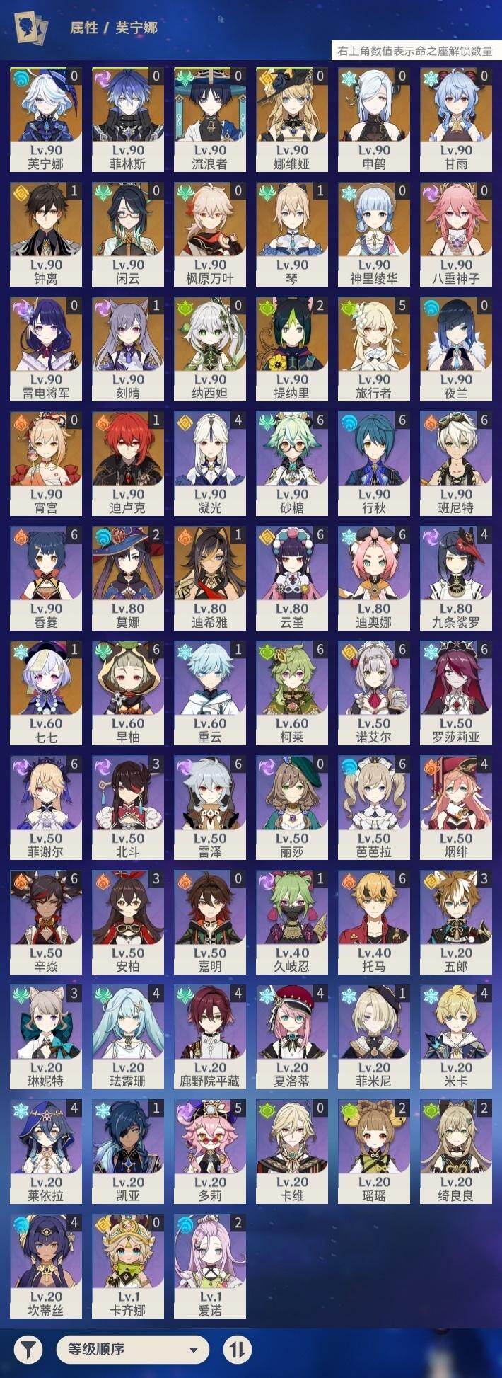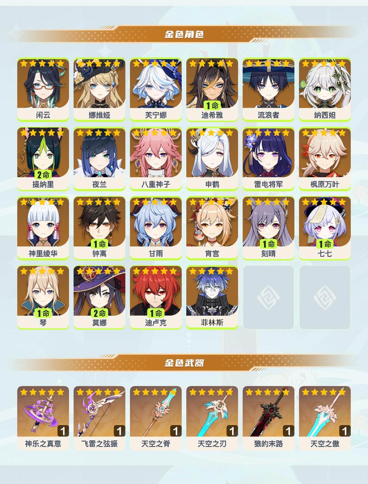 0命闲云,0命娜维娅,0命芙宁娜,1命迪希雅,0命流浪者,0命纳西妲,2命提纳里,0命夜兰,0命八重神子,0命申鹤,0命雷电将军,0命枫原万叶,0命神里绫华,1命钟离,0命甘雨,0命宵宫,1命刻晴,1命七七,1命琴,2命莫娜,1命迪卢克,0命菲林斯,精1神乐之真意,精1飞雷之弦振,精1天空之脊,精1天空之刃,精1狼的末路,精1天空之傲