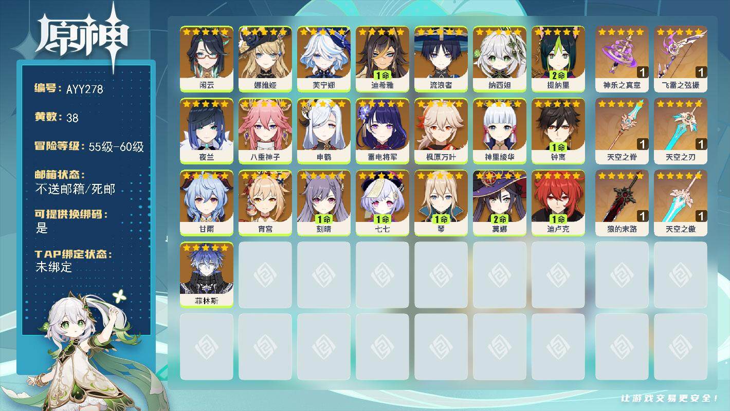 [15535698]【店主推荐捡漏号】60级/38黄/女主/22个五星角色/6个五星武器 0命闲云,0命娜维娅,0命芙宁娜,1命迪希雅,0命流浪者,0命纳西妲,2命提纳里,0命夜兰,0命八重神子,0命申鹤,0命雷电将军,0命枫原万叶,0命神里绫华,1命钟离,0命甘雨,0命宵宫,1命刻晴,1命七七,1命琴,2命莫娜,1命迪卢克,0命菲林斯,精1神乐之真意,精1飞雷之弦振,精1天空之脊,精1天空之刃,精1狼的末路,精1天空之傲