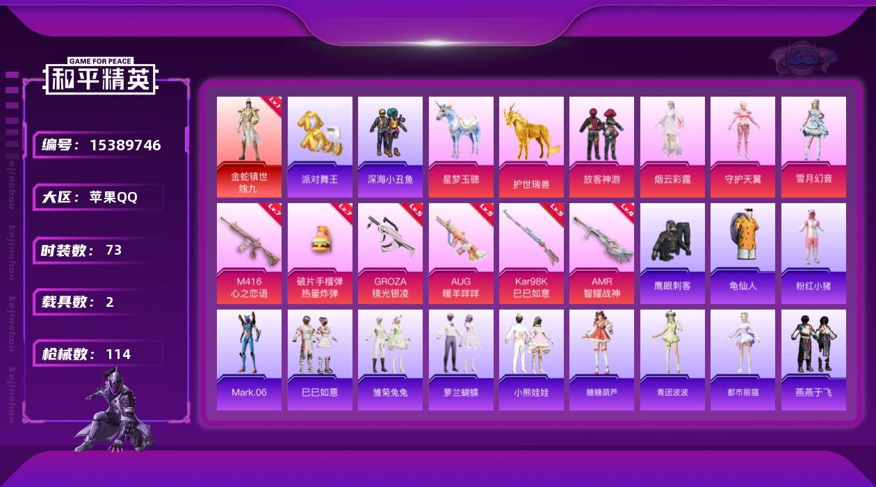 [15389746]素材身法号/地铁满天赋【特价急出/详情看图】:苹果 手Q-1神装-4粉装-6特效枪-2载具-2粉色飞行器-3.7w热力值-4王牌印记-73套装-114枪皮【红色神装等级】:金蛇镇世-烛九(一级)【热门品类】:套装-派对舞王,套装-深海小丑鱼,套装-龟仙人,套装-粉红小猪,角色-Mark.06【粉色载具】:星梦玉骢,护世瑞兽【粉色套装】:粉装-放客神游,角色-烟云彩露,角色-守护天翼,粉装-雪月幻音【粉色枪皮等级】:M416-心之恋语(七级),GROZA-镜光银凌(五级),AUG-暖羊咩咩(五级),Kar98K-巳巳如意(五级),AMR-智耀战神(四级),破片手榴弹-热量炸弹(七级)【粉色飞行器】:深渊漩涡飞行器,圣域金龙飞行器