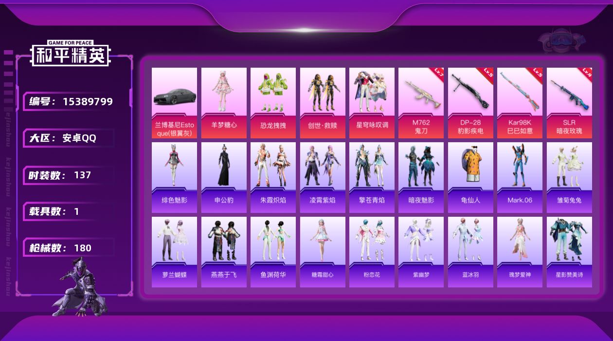 - [15153243]【店主推荐捡漏号!可直接换绑】/素材身法号/地铁满天赋 苹果 手Q-4神装-11粉装-11特效枪-3载具-7粉色飞行器-5.6w热力值-1王牌印记-78套装-154枪皮【红色神装等级】:最终圣卫者-帕修斯(一级),圣域龙灵-瑞拉(一级),墨龙九天-敖渊(一级),沙丘之主-图卡盟(二级)【热门品类】:粉装-梦幻火箭,套装-暗影哥特,角色-8号机,角色-Mark.06【粉色载具】:双人摩托-梦幻火箭,僚机-圣域龙宝,护世瑞兽【粉色套装】:粉装-甜心巧克力,粉装-宝贝奶油派,粉装-天使彩虹糖,粉装-梦幻火箭,粉装-金属狂野,粉装-绚金战神,角色-洛天依,角色-初号机 觉醒Ver.,角色-萨利娅,粉装-幻彩电音,角色-狂魅哈莉【粉色枪皮等级】:SCAR-L-金蛇镇世(三级),M416-墨龙九天(五级),M416-女娲灵识(一级),GROZA-镜光银凌(五级),AUG-暖羊咩咩(五级),Kar98K-巳巳如意(五级),Kar98K-圣域龙灵(一级),M24-镜域双华(一级),Mk14-盛世惊鸿(三级),DP-28-豹影疾电(一级),破片手榴弹-美味星星糖(七级)【粉色飞行器】:酣梦熊熊飞行器,沙丘之主天马,镜域双华-灵镜之阶,龙翔九天飞行器,凤舞九天飞行器,万象金身飞行器,圣域金龙飞行器