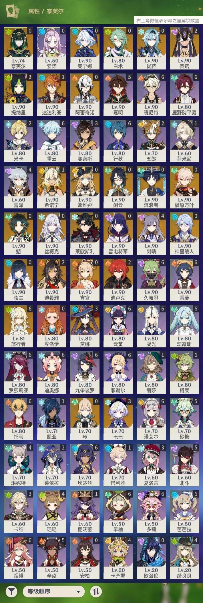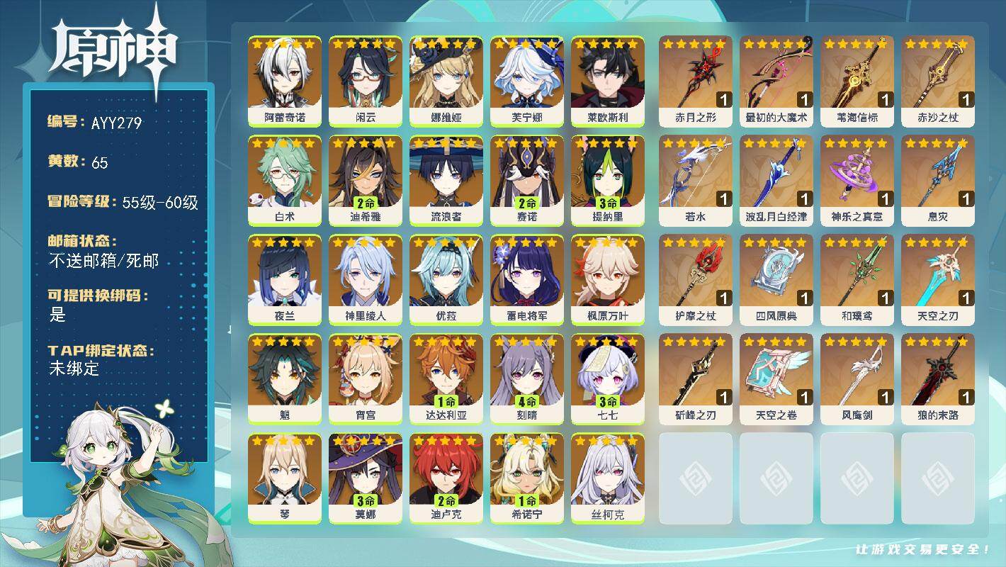 [15548487]60级/65黄/女主/26个五星角色/18个五星武器 0命阿蕾奇诺,0命闲云,0命娜维娅,0命芙宁娜,0命莱欧斯利,0命白术,2命迪希雅,0命流浪者,2命赛诺,3命提纳里,0命夜兰,0命神里绫人,0命优菈,0命雷电将军,0命枫原万叶,0命魈,0命宵宫,1命达达利亚,4命刻晴,3命七七,0命琴,3命莫娜,2命迪卢克,1命希诺宁,0命丝柯克,0命奈芙尔,精1赤月之形,精1最初的大魔术,精1苇海信标,精1赤沙之杖,精1若水,精1波乱月白经津,精1神乐之真意,精1息灾,精1护摩之杖,精1四风原典,精1和璞鸢,精1天空之刃,精1斫峰之刃,精1天空之卷,精1风鹰剑,精1狼的末路