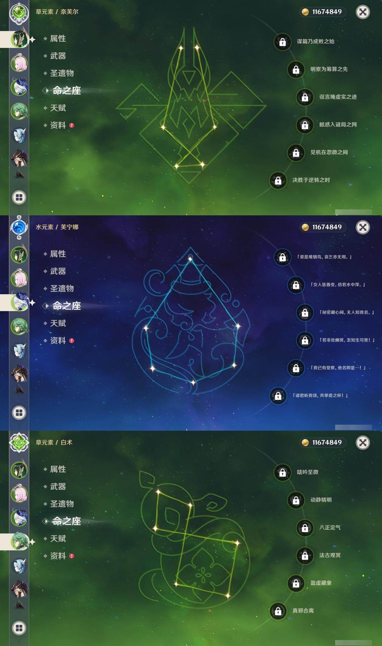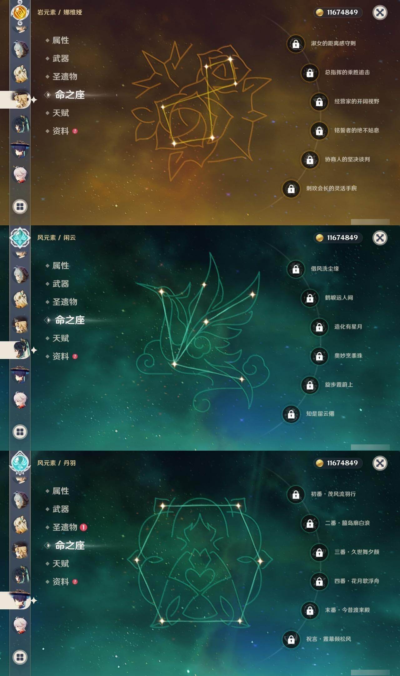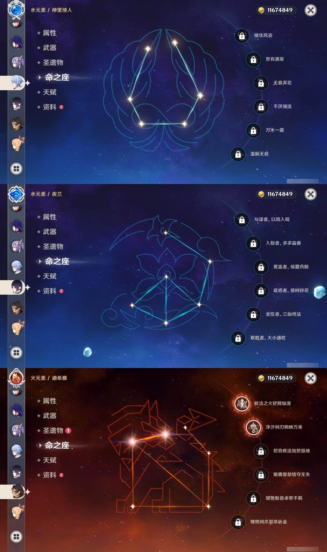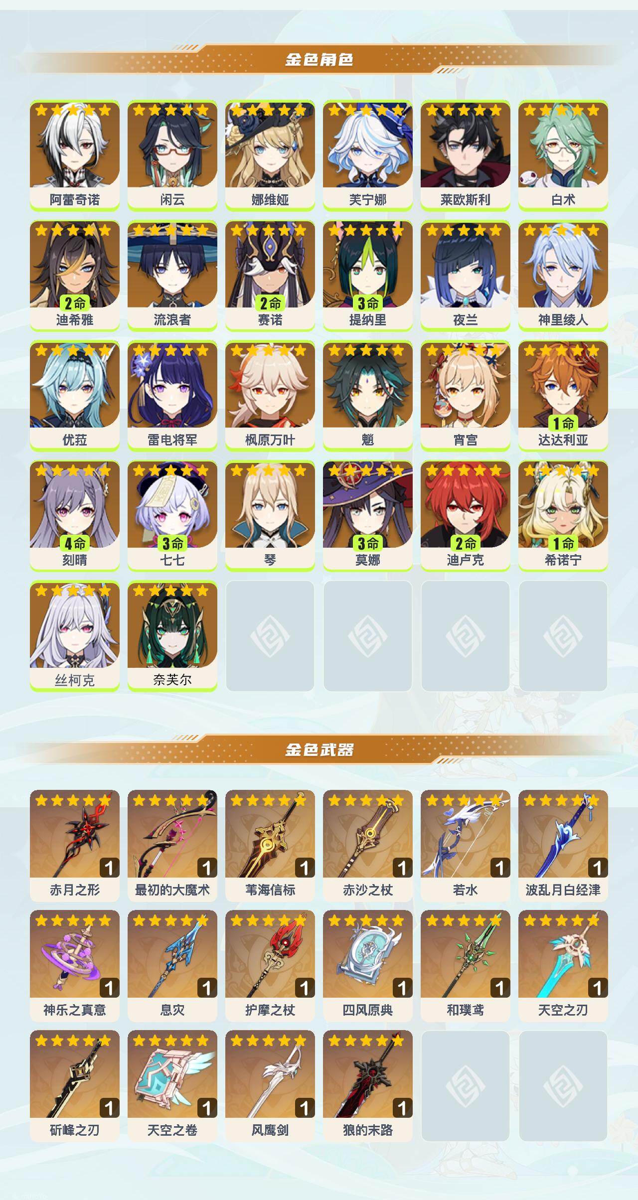 0命阿蕾奇诺,0命闲云,0命娜维娅,0命芙宁娜,0命莱欧斯利,0命白术,2命迪希雅,0命流浪者,2命赛诺,3命提纳里,0命夜兰,0命神里绫人,0命优菈,0命雷电将军,0命枫原万叶,0命魈,0命宵宫,1命达达利亚,4命刻晴,3命七七,0命琴,3命莫娜,2命迪卢克,1命希诺宁,0命丝柯克,0命奈芙尔,精1赤月之形,精1最初的大魔术,精1苇海信标,精1赤沙之杖,精1若水,精1波乱月白经津,精1神乐之真意,精1息灾,精1护摩之杖,精1四风原典,精1和璞鸢,精1天空之刃,精1斫峰之刃,精1天空之卷,精1风鹰剑,精1狼的末路