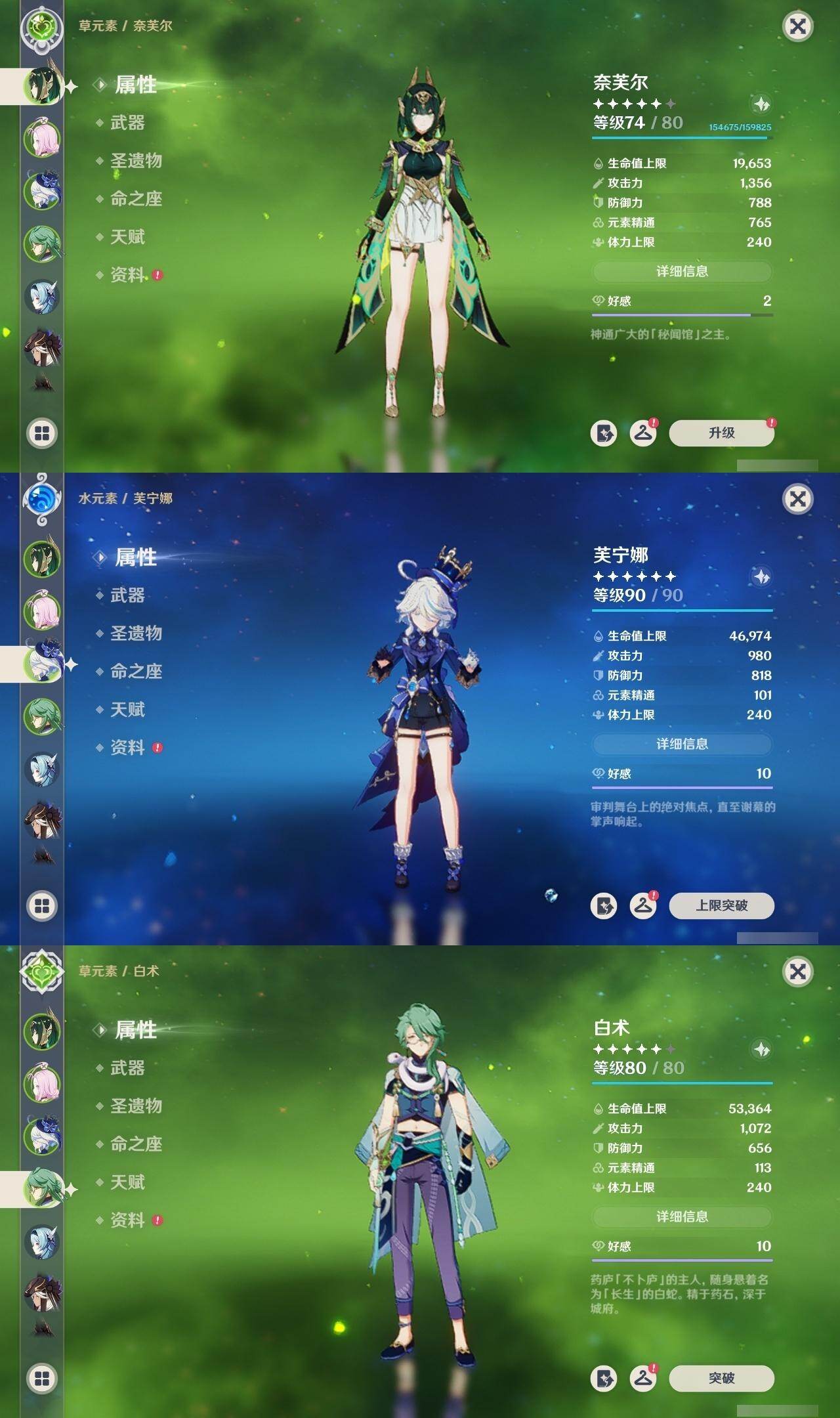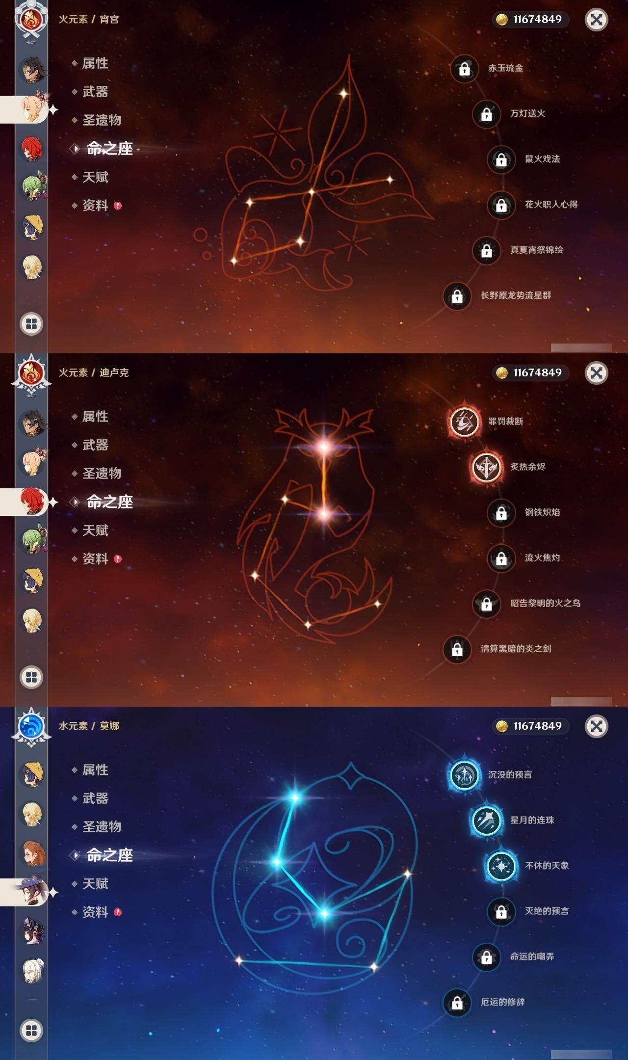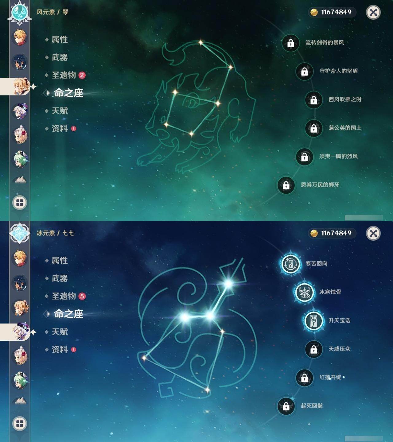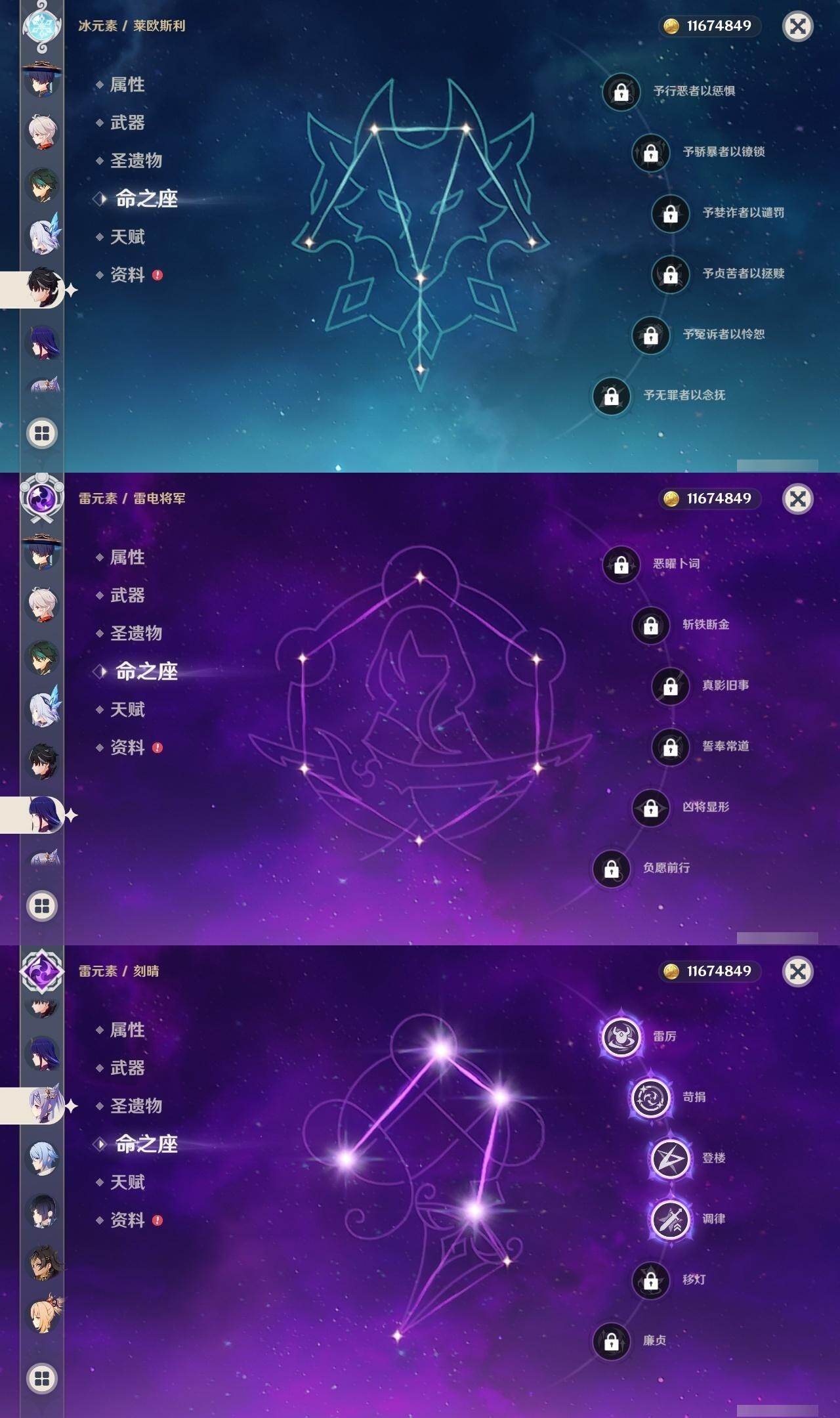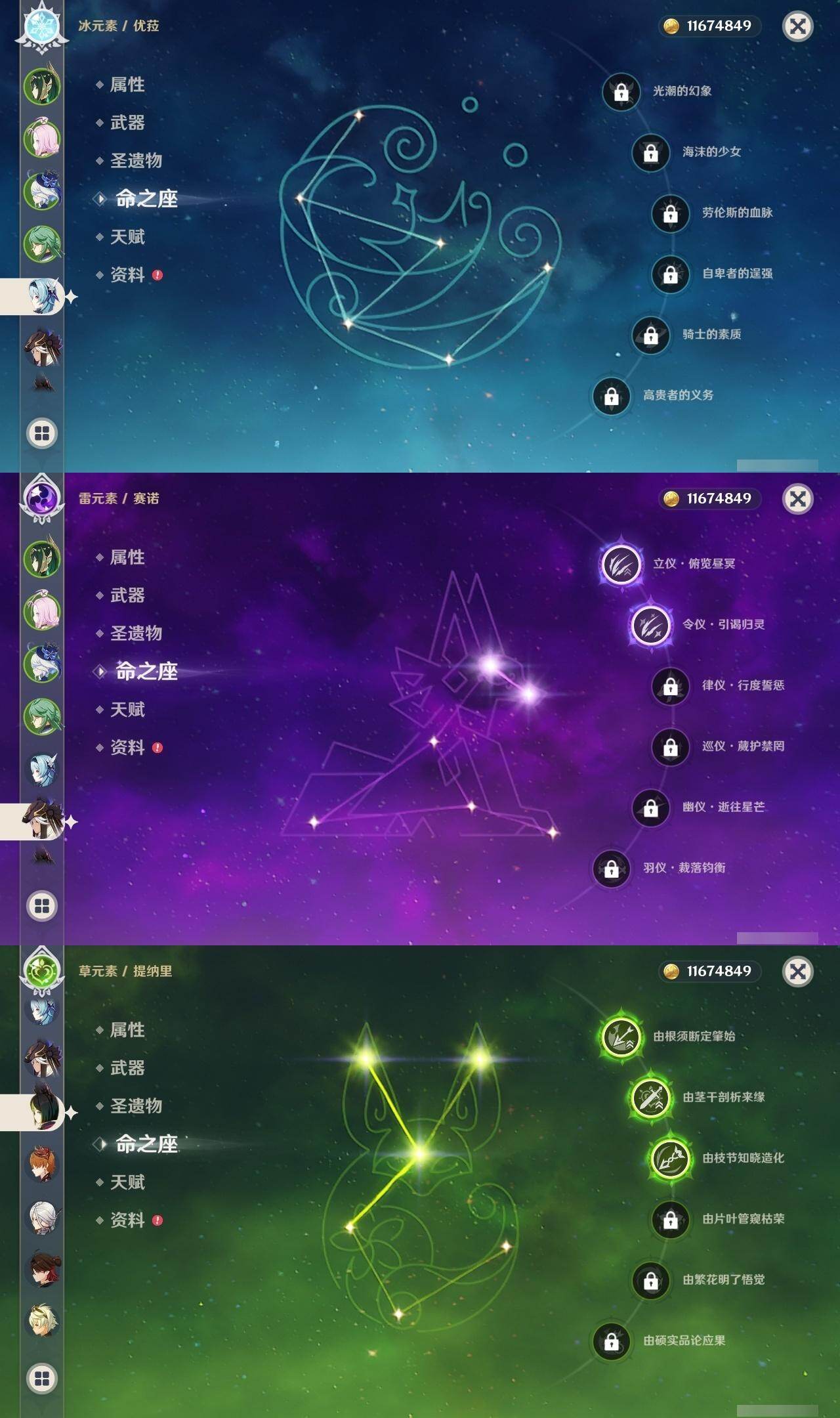 0命阿蕾奇诺,0命闲云,0命娜维娅,0命芙宁娜,0命莱欧斯利,0命白术,2命迪希雅,0命流浪者,2命赛诺,3命提纳里,0命夜兰,0命神里绫人,0命优菈,0命雷电将军,0命枫原万叶,0命魈,0命宵宫,1命达达利亚,4命刻晴,3命七七,0命琴,3命莫娜,2命迪卢克,1命希诺宁,0命丝柯克,0命奈芙尔,精1赤月之形,精1最初的大魔术,精1苇海信标,精1赤沙之杖,精1若水,精1波乱月白经津,精1神乐之真意,精1息灾,精1护摩之杖,精1四风原典,精1和璞鸢,精1天空之刃,精1斫峰之刃,精1天空之卷,精1风鹰剑,精1狼的末路