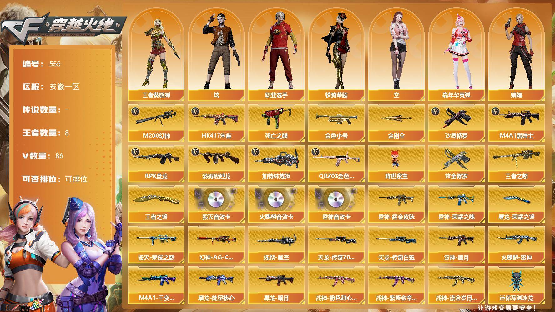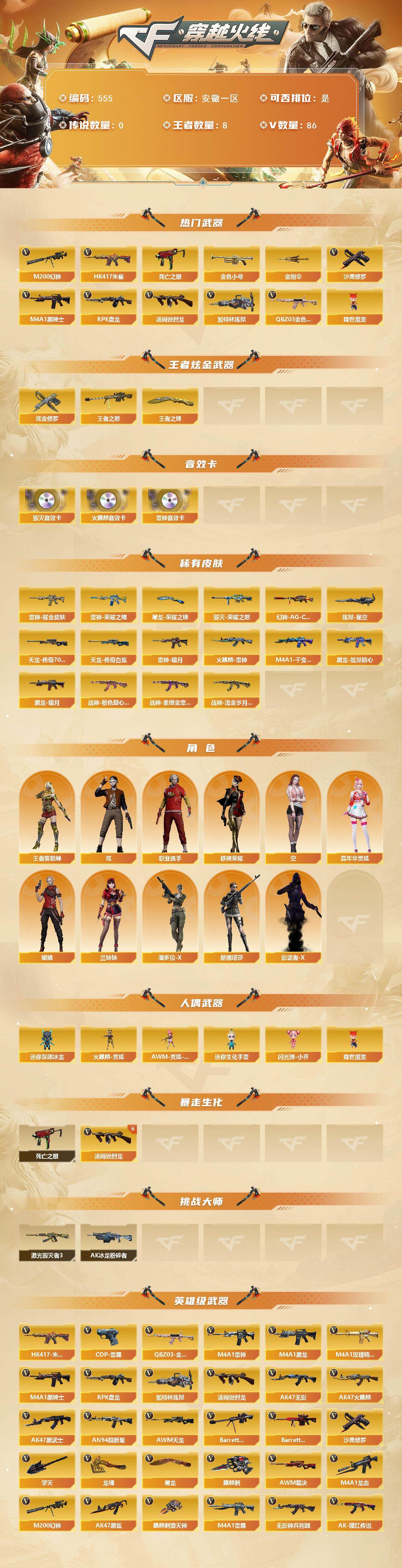 [14864834]安徽一区-86V-8王者-2炫金 【热门武器】:QBZ03-金色蔷薇*2,HK417-朱雀,M200-幻神,死亡之眼,金色小号,M4A1-黑骑士*2,汤姆逊-烈龙*6,RPK-盘龙*3,加特林-炼狱*4,降世魔童,沙鹰-修罗*5,金刚伞 【王者炫金武器】:王者之怒,王者之锋,炫金修罗*2 【音效卡】:AK47-火麒麟音效卡,M4A1-雷神音效卡,Barrett-毁灭音效卡 【皮肤】:幻神-AG-CFPLS17冠军,雷神-暗月,雷神-荣耀之魄,雷神-耀金皮肤,火麒麟-雷神,毁灭-荣耀之怒,M4A1-千变-孔明皮肤,黑龙-能量核心,黑龙-暗月,战神-粉色甜心皮肤,战神-紫绶金章皮肤,战神-流金岁月皮肤*3,AWM-天龙-传奇70KG*2,AWM-天龙-传奇白鲨,炼狱-星空,屠龙-荣耀之锋*2 【角色】:炫,王者-葵-貂蝉,空,嘉年华灵狐,娟娟,兰妹妹,潘多拉-X,铁骑荣耀,新娜塔莎,影武者-X,职业选手 【人偶武器】:火麒麟-灵狐,AWM-灵狐-15周年嘉年华,迷你深渊冰龙,迷你生化手雷,闪光弹-小乔,降世魔童 【暴走生化】:死亡之眼 【挑战大师】:AK47-冰龙粉碎者,激光毁灭者III*2 【英雄级武器】:AK47-火麒麟*2,M4A1-黑龙,M4A1-雷神*4,M4A1-黑骑士*2,AK47-无影,AK47-黑武士*4,AN94-超新星,AK47-黑鲨,M4A1-龙血,M4A1-雷霆,HK417-朱雀,无影-神兵利器,M4A1-玫瑰精灵,QBZ03-金色蔷薇*2,王者之心-觉醒版,AK-47-猩红传说,AK47-B-战神,AWM-天龙*2,Barrett-毁灭*2,Barrett-极光,AWM-裁决,M200-幻神,王者之光-觉醒版,RPK-盘龙*3,加特林-炼狱*4,汤姆逊-烈龙*6,沙鹰-修罗*5,COP-雷霆,屠龙*2,龙啸*4,麒麟刺-堕天神,擎天,麒麟刺,擎天-CF网剧冠军,王者之击-觉醒版,高爆手雷-雷霆*6,高爆手雷-堕天神,闪光弹-雷霆*6,闪光弹-堕天神,烟雾弹-雷霆*6,烟雾弹-堕天神,烟雾弹-雷霆王者-觉醒版 【道具】:R.LGD炫彩背包,炫彩背包,超级背包,妩媚妖姬,变异宝贝,生化弹匣,夺命之镰,防化服,枪王排位28赛季金色流光,C4-沙漠,防弹头盔*2,防弹衣*2,C4工具钳,手雷包 【特殊枪械】:2黑骑士,6烈龙,3盘龙,4炼狱