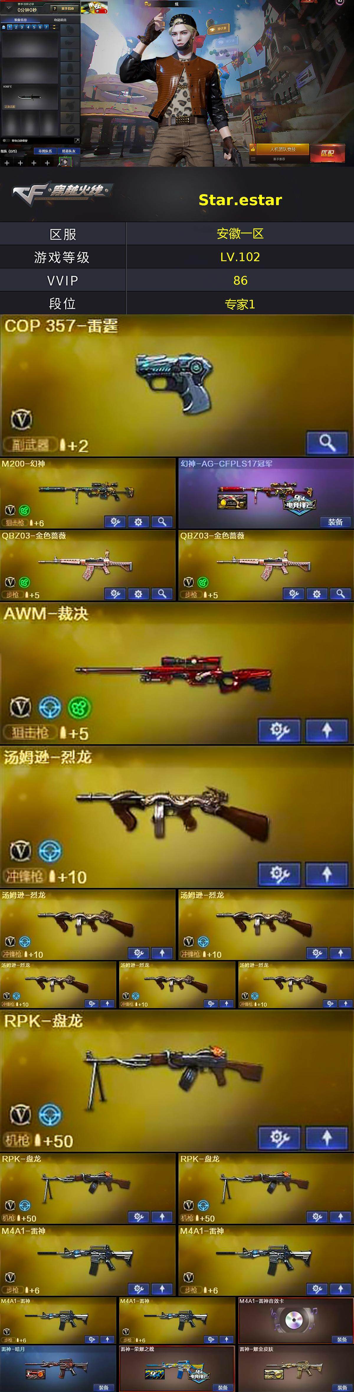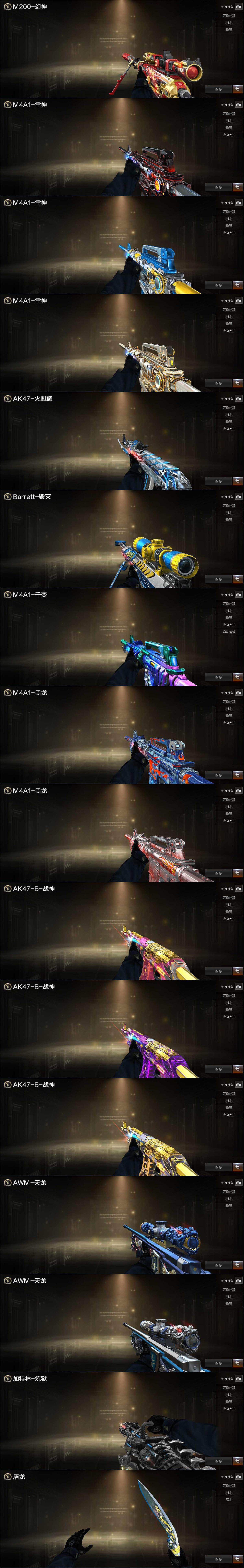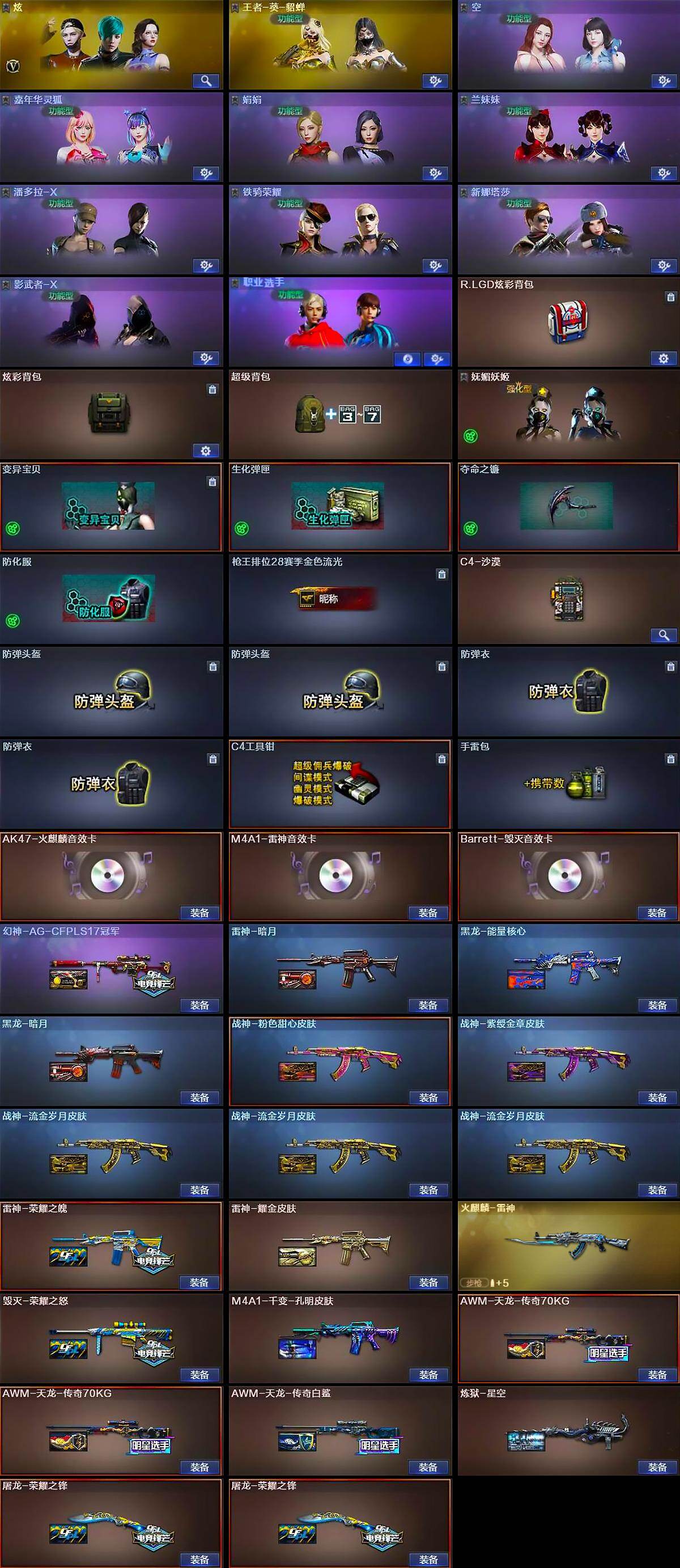 【皮肤】:幻神-AG-CFPLS17冠军,雷神-暗月,雷神-荣耀之魄,雷神-耀金皮肤,火麒麟-雷神,毁灭-荣耀之怒,M4A1-千变-孔明皮肤,黑龙-能量核心,黑龙-暗月,战神-粉色甜心皮肤,战神-紫绶金章皮肤,战神-流金岁月皮肤*3,AWM-天龙-传奇70KG*2,AWM-天龙-传奇白鲨,炼狱-星空,屠龙-荣耀之锋*2