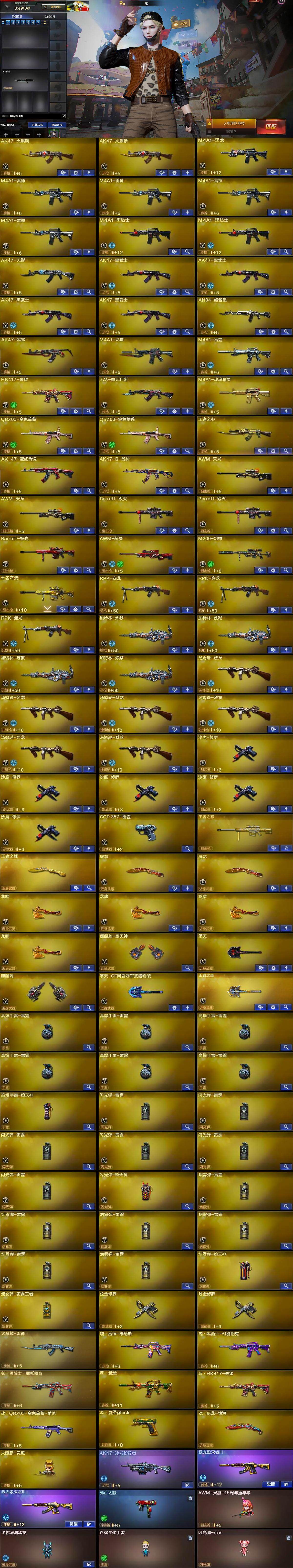 【英雄级武器】:AK47-火麒麟*2,M4A1-黑龙,M4A1-雷神*4,M4A1-黑骑士*2,AK47-无影,AK47-黑武士*4,AN94-超新星,AK47-黑鲨,M4A1-龙血,M4A1-雷霆,HK417-朱雀,无影-神兵利器,M4A1-玫瑰精灵,QBZ03-金色蔷薇*2,王者之心-觉醒版,AK-47-猩红传说,AK47-B-战神,AWM-天龙*2,Barrett-毁灭*2,Barrett-极光,AWM-裁决,M200-幻神,王者之光-觉醒版,RPK-盘龙*3,加特林-炼狱*4,汤姆逊-烈龙*6,沙鹰-修罗*5,COP-雷霆,屠龙*2,龙啸*4,麒麟刺-堕天神,擎天,麒麟刺,擎天-CF网剧冠军,王者之击-觉醒版,高爆手雷-雷霆*6,高爆手雷-堕天神,闪光弹-雷霆*6,闪光弹-堕天神,烟雾弹-雷霆*6,烟雾弹-堕天神,烟雾弹-雷霆王者-觉醒版