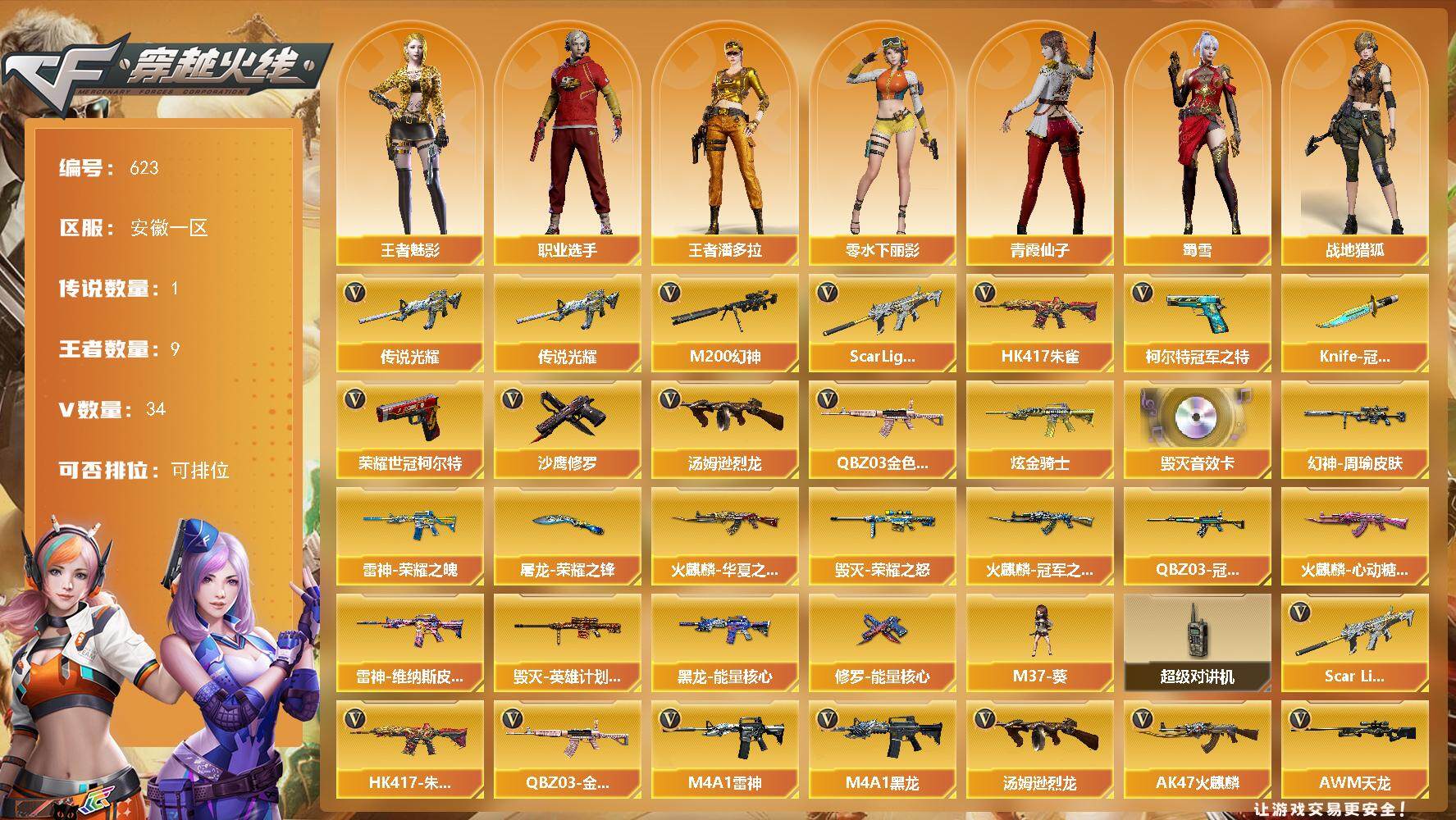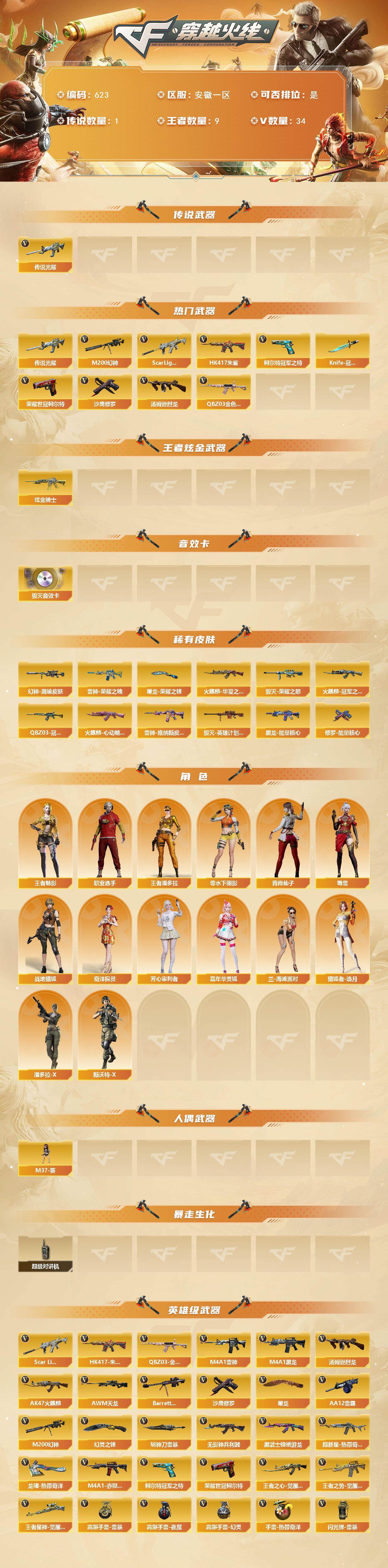 [15182401]安徽一区-34V-9王者-1炫金 【传说武器】:传说光耀 【热门武器】:传说光耀,QBZ03-金色蔷薇,Scar Light-白虎,HK417-朱雀,M200-幻神,柯尔特-冠军之特,荣耀世冠-柯尔特,汤姆逊-烈龙,沙鹰-修罗*2,Knife-冠军之刃 【王者炫金武器】:炫金骑士 【音效卡】:Barrett-毁灭音效卡 【皮肤】:幻神-周瑜皮肤,QBZ03-冠军之薇,雷神-荣耀之魄,雷神-维纳斯皮肤,火麒麟-冠军之心,火麒麟-华夏之心,火麒麟-心动糖果,毁灭-荣耀之怒,毁灭-英雄计划 皮肤,黑龙-能量核心,修罗-能量核心,屠龙-荣耀之锋 【角色】:战地猎狐,王者-魅影,王者潘多拉,奇洋探员,芳心审判者,嘉年华灵狐,兰-海滩派对,猎狐者-追月,零-水下丽影,潘多拉-X,青霞仙子,斯沃特-X,蜀雪,职业选手 【人偶武器】:M37-葵 【暴走生化】:超级对讲机 【英雄级武器】:AK47-火麒麟,M4A1-黑龙,M4A1-雷神,HK417-朱雀,Scar Light-白虎,无影-神兵利器,黑武士-锦绣游龙,超新星-热带奇洋,QBZ03-金色蔷薇,王者之心-觉醒版,王者之势-觉醒版,AWM-天龙,Barrett-毁灭,M200-幻神,王者星神-觉醒版,汤姆逊-烈龙,AA-12-雷霆,沙鹰-修罗*2,柯尔特-冠军之特,荣耀世冠-柯尔特,屠龙*2,幻灵之锋,龙啸-热带奇洋,斩神刀-雷暴,高爆手雷-雷暴,高爆手雷-夜魔,高爆手雷-幻灵,手雷-热带奇洋,闪光弹-雷暴,闪光弹-夜魔,闪光弹-幻灵,闪光弹-雷霆王者-觉醒版*2,烟雾弹-雷暴,烟雾弹-夜魔,烟雾弹-幻灵,烟雾弹-雷霆王者-觉醒版,烟雾弹-荣耀世冠EP,M4A1-赤狱骑士 【道具】:CFS限定背包,EP战队炫彩背包,炫彩背包,热带奇洋炫彩背包,超级背包,哔哩哔哩名片,女皇终结者-魔龙之吻,救世主-黑桃战神,绿色巨人,灵魂忍者,迷雾幽灵,生化弹匣,夺命之镰,防化服*2,金色流光-枪王排位*2,星辰流光-枪王排位,巅峰赛先锋-金色流光,枪王排位28赛季金色流光,枪王排位29赛季金色流光,热带奇洋表情,EP战队击杀图标,C4-黑曜,C4-沙漠,C4-再燃火线,防弹头盔*2,防弹衣*2,C4工具钳*2,手雷包*2 【特殊枪械】:1白虎,1烈龙