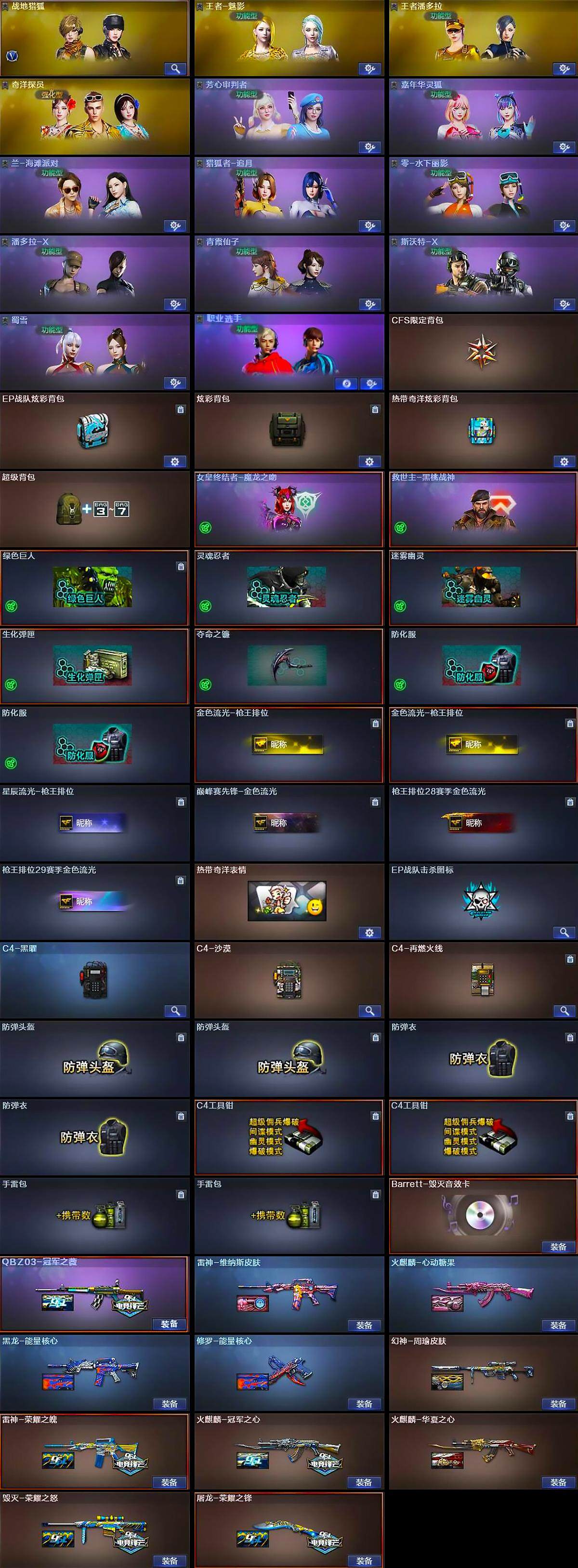 【道具】:CFS限定背包,EP战队炫彩背包,炫彩背包,热带奇洋炫彩背包,超级背包,哔哩哔哩名片,女皇终结者-魔龙之吻,救世主-黑桃战神,绿色巨人,灵魂忍者,迷雾幽灵,生化弹匣,夺命之镰,防化服*2,金色流光-枪王排位*2,星辰流光-枪王排位,巅峰赛先锋-金色流光,枪王排位28赛季金色流光,枪王排位29赛季金色流光,热带奇洋表情,EP战队击杀图标,C4-黑曜,C4-沙漠,C4-再燃火线,防弹头盔*2,防弹衣*2,C4工具钳*2,手雷包*2