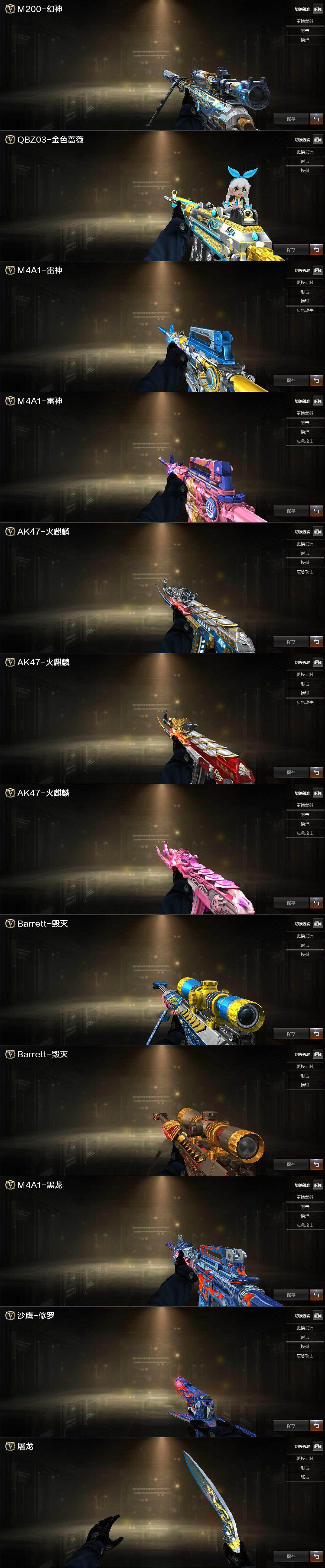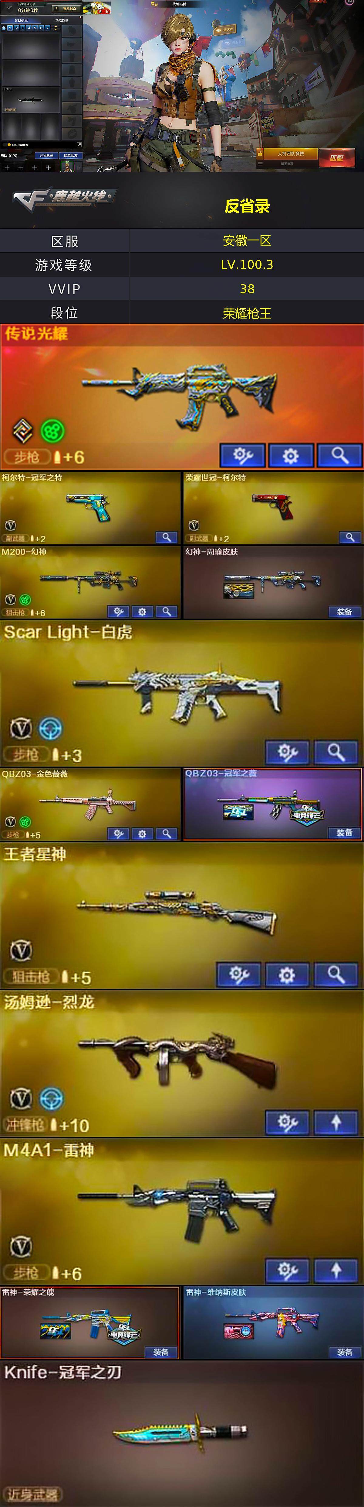 【热门武器】:传说光耀,QBZ03-金色蔷薇,Scar Light-白虎,HK417-朱雀,M200-幻神,柯尔特-冠军之特,荣耀世冠-柯尔特,汤姆逊-烈龙,沙鹰-修罗*2,Knife-冠军之刃