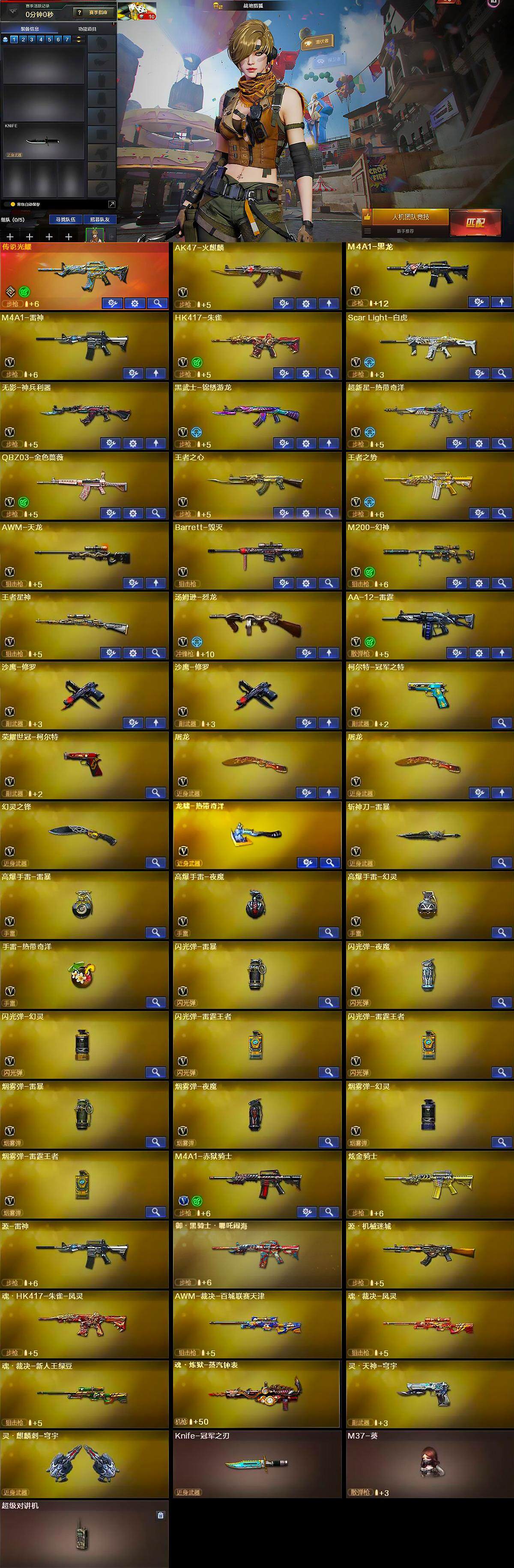 【英雄级武器】:AK47-火麒麟,M4A1-黑龙,M4A1-雷神,HK417-朱雀,Scar Light-白虎,无影-神兵利器,黑武士-锦绣游龙,超新星-热带奇洋,QBZ03-金色蔷薇,王者之心-觉醒版,王者之势-觉醒版,AWM-天龙,Barrett-毁灭,M200-幻神,王者星神-觉醒版,汤姆逊-烈龙,AA-12-雷霆,沙鹰-修罗*2,柯尔特-冠军之特,荣耀世冠-柯尔特,屠龙*2,幻灵之锋,龙啸-热带奇洋,斩神刀-雷暴,高爆手雷-雷暴,高爆手雷-夜魔,高爆手雷-幻灵,手雷-热带奇洋,闪光弹-雷暴,闪光弹-夜魔,闪光弹-幻灵,闪光弹-雷霆王者-觉醒版*2,烟雾弹-雷暴,烟雾弹-夜魔,烟雾弹-幻灵,烟雾弹-雷霆王者-觉醒版,烟雾弹-荣耀世冠EP,M4A1-赤狱骑士