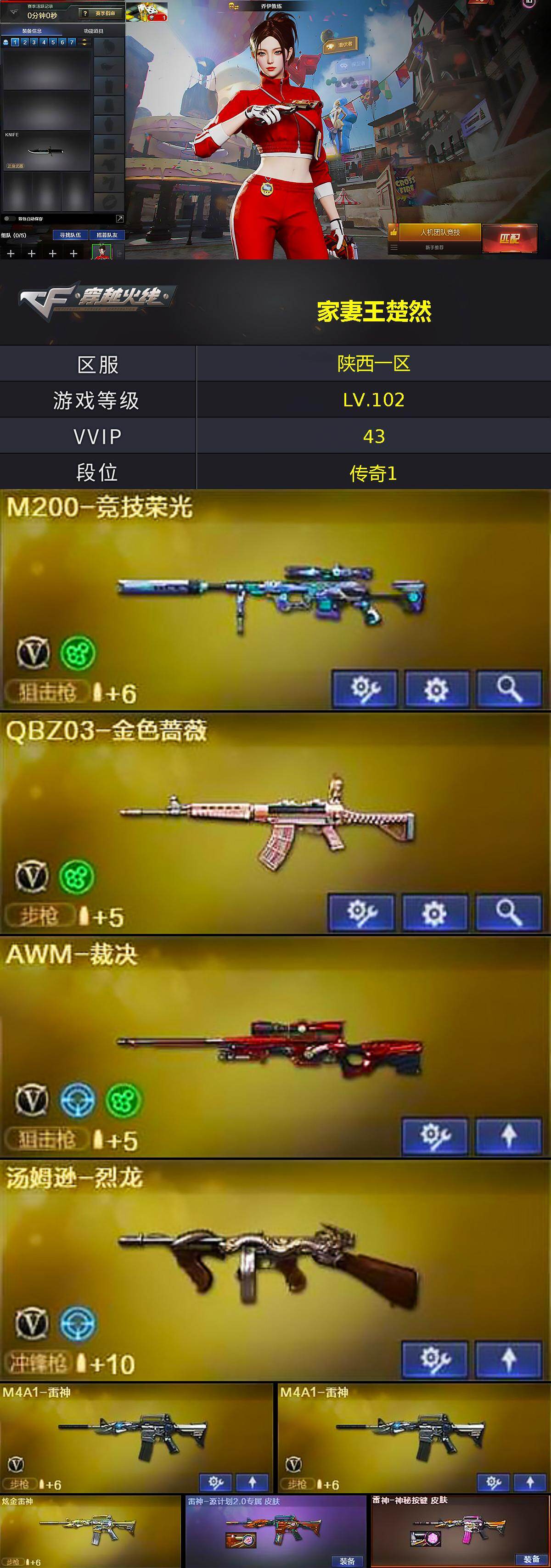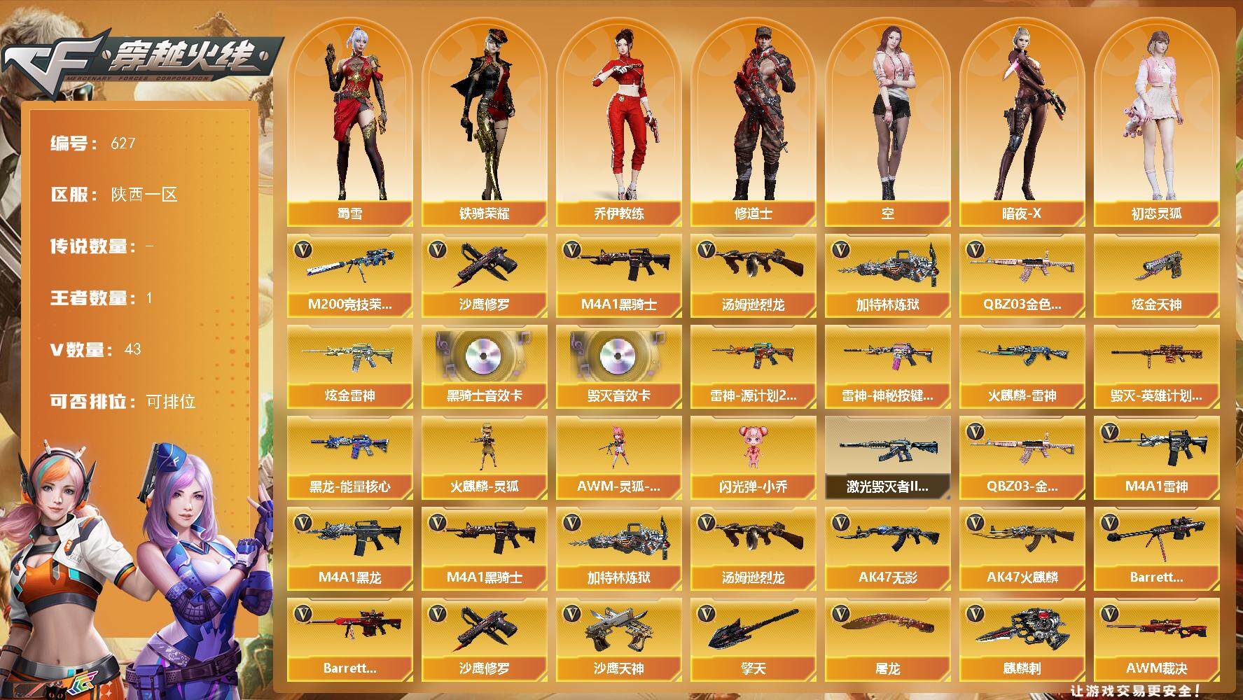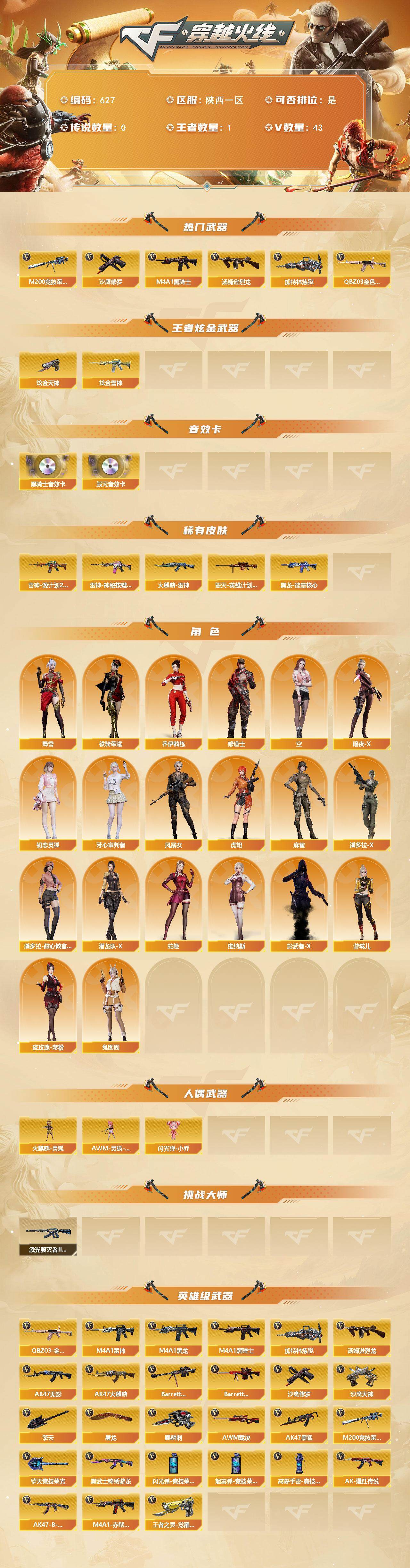 [15204704]陕西一区-43V-1王者-3炫金 【热门武器】:QBZ03-金色蔷薇,M200-竞技荣光,M4A1-黑骑士,汤姆逊-烈龙,加特林-炼狱,沙鹰-修罗 【王者炫金武器】:炫金雷神,炫金天神*2 【音效卡】:M4A1-黑骑士音效卡,Barrett-毁灭音效卡 【皮肤】:雷神-源计划2.0专属 皮肤,雷神-神秘按键 皮肤,火麒麟-雷神,毁灭-英雄计划 皮肤,黑龙-能量核心 【角色】:乔伊教练,修道士,空,暗夜-X,初恋灵狐,芳心审判者,风暴女,虎妞,麻雀,潘多拉-X,潘多拉-甜心教官,潜龙队-X,蛇姬,蜀雪,铁骑荣耀,兔囡囡,维纳斯,夜玫瑰-宠粉,影武者-X,游珑儿 【人偶武器】:火麒麟-灵狐,AWM-灵狐-15周年嘉年华,闪光弹-小乔 【挑战大师】:激光毁灭者III-白马银枪 【英雄级武器】:AK47-火麒麟,M4A1-黑龙,M4A1-雷神*2,M4A1-黑骑士,AK47-无影,AK47-黑鲨*2,黑武士-锦绣游龙,QBZ03-金色蔷薇,AK-47-猩红传说*8,AK47-B-战神,Barrett-毁灭,Barrett-极光,AWM-裁决,M200-竞技荣光,加特林-炼狱,汤姆逊-烈龙,沙鹰-修罗,沙鹰-天神*3,王者之灵-觉醒版,屠龙,擎天,麒麟刺,擎天-竞技荣光,高爆手雷-竞技荣光*2,闪光弹-竞技荣光*3,烟雾弹-竞技荣光*4,M4A1-赤狱骑士 【道具】:亚洲杯纪念炫彩背包,炫彩背包,超级背包,女皇终结者-魔龙之吻,救世主-黑桃战神,绿色巨人,灵魂忍者,迷雾幽灵*2,生化弹匣,夺命之镰*2,防化服*4,枪王排位28赛季金色流光,枪王排位29赛季金色流光,防弹头盔*4,防弹衣*4,C4工具钳*4,手雷包*5 【特殊枪械】:1黑骑士,1烈龙,1炼狱