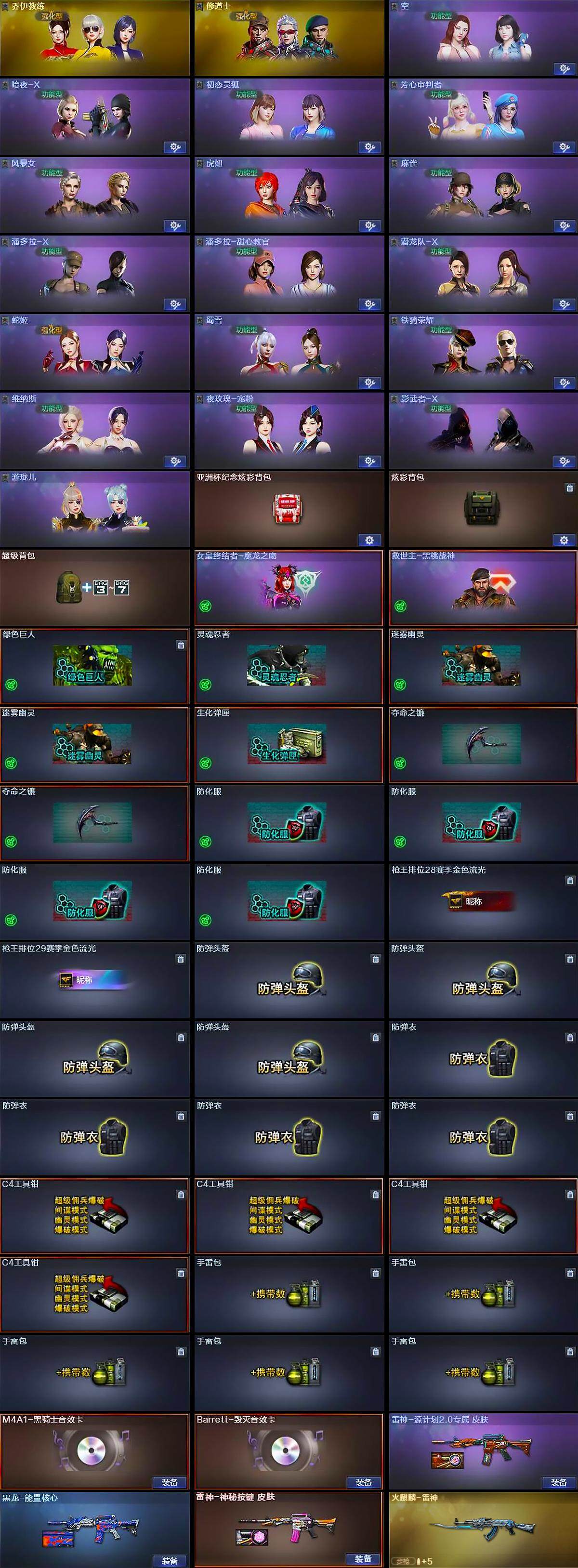 【道具】:亚洲杯纪念炫彩背包,炫彩背包,超级背包,女皇终结者-魔龙之吻,救世主-黑桃战神,绿色巨人,灵魂忍者,迷雾幽灵*2,生化弹匣,夺命之镰*2,防化服*4,枪王排位28赛季金色流光,枪王排位29赛季金色流光,防弹头盔*4,防弹衣*4,C4工具钳*4,手雷包*5