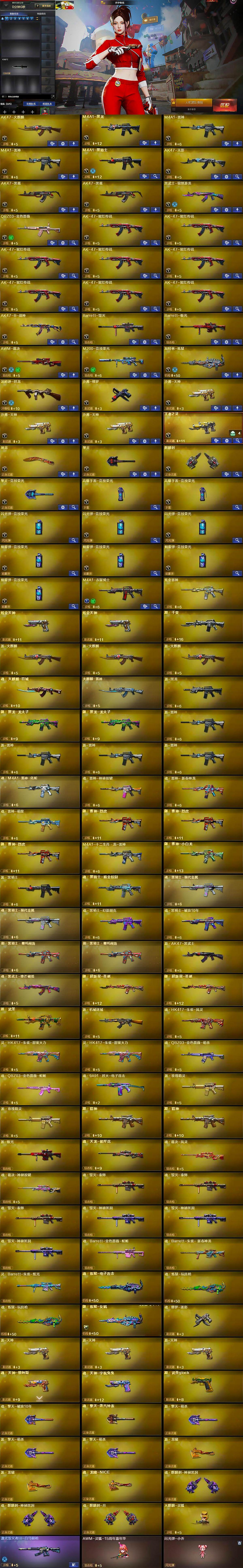 【英雄级武器】:AK47-火麒麟,M4A1-黑龙,M4A1-雷神*2,M4A1-黑骑士,AK47-无影,AK47-黑鲨*2,黑武士-锦绣游龙,QBZ03-金色蔷薇,AK-47-猩红传说*8,AK47-B-战神,Barrett-毁灭,Barrett-极光,AWM-裁决,M200-竞技荣光,加特林-炼狱,汤姆逊-烈龙,沙鹰-修罗,沙鹰-天神*3,王者之灵-觉醒版,屠龙,擎天,麒麟刺,擎天-竞技荣光,高爆手雷-竞技荣光*2,闪光弹-竞技荣光*3,烟雾弹-竞技荣光*4,M4A1-赤狱骑士