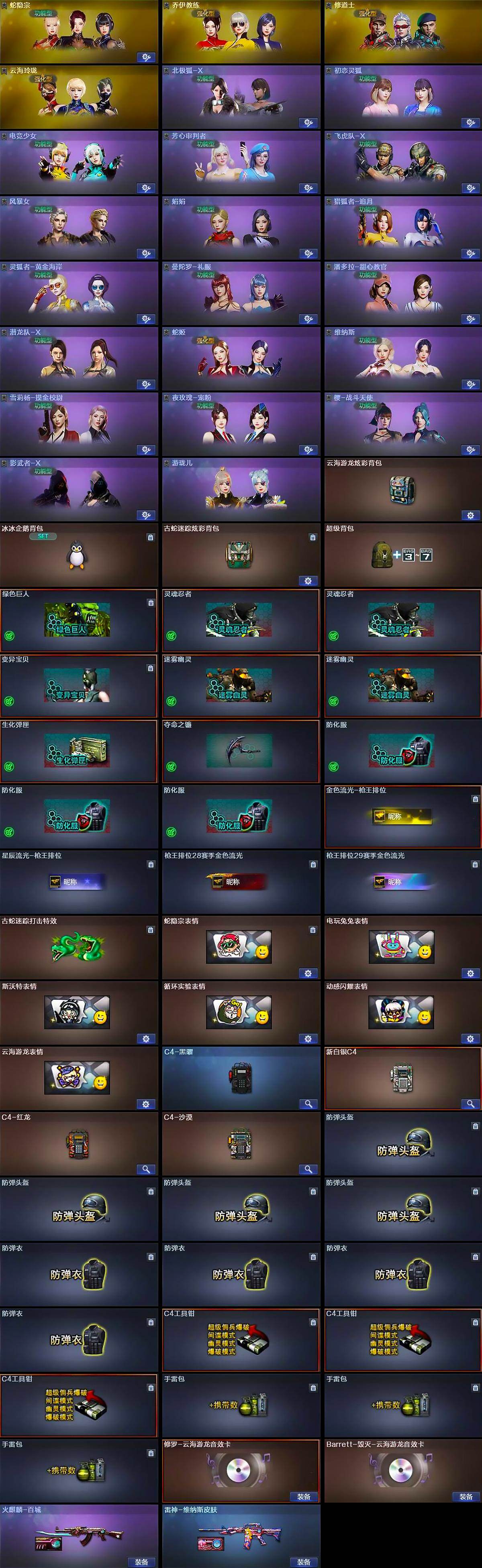 【道具】:云海游龙炫彩背包,冰冰企鹅背包,古蛇迷踪炫彩背包,超级背包,绿色巨人,灵魂忍者*2,变异宝贝,迷雾幽灵*2,生化弹匣,夺命之镰,防化服*3,金色流光-枪王排位,星辰流光-枪王排位,枪王排位28赛季金色流光,枪王排位29赛季金色流光,古蛇迷踪打击特效,蛇隐宗表情,电玩兔兔表情,斯沃特表情,循环实验表情,动感闪耀表情,云海游龙表情,C4-黑曜,新白银C4,C4-红龙,C4-沙漠,防弹头盔*4,防弹衣*4,C4工具钳*3,手雷包*3