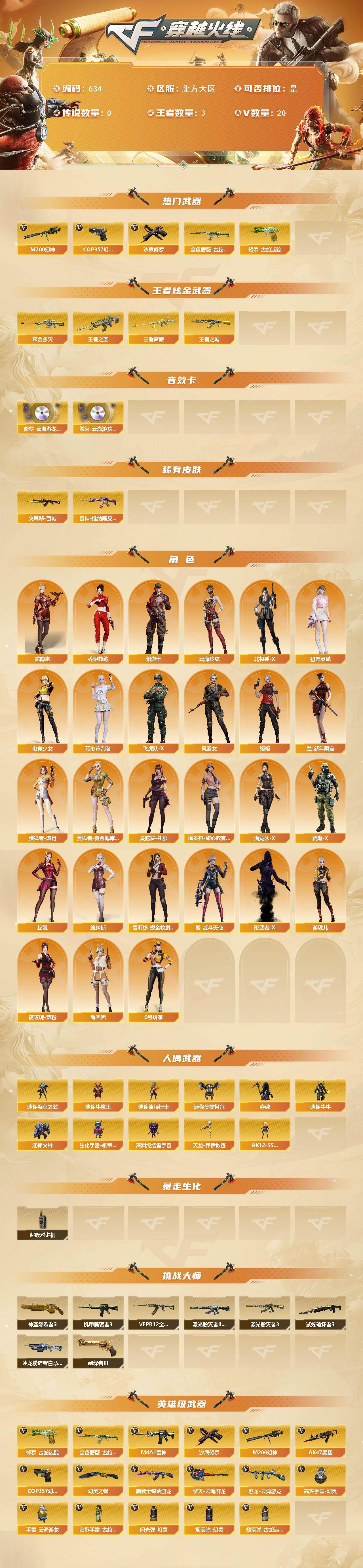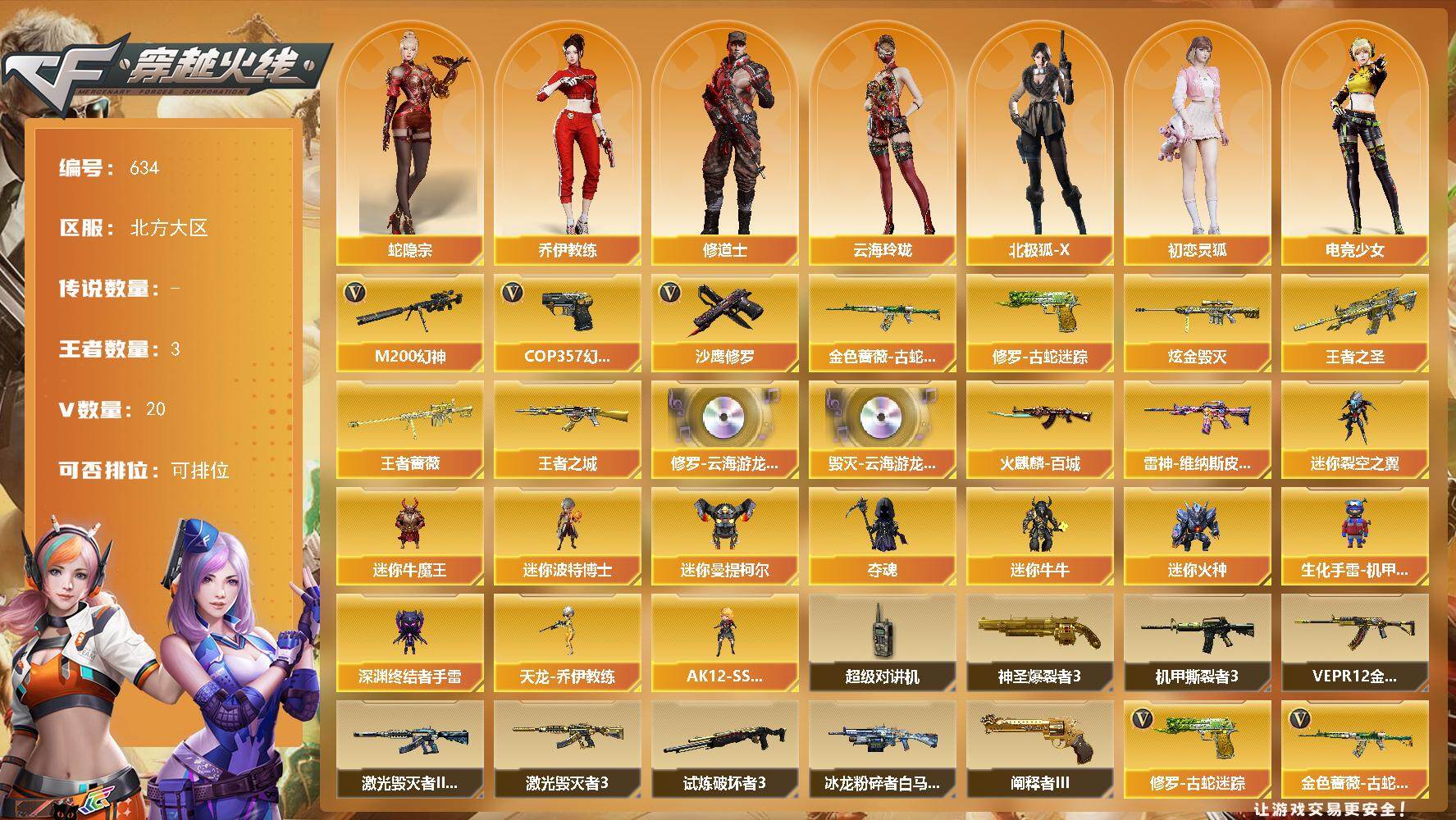 [15310479]北方大区-20V-3王者-1炫金 【热门武器】:M200-幻神,金色蔷薇-古蛇迷踪,修罗-古蛇迷踪,COP 357-幻灵,沙鹰-修罗 【王者炫金武器】:王者之圣,王者之城,王者蔷薇,炫金毁灭 【音效卡】:修罗-云海游龙音效卡,Barrett-毁灭-云海游龙音效卡 【皮肤】:雷神-维纳斯皮肤,火麒麟-百城 【角色】:蛇隐宗,乔伊教练,修道士,云海玲珑,北极狐-X,初恋灵狐,电竞少女,芳心审判者,飞虎队-X,风暴女,娟娟,兰-新年限定,猎狐者-追月,0号玩家,灵狐者-黄金海岸,曼陀罗-礼服,潘多拉-甜心教官,潜龙队-X,赛斯-X,蛇姬,兔囡囡,维纳斯,雪莉杨-摸金校尉,夜玫瑰-宠粉,樱-战斗天使,影武者-X,游珑儿 【人偶武器】:天龙-乔伊教练,AK12-SS-枪王曼陀罗,迷你裂空之翼*3,迷你牛魔王,迷你波特博士*5,迷你曼提柯尔*2,夺魂*3,迷你牛牛,迷你火种*4,生化手雷-机甲核心,深渊终结者手雷 【暴走生化】:超级对讲机 【挑战大师】:神圣爆裂者III,冰龙粉碎者-白马银枪,激光毁灭者III-白马银枪,VEPR-12-金魔,激光毁灭者III,机甲撕裂者III,试炼破坏者III,阐释者III 【英雄级武器】:M4A1-雷神,AK47-黑鲨,黑武士-锦绣游龙,金色蔷薇-古蛇迷踪,M200-幻神,烈龙-云海游龙,沙鹰-修罗,COP 357-幻灵,修罗-古蛇迷踪,幻灵之锋,擎天-云海游龙,高爆手雷-幻灵,手雷-云海游龙,高爆手雷-古蛇迷踪,闪光弹-幻灵*2,烟雾弹-幻灵,烟雾弹-古蛇迷踪 【道具】:云海游龙炫彩背包,冰冰企鹅背包,古蛇迷踪炫彩背包,超级背包,绿色巨人,灵魂忍者*2,变异宝贝,迷雾幽灵*2,生化弹匣,夺命之镰,防化服*3,金色流光-枪王排位,星辰流光-枪王排位,枪王排位28赛季金色流光,枪王排位29赛季金色流光,古蛇迷踪打击特效,蛇隐宗表情,电玩兔兔表情,斯沃特表情,循环实验表情,动感闪耀表情,云海游龙表情,C4-黑曜,新白银C4,C4-红龙,C4-沙漠,防弹头盔*4,防弹衣*4,C4工具钳*3,手雷包*3 【特殊枪械】: