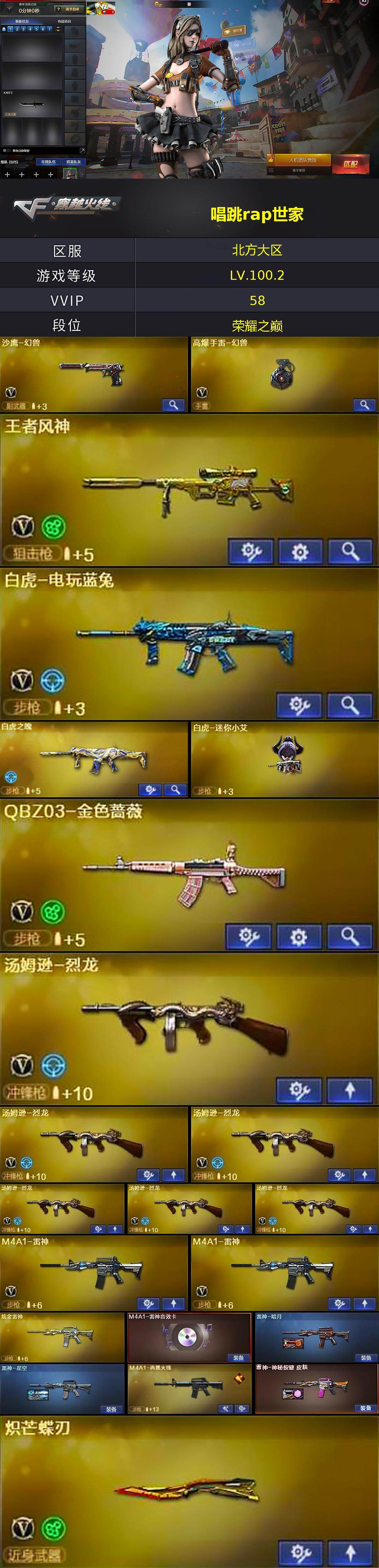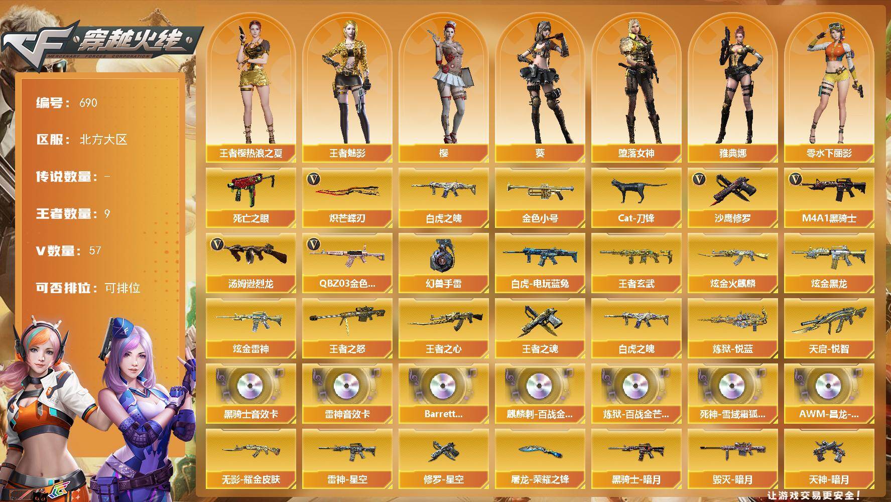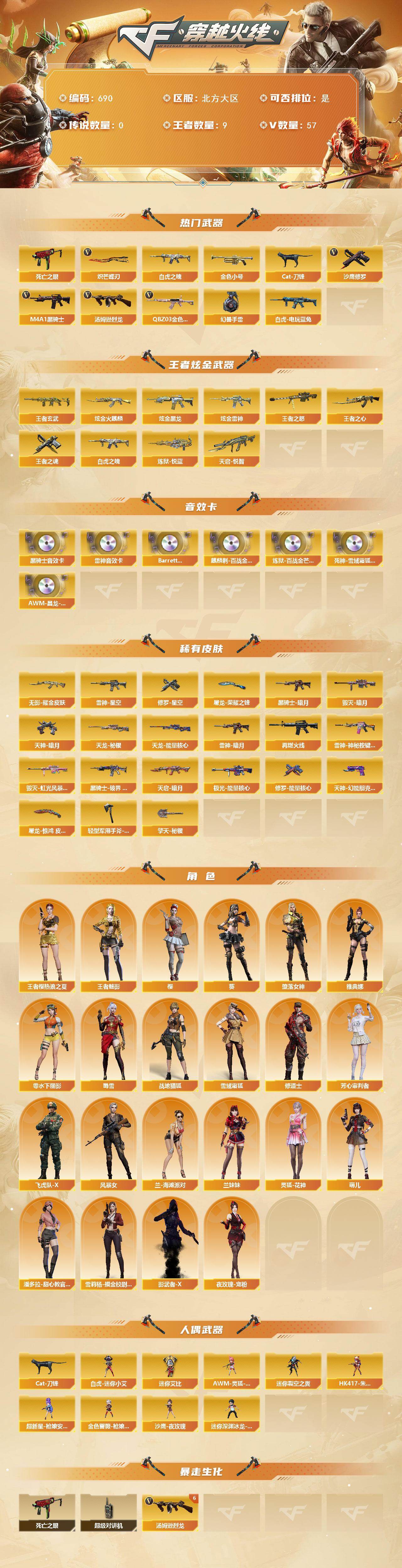 [15532779]北方大区-57V-9王者-3炫金 【热门武器】:QBZ03-金色蔷薇,死亡之眼*3,白虎之魄,白虎-电玩蓝兔,金色小号,Cat-刀锋,M4A1-黑骑士,汤姆逊-烈龙*6,沙鹰-修罗*3,炽芒蝶刃,高爆手雷-幻兽 【王者炫金武器】:天启-悦智,王者之心,白虎之魄,王者玄武,王者之怒*2,炼狱-悦蓝,王者之魂,炫金火麒麟,炫金黑龙,炫金雷神 【音效卡】:M4A1-雷神音效卡,M4A1-黑骑士音效卡,Barrett-碧霄极光音效卡,麒麟刺-百战金芒-盛典舞曲音效卡,炼狱-百战金芒-庆典舞曲音效卡,死神-雪域霜狐-怀旧音效卡,AWM-昌龙-怀旧音效卡 【皮肤】:雷神-暗月,雷神-星空,M4A1-再燃火线,雷神-神秘按键 皮肤,毁灭-暗月,毁灭-虹光风暴 皮肤,黑骑士-暗月*2,黑骑士-破界 皮肤,无影耀金皮肤,天启-暗月,天龙-秘银,天龙-能量核心,极光-能量核心,修罗-能量核心,修罗-星空,天神-暗月,天神-幻能朋克 皮肤,屠龙-荣耀之锋,屠龙-惊鸿 皮肤,轻型军用手斧-再燃火线,擎天-秘银 【角色】:葵,樱,战地猎狐,王者樱-热浪之夏,王者-魅影,堕落女神,雪域霜狐,修道士,芳心审判者,飞虎队-X,风暴女,兰-海滩派对,兰妹妹,零-水下丽影,灵狐-花神,萌儿,潘多拉-甜心教官,蜀雪,雪莉杨-摸金校尉,夜玫瑰-宠粉,影武者-X,雅典娜 【人偶武器】:白虎-迷你小艾,HK417-朱雀-枪娘菲*2,超新星-枪娘安琪儿,金色蔷薇-枪娘阿敏*2,AWM-灵狐-15周年嘉年华,Cat-刀锋,迷你裂空之翼,迷你深渊冰龙-王绿豆,迷你艾比,沙鹰-夜玫瑰 【暴走生化】:死亡之眼*3,超级对讲机 【挑战大师】:冰龙粉碎者-白马银枪,激光毁灭者III,神圣爆裂者-末日III 【英雄级武器】:AK47-火麒麟,M4A1-雷神*2,M4A1-黑骑士,AK47-无影,AK12-天启,AN94-超新星,M4A1-武圣,AK47-机械迷城,M4A1-龙血,黑武士-锦绣游龙,死神-雪域霜狐,M4A1-玫瑰精灵,QBZ03-金色蔷薇,白虎-电玩蓝兔,AWM-天龙,Barrett-毁灭,王者风神-觉醒版,炼狱-百战金芒,汤姆逊-烈龙*6,AA-12-雷霆,沙鹰-修罗*3,沙鹰-天神*2,沙鹰-幻兽,屠龙*2,龙啸,擎天,麒麟刺,炽芒蝶刃,女皇利刃-幻兽,麒麟刺-百战金芒,高爆手雷-幻兽,高爆手雷-竞技荣光