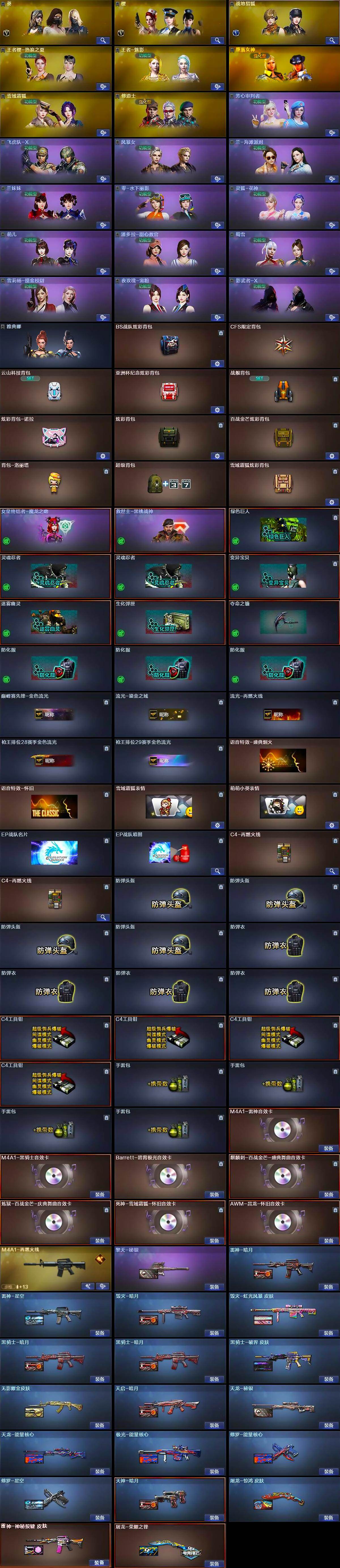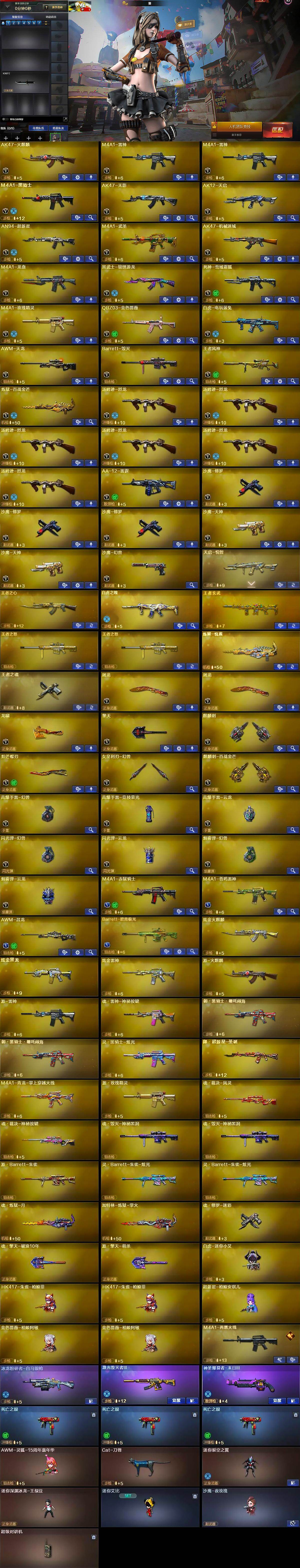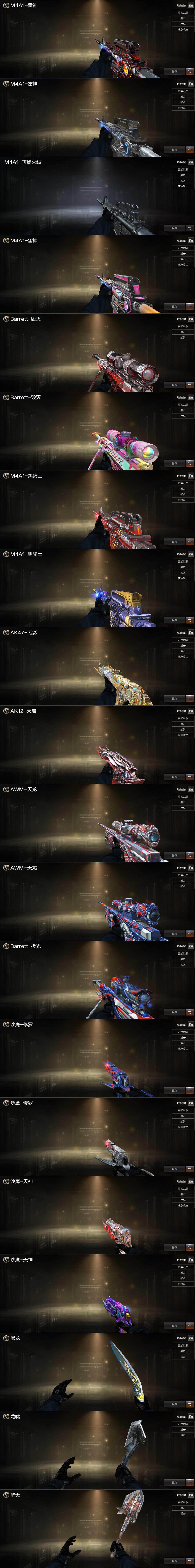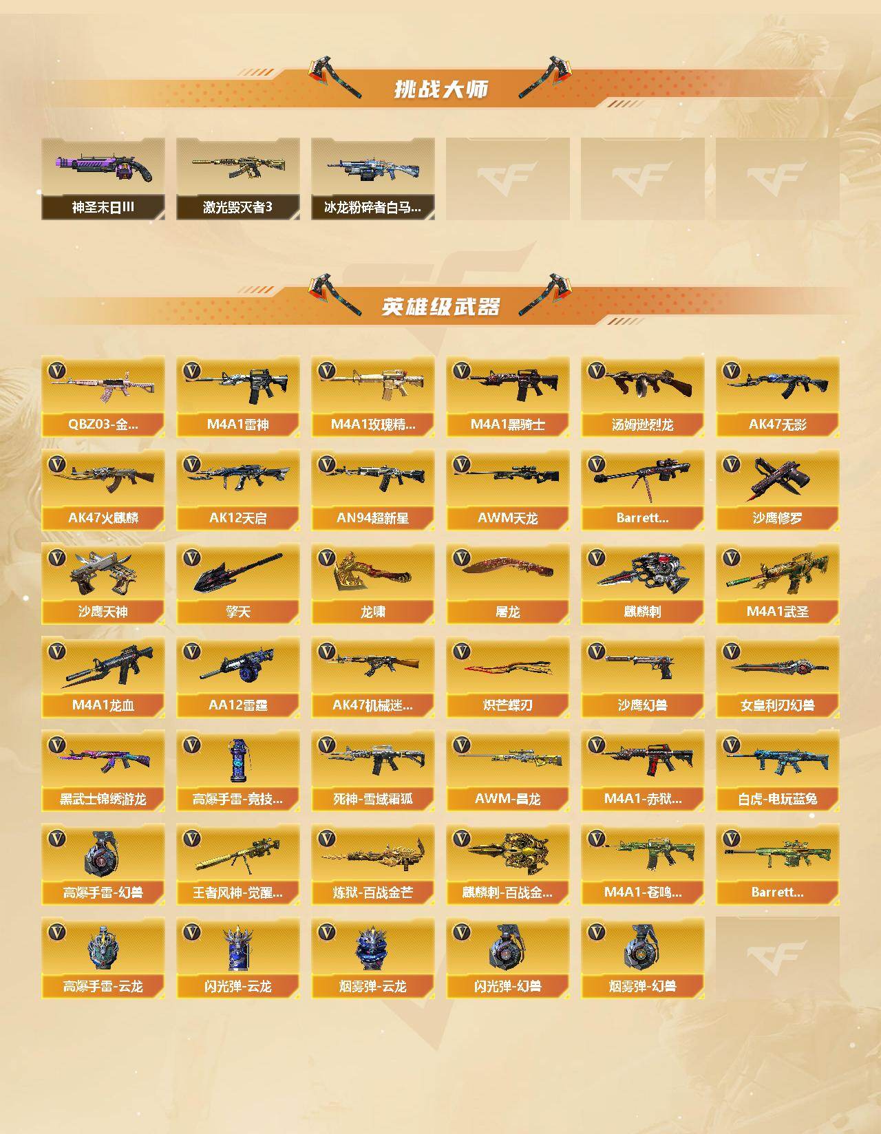 【英雄级武器】:AK47-火麒麟,M4A1-雷神*2,M4A1-黑骑士,AK47-无影,AK12-天启,AN94-超新星,M4A1-武圣,AK47-机械迷城,M4A1-龙血,黑武士-锦绣游龙,死神-雪域霜狐,M4A1-玫瑰精灵,QBZ03-金色蔷薇,白虎-电玩蓝兔,AWM-天龙,Barrett-毁灭,王者风神-觉醒版,炼狱-百战金芒,汤姆逊-烈龙*6,AA-12-雷霆,沙鹰-修罗*3,沙鹰-天神*2,沙鹰-幻兽,屠龙*2,龙啸,擎天,麒麟刺,炽芒蝶刃,女皇利刃-幻兽,麒麟刺-百战金芒,高爆手雷-幻兽,高爆手雷-竞技荣光