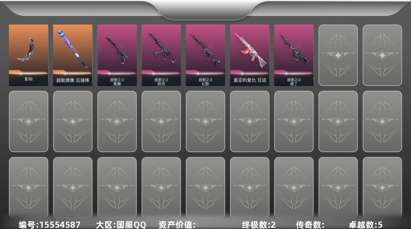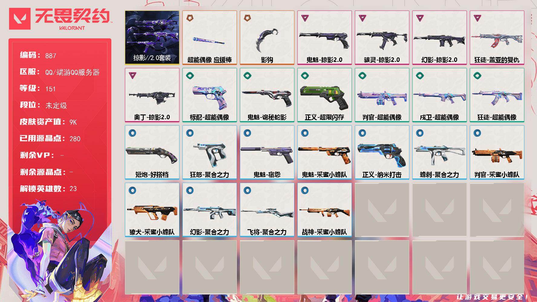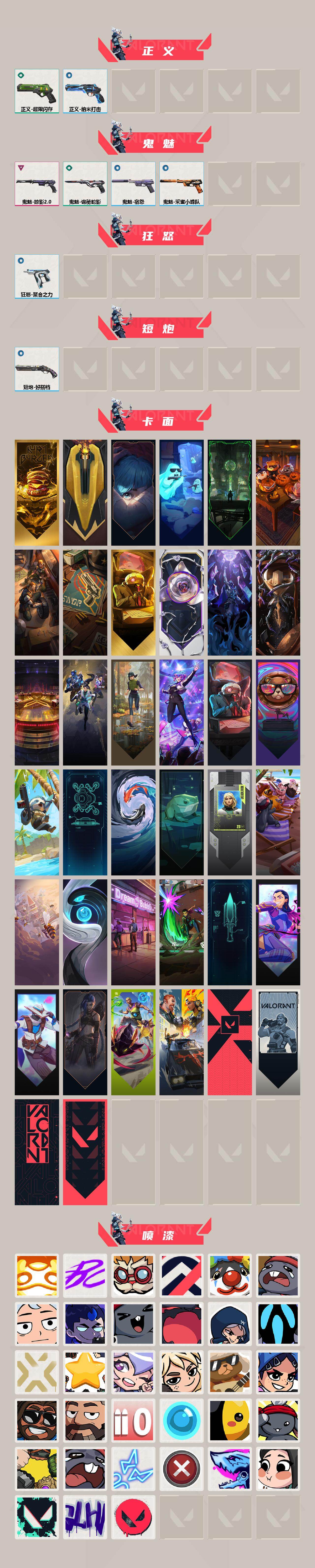 - [12456036]【英雄】:幻棱,炼狱,维斯,暮蝶,钛狐,壹决,铁臂,捷风,幽影,不死鸟,贤者,猎枭,零,芮娜,奇乐,尚勃勒,K/O,盖可 【近战 武器】:近战武器-魔术火花,近战武器-黑波之刃,近战武器-威龙之刃,近战武器-诡秘蛇影 军刀,近战武器-魔术火花 【狂徒】:狂徒-艾沃莉的梦之翼,狂徒-RGX 11z Pro,狂徒-紫阙金琅,狂徒-诡秘蛇影 【幻影】:幻影-侦察力量,幻影-末日之翼 【戍卫】:戍卫-折光棱晶 【冥驹】:冥驹-掠影 【飞将】:飞将-末日之翼 【莽侠】:莽侠-诡秘蛇影 【奥丁】:奥丁-末日之翼 【判官】:判官-诡秘蛇影 【蜂刺】:蜂刺-折光棱晶 【标配】:标配-折光棱晶 【正义】:正义-千灵华绽 【鬼魅】:鬼魅-诡秘蛇影 【短炮】:短炮-末日之翼 【卡面】:钢弓与箭弦 卡面,流星兵团 卡面,无畏契约GO!第一卷:芮娜 卡面,无畏契约GO!第一卷:零 卡面,代号红色 卡面,新兵报到 卡面,V契约 卡面,无畏契约 卡面 【喷漆】:买装还是存钱 喷漆,胜利属于无畏契约 喷漆,GLHF 喷漆,无畏契约 喷漆 【挂饰】:天外飞客 挂饰,无畏契约 纪念币 挂饰