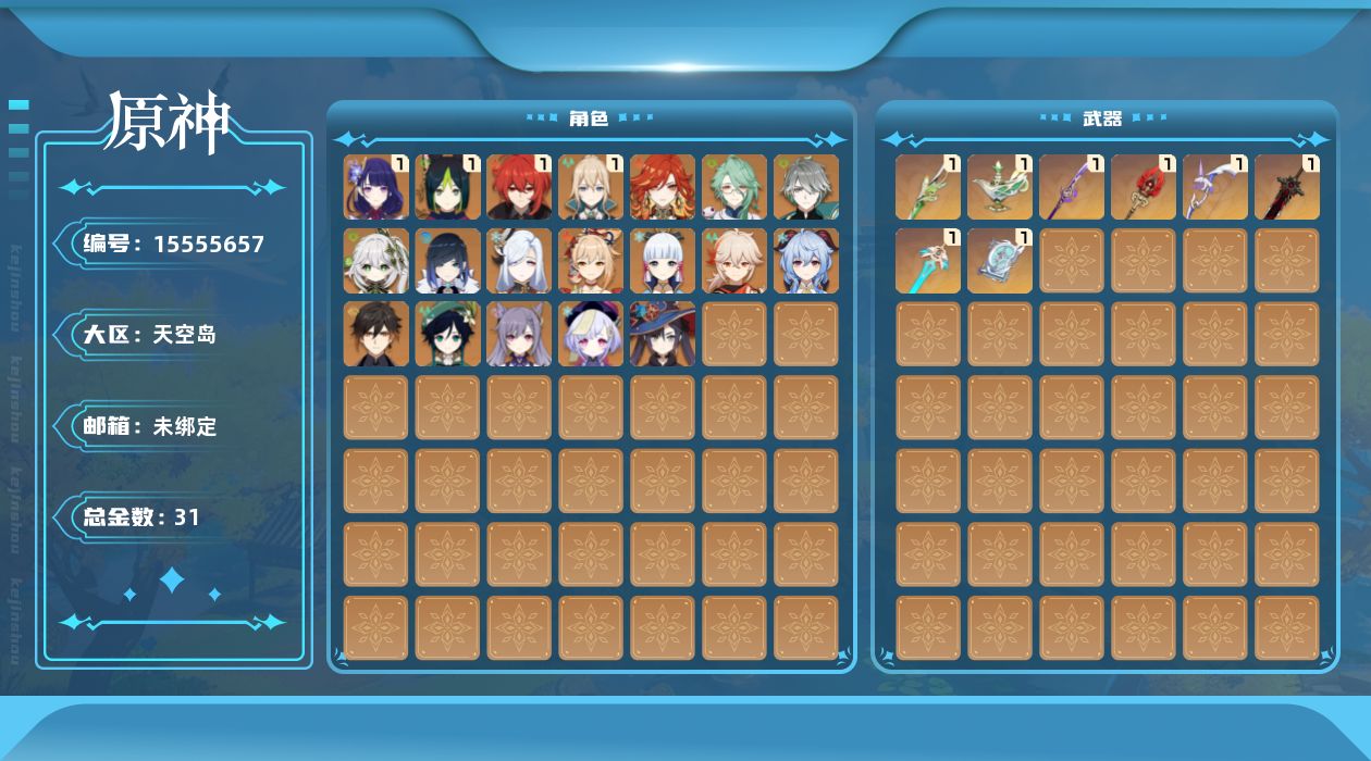 0命白术,0命艾尔海森,0命纳西妲,1命提纳里,0命夜兰,0命申鹤,1命雷电将军,0命枫原万叶,0命神里绫华,0命钟离,0命甘雨,0命宵宫,0命温迪,0命刻晴,0命七七,1命琴,0命莫娜,1命迪卢克,0命玛薇卡,精1裁叶萃光,精1千夜浮梦,精1薙草之稻光,精1护摩之杖,精1四风原典,精1阿莫斯之弓,精1天空之刃,精1狼的末路