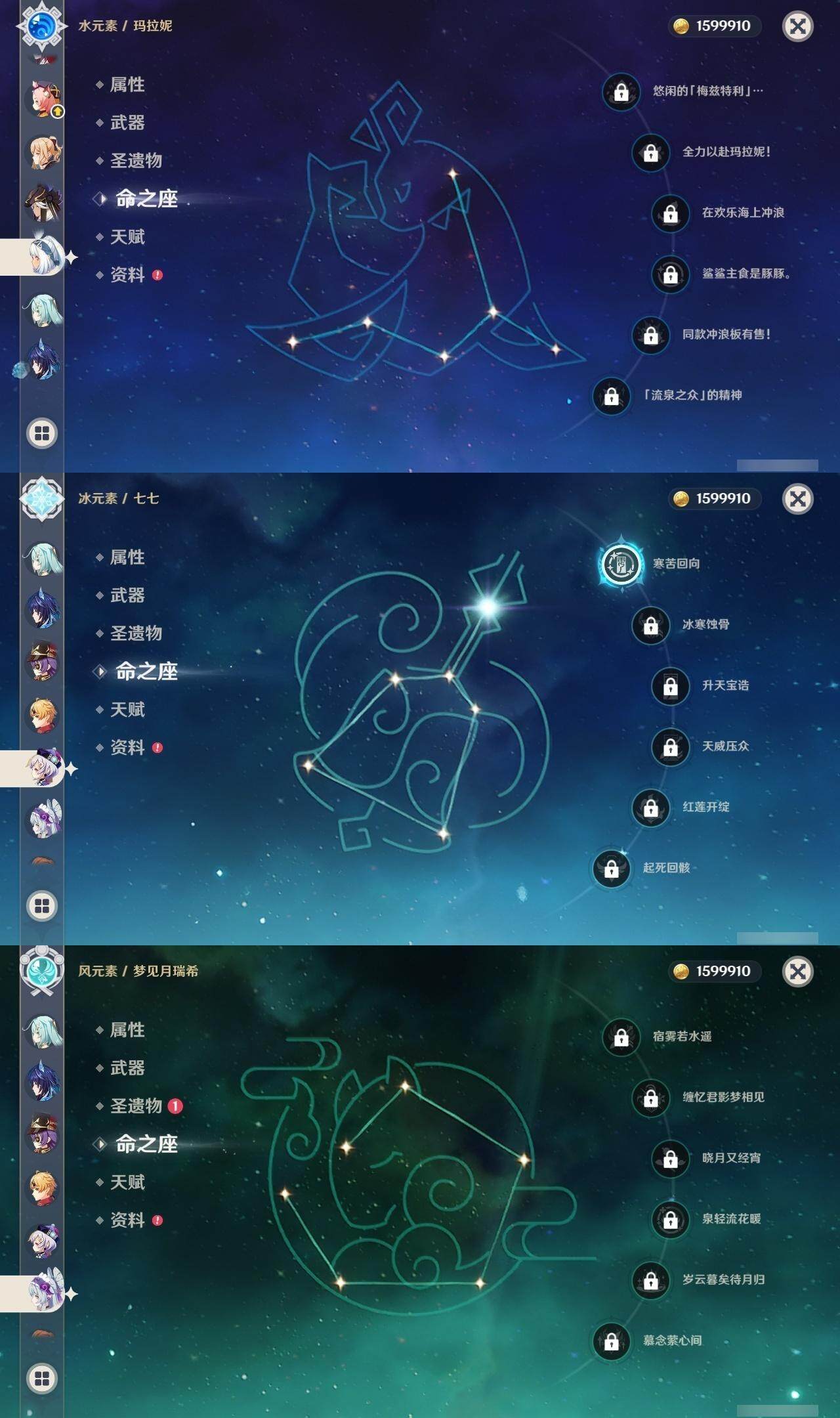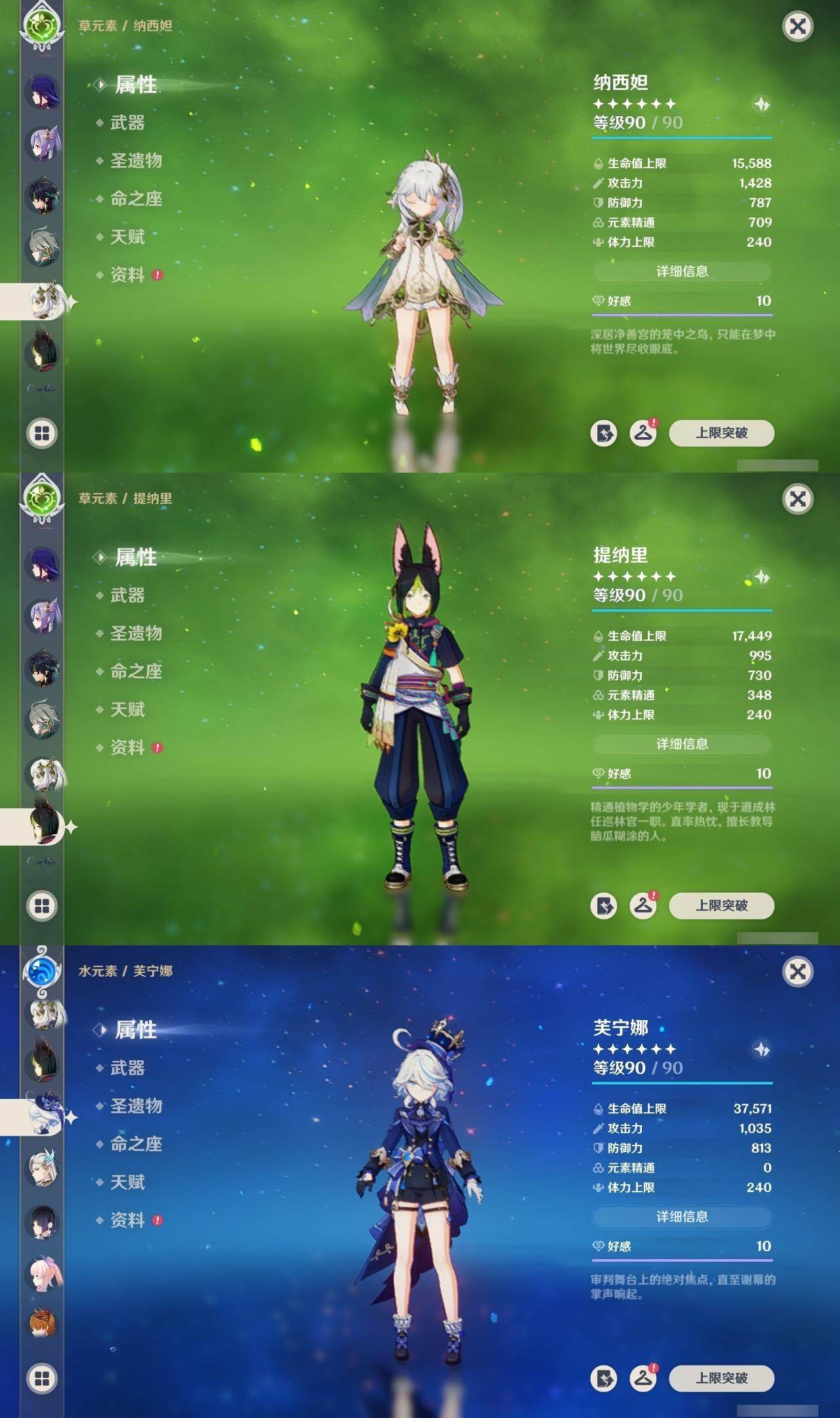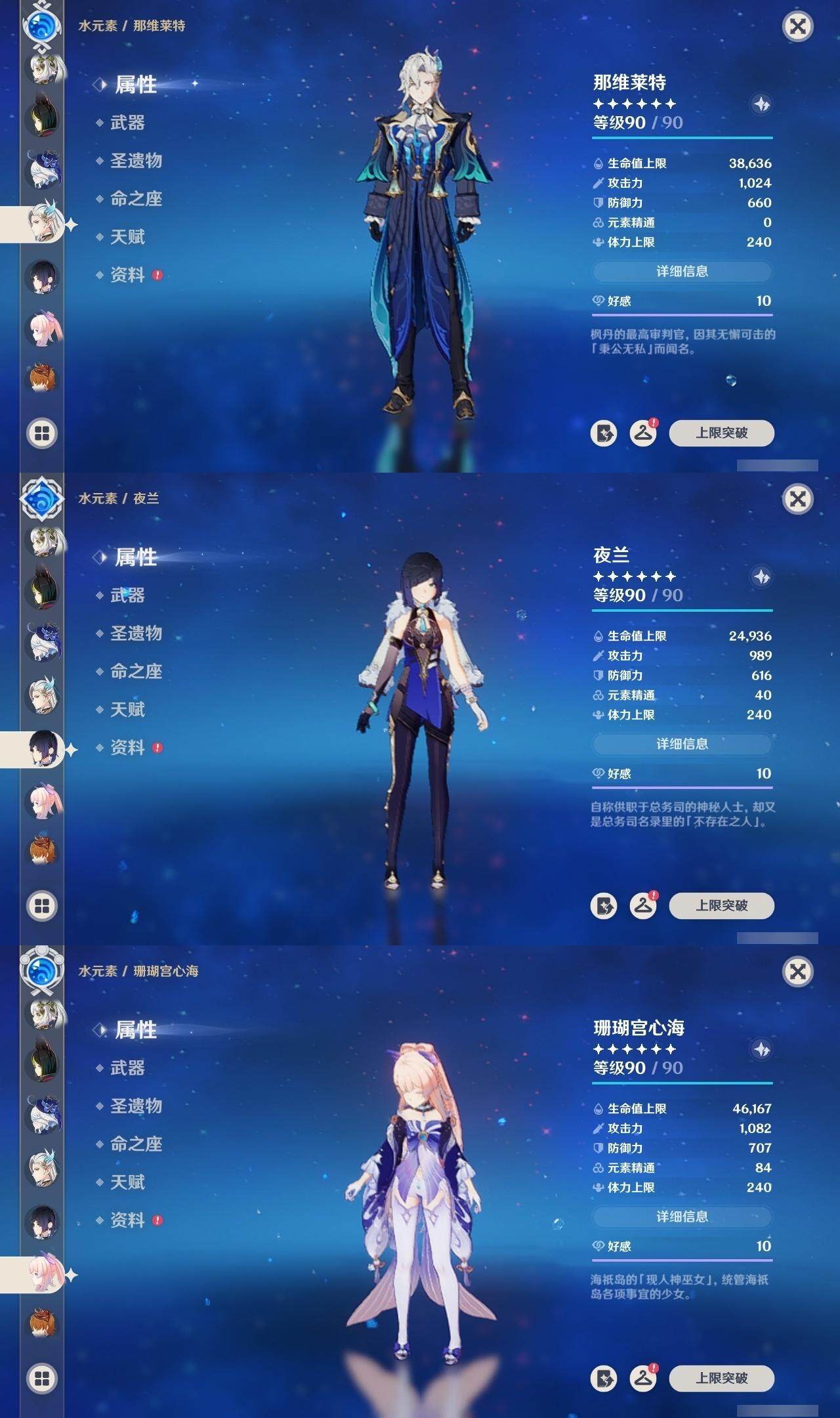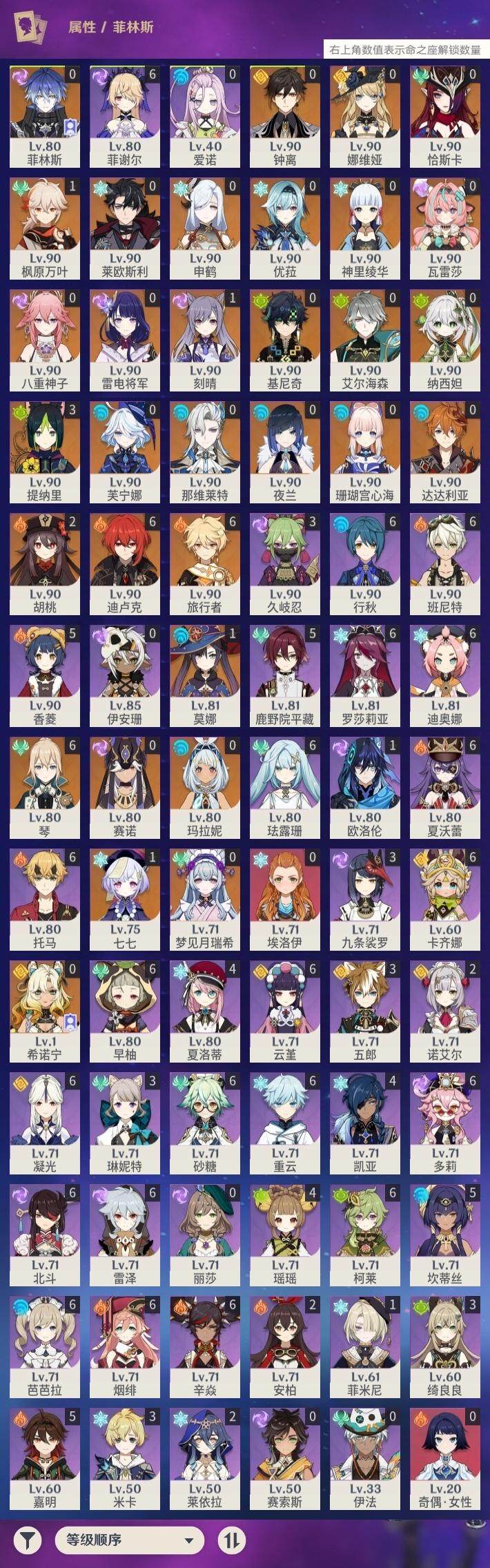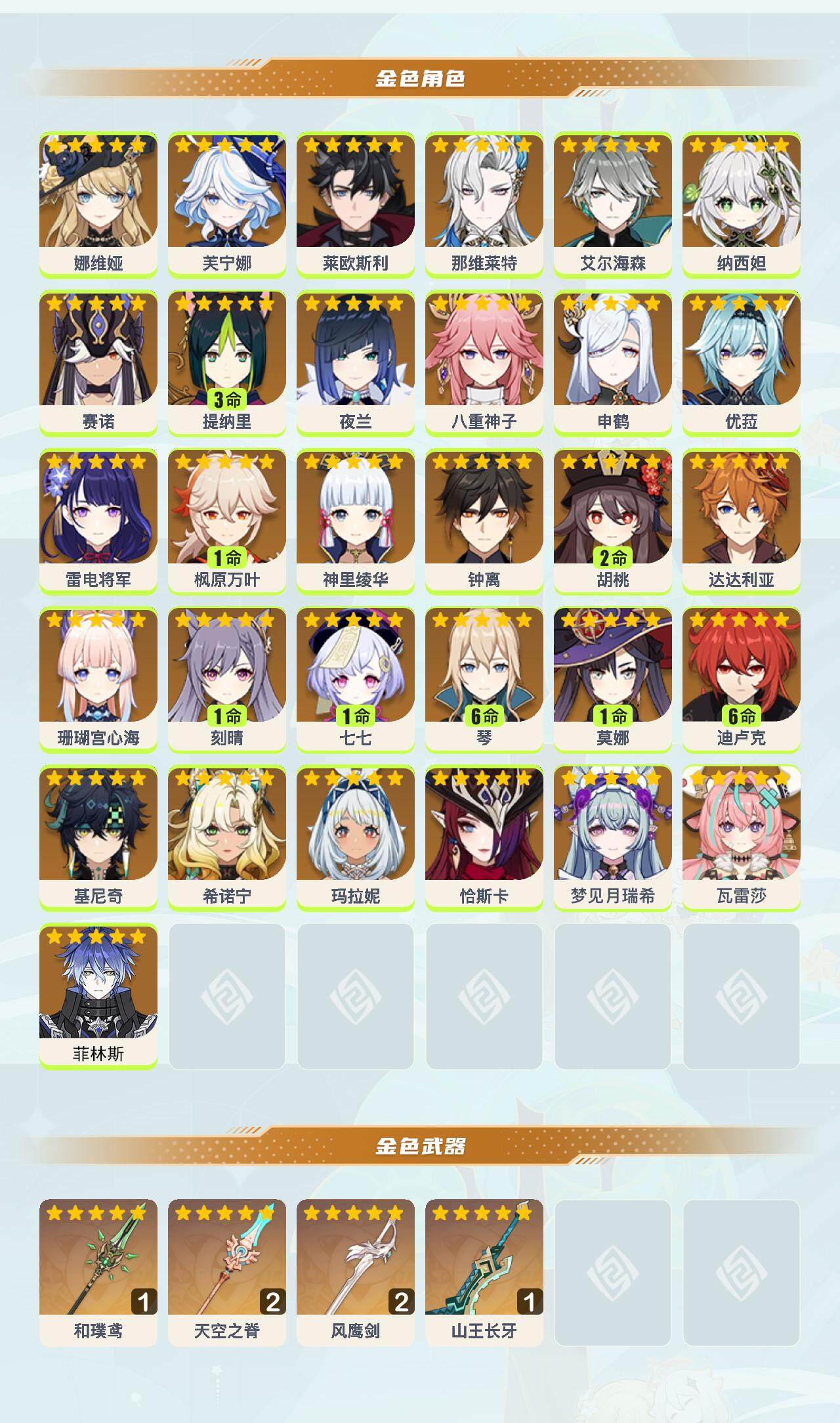 0命娜维娅,0命芙宁娜,0命莱欧斯利,0命那维莱特,0命艾尔海森,0命纳西妲,0命赛诺,3命提纳里,0命夜兰,0命八重神子,0命申鹤,0命优菈,0命雷电将军,1命枫原万叶,0命神里绫华,0命钟离,2命胡桃,0命达达利亚,0命珊瑚宫心海,1命刻晴,1命七七,满命琴,1命莫娜,满命迪卢克,0命基尼奇,0命希诺宁,0命玛拉妮,0命恰斯卡,0命梦见月瑞希,0命瓦雷莎,0命菲林斯,精1和璞鸢,精2天空之脊,精2风鹰剑,精1山王长牙