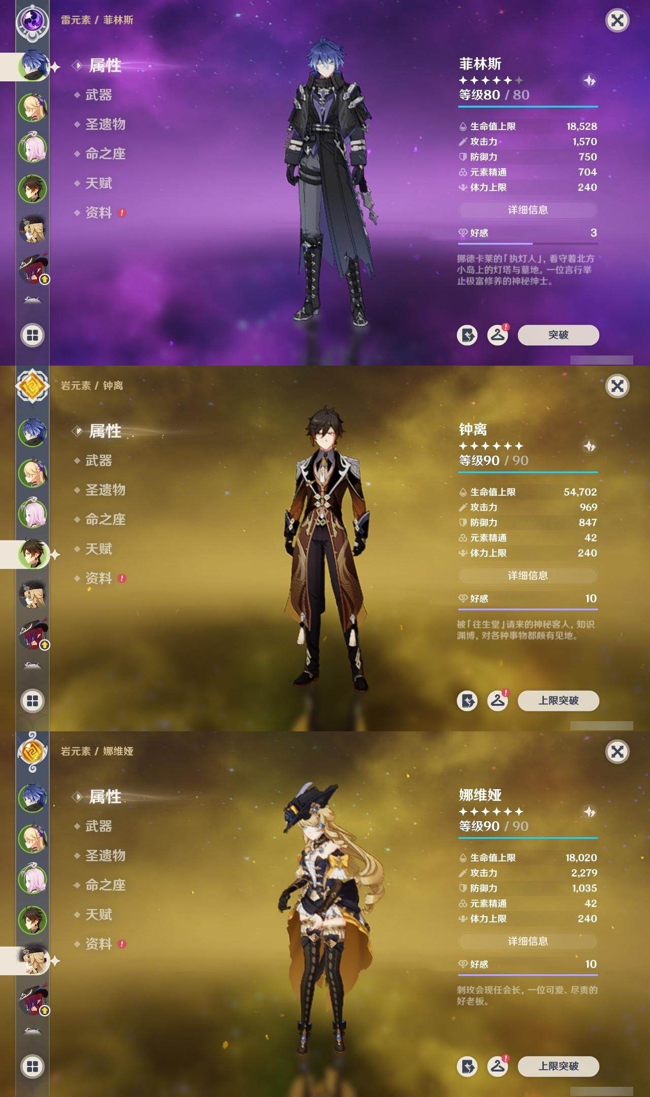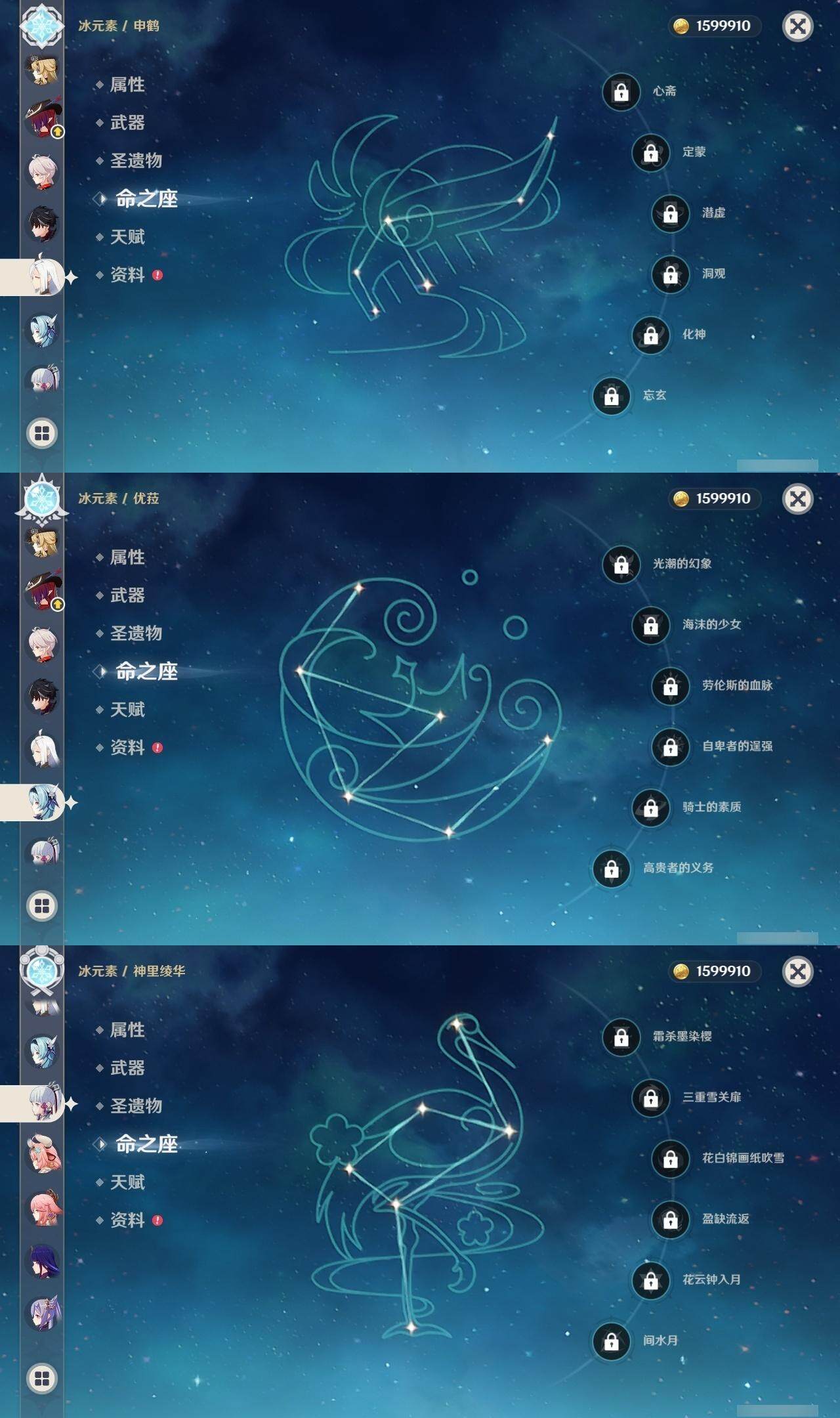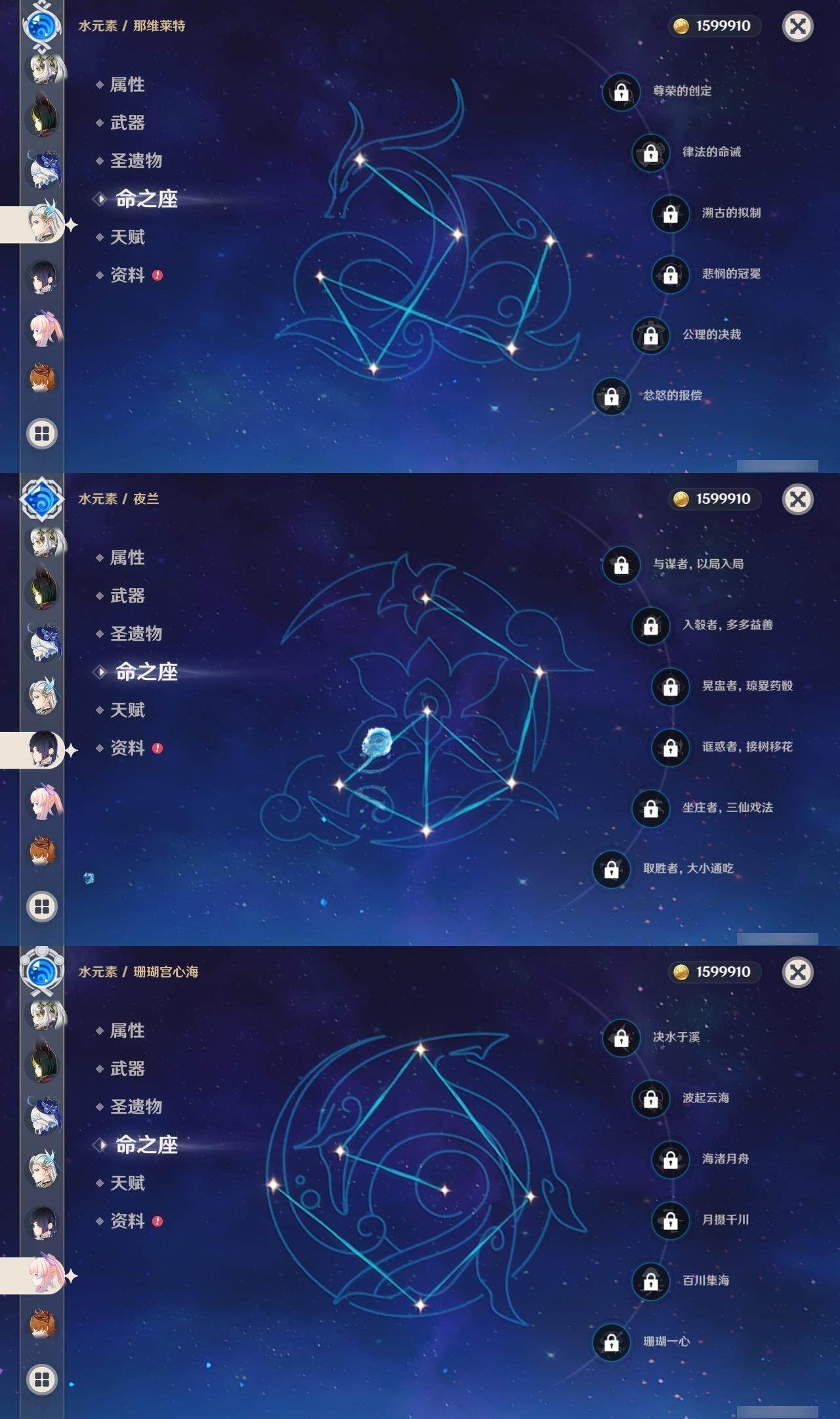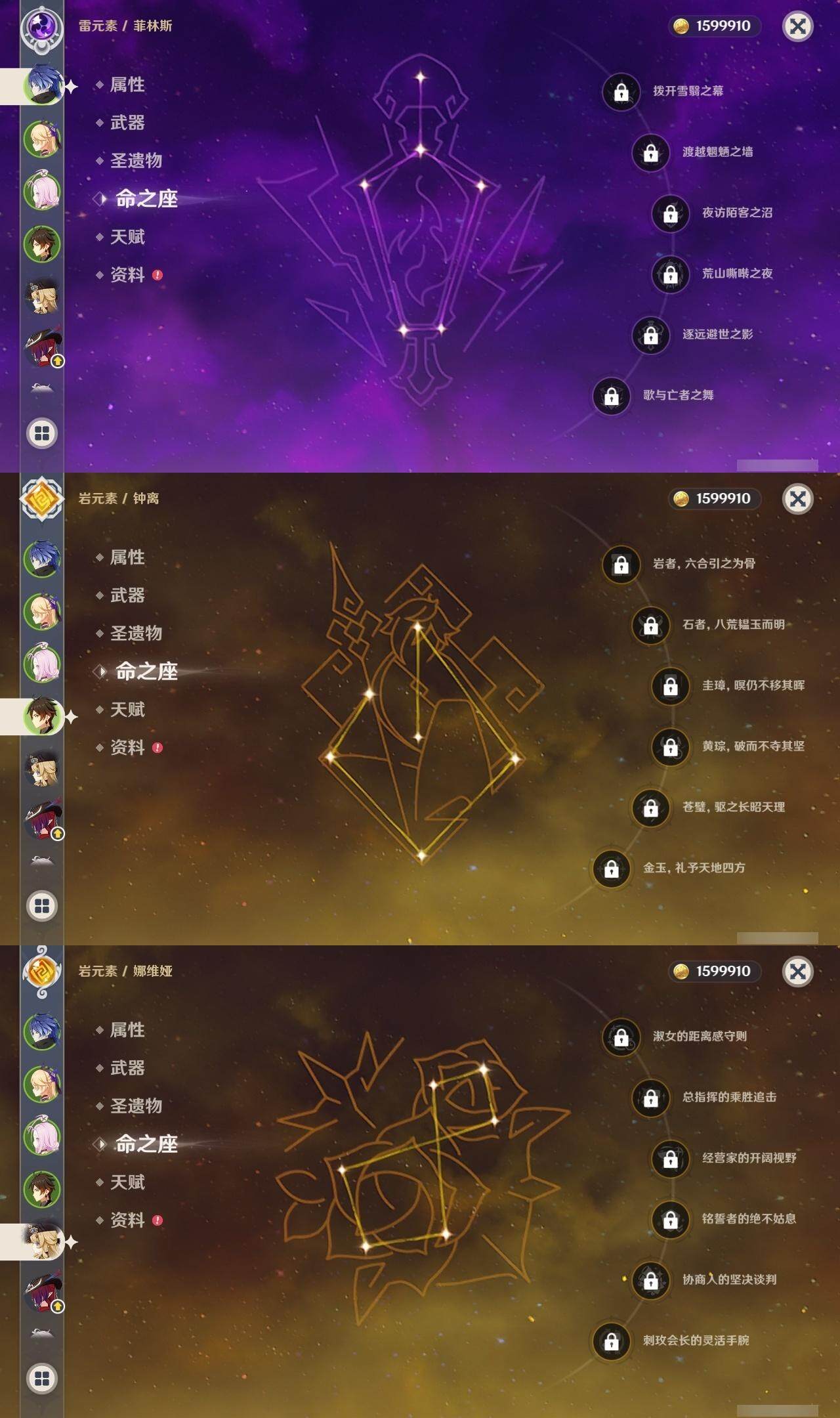 0命娜维娅,0命芙宁娜,0命莱欧斯利,0命那维莱特,0命艾尔海森,0命纳西妲,0命赛诺,3命提纳里,0命夜兰,0命八重神子,0命申鹤,0命优菈,0命雷电将军,1命枫原万叶,0命神里绫华,0命钟离,2命胡桃,0命达达利亚,0命珊瑚宫心海,1命刻晴,1命七七,满命琴,1命莫娜,满命迪卢克,0命基尼奇,0命希诺宁,0命玛拉妮,0命恰斯卡,0命梦见月瑞希,0命瓦雷莎,0命菲林斯,精1和璞鸢,精2天空之脊,精2风鹰剑,精1山王长牙