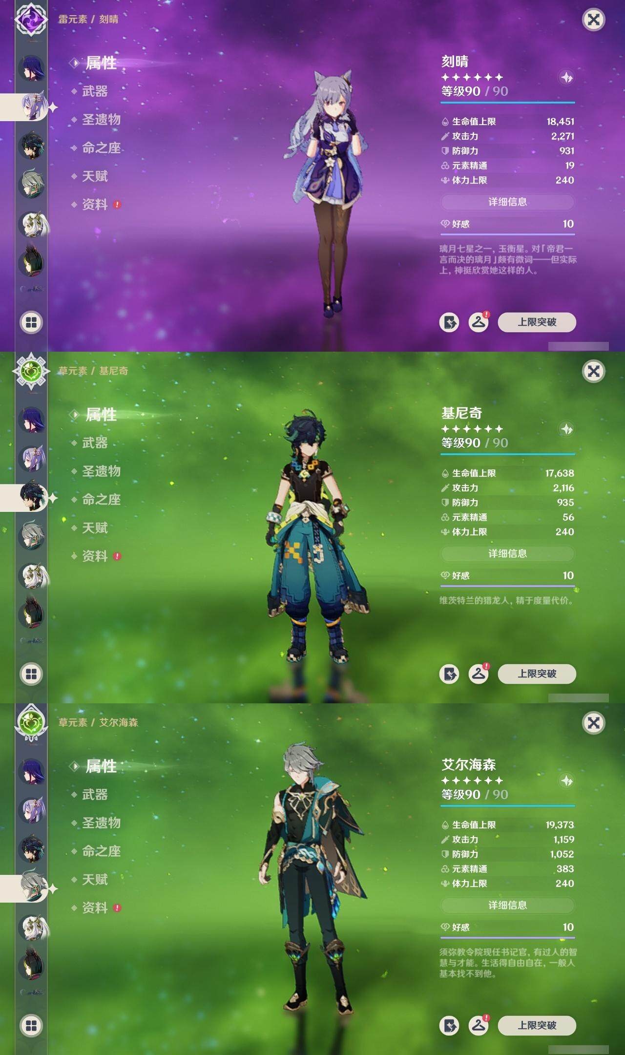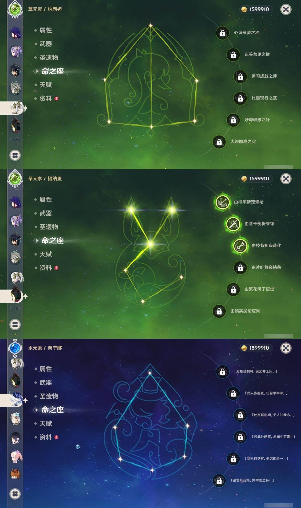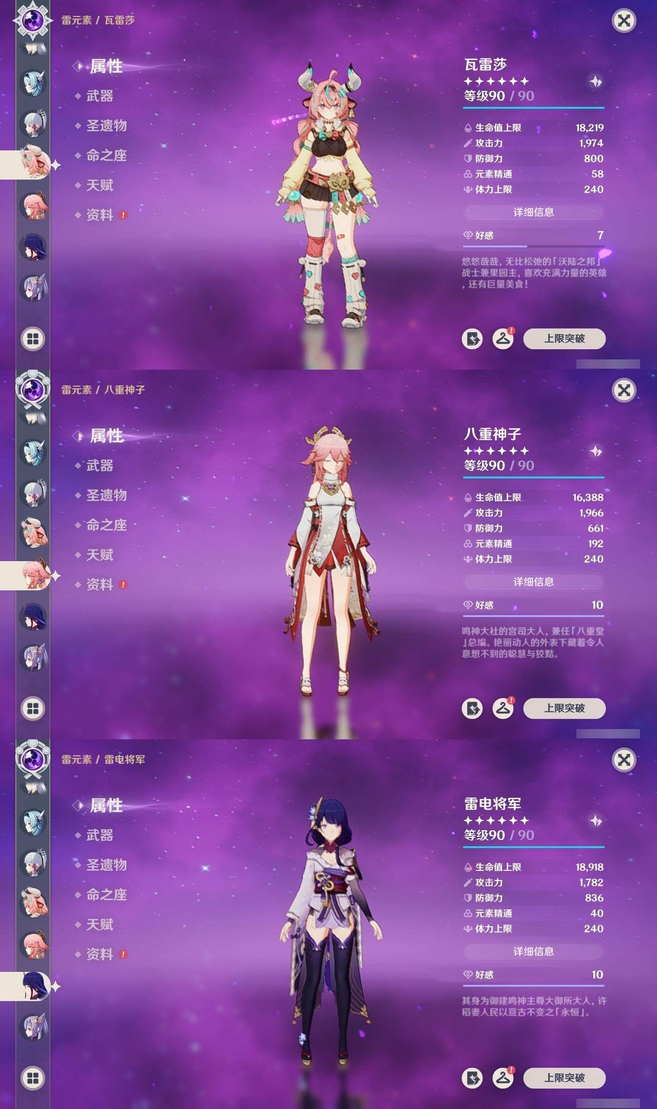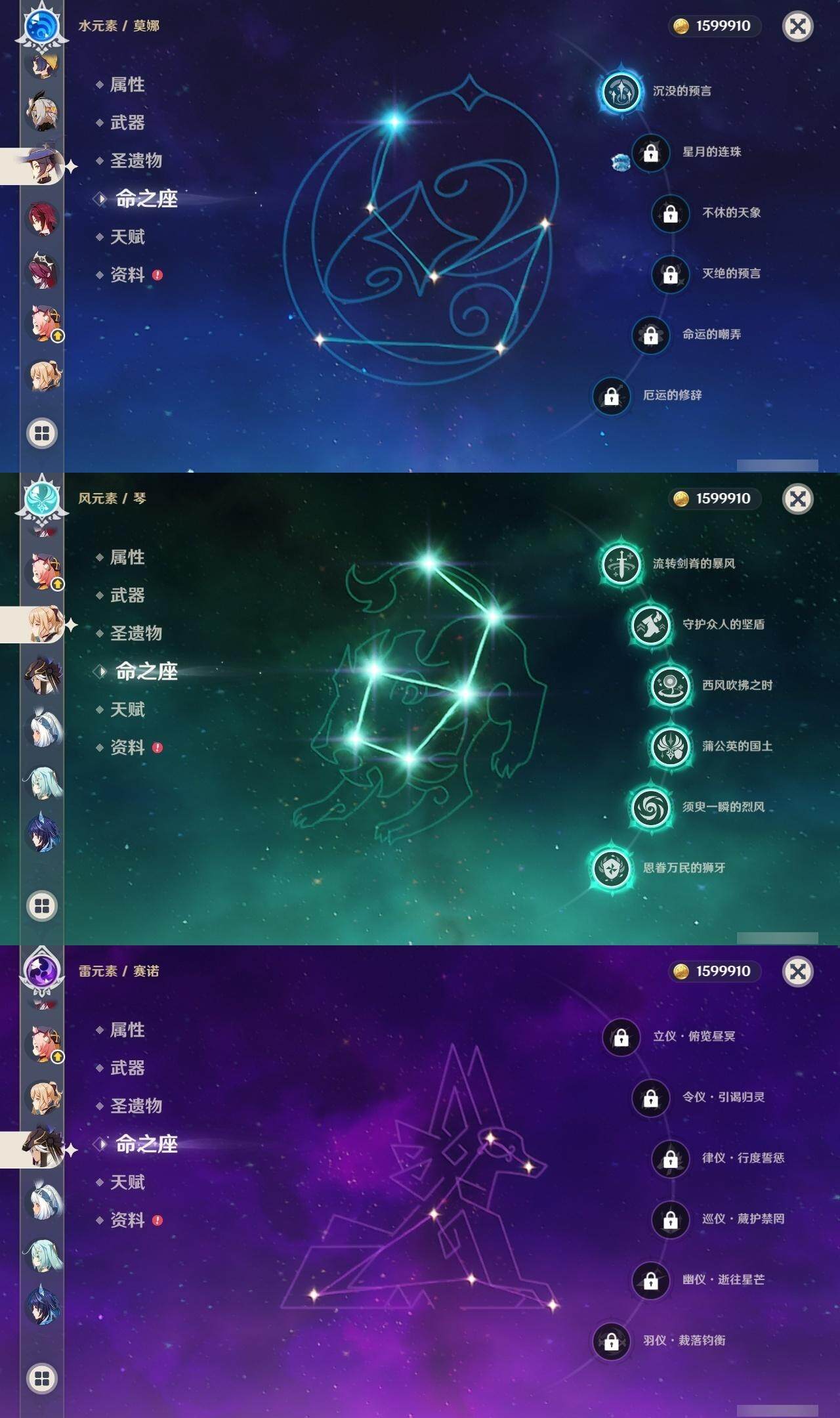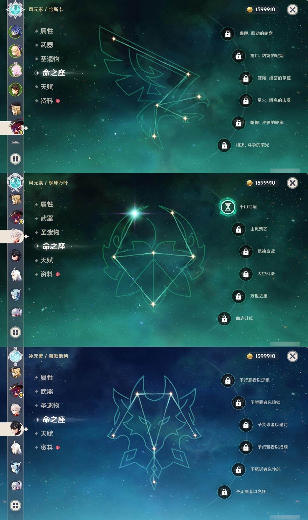 0命娜维娅,0命芙宁娜,0命莱欧斯利,0命那维莱特,0命艾尔海森,0命纳西妲,0命赛诺,3命提纳里,0命夜兰,0命八重神子,0命申鹤,0命优菈,0命雷电将军,1命枫原万叶,0命神里绫华,0命钟离,2命胡桃,0命达达利亚,0命珊瑚宫心海,1命刻晴,1命七七,满命琴,1命莫娜,满命迪卢克,0命基尼奇,0命希诺宁,0命玛拉妮,0命恰斯卡,0命梦见月瑞希,0命瓦雷莎,0命菲林斯,精1和璞鸢,精2天空之脊,精2风鹰剑,精1山王长牙
