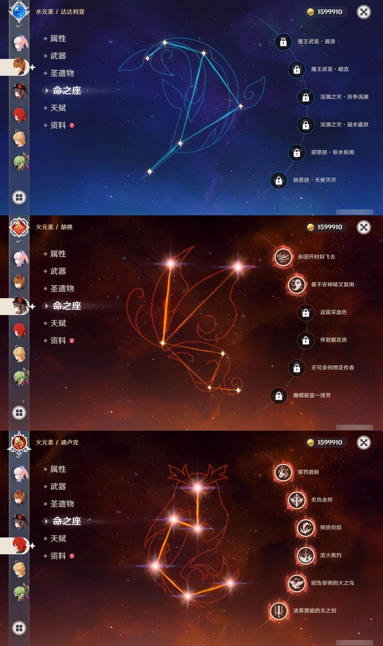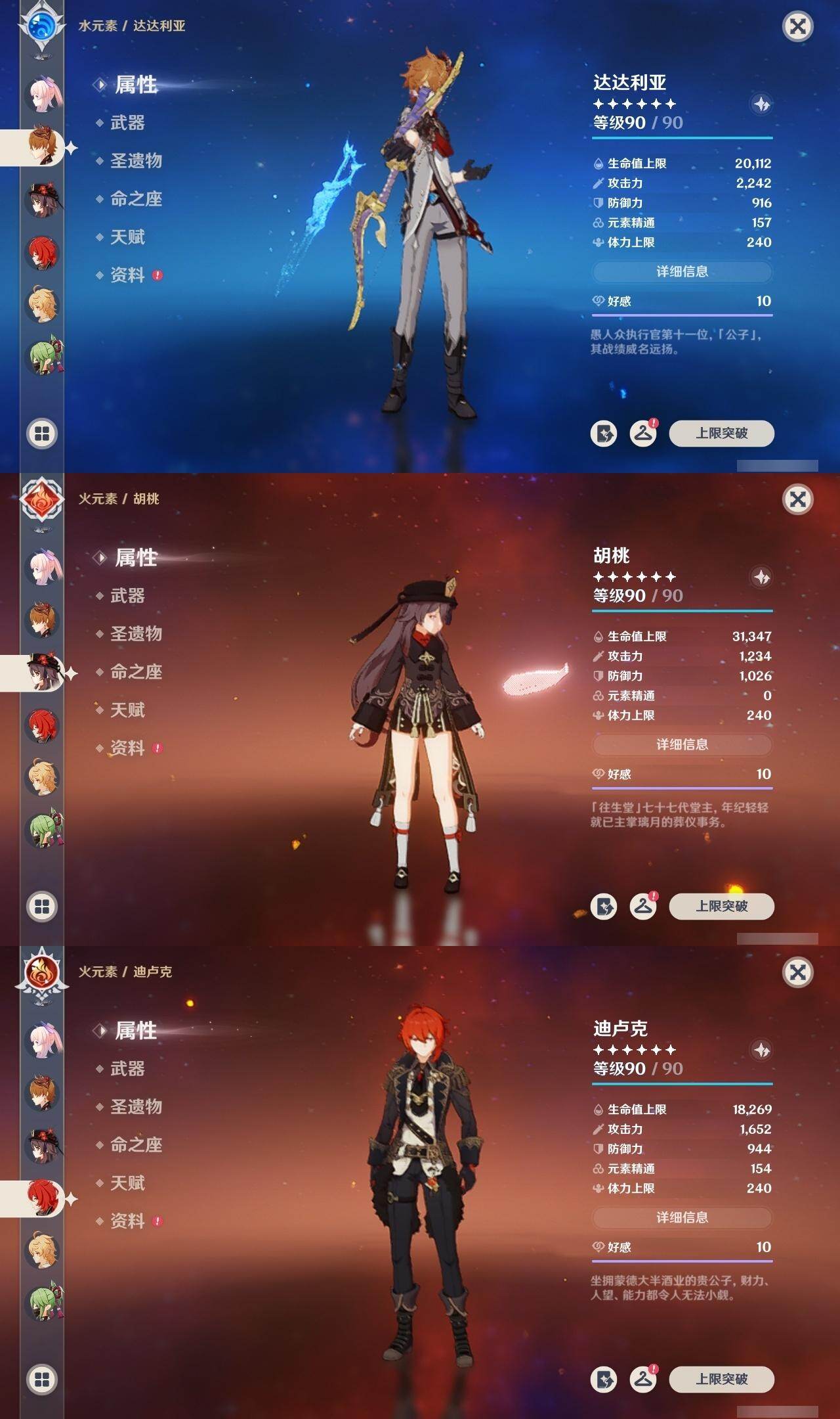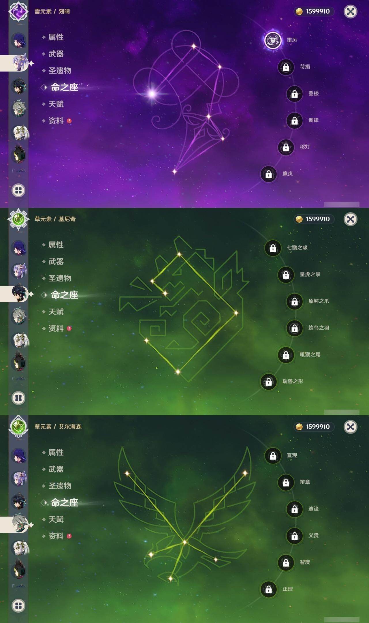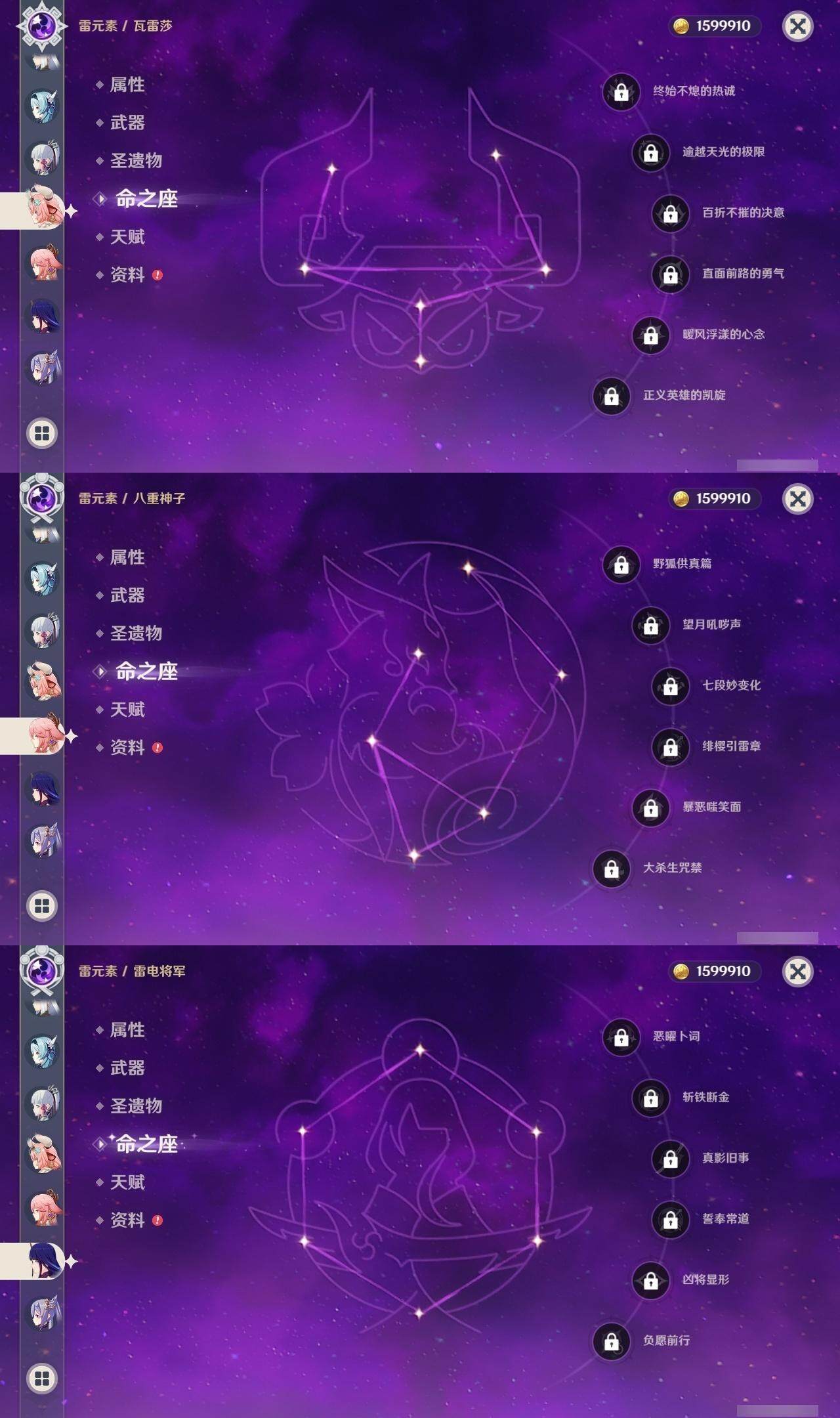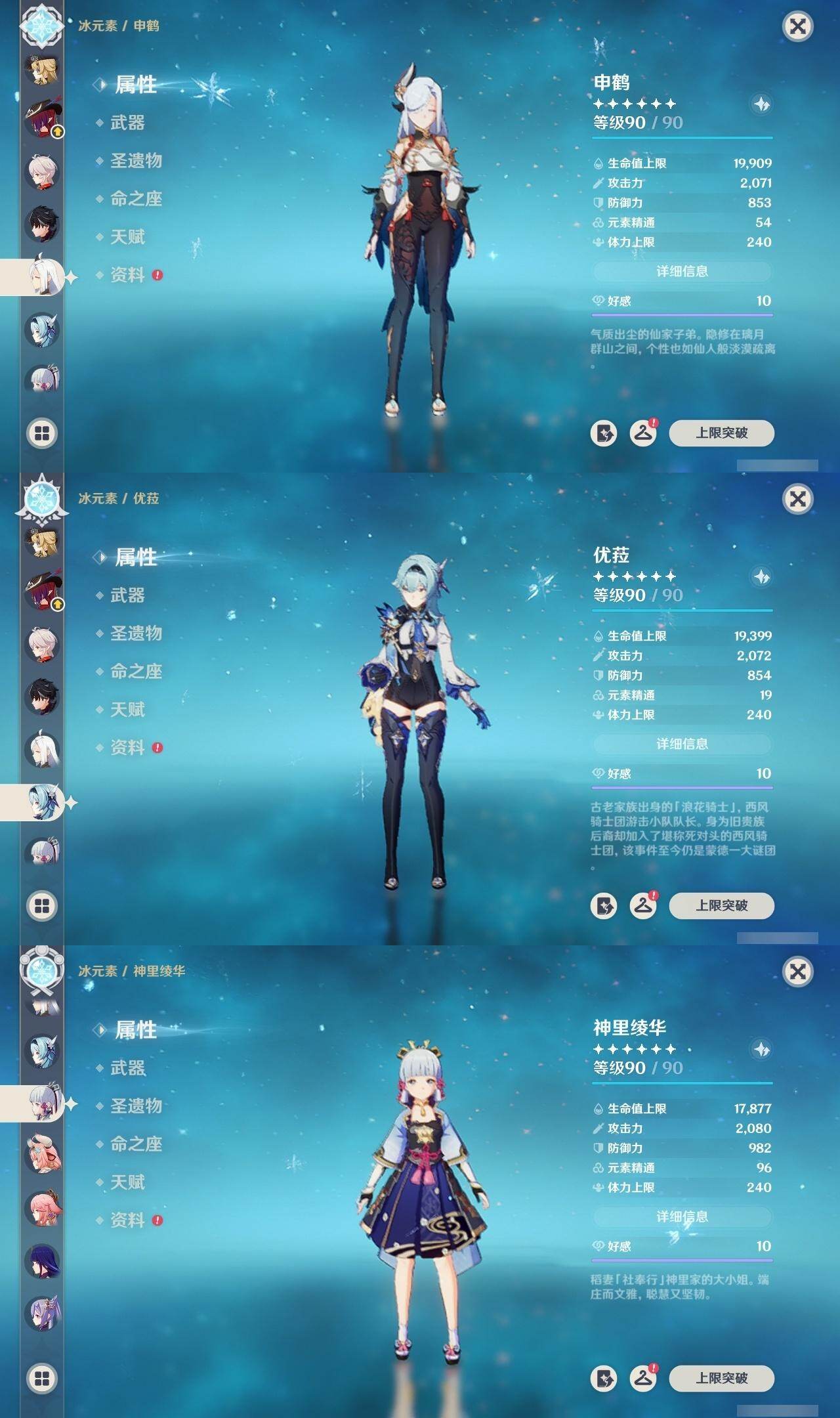 0命娜维娅,0命芙宁娜,0命莱欧斯利,0命那维莱特,0命艾尔海森,0命纳西妲,0命赛诺,3命提纳里,0命夜兰,0命八重神子,0命申鹤,0命优菈,0命雷电将军,1命枫原万叶,0命神里绫华,0命钟离,2命胡桃,0命达达利亚,0命珊瑚宫心海,1命刻晴,1命七七,满命琴,1命莫娜,满命迪卢克,0命基尼奇,0命希诺宁,0命玛拉妮,0命恰斯卡,0命梦见月瑞希,0命瓦雷莎,0命菲林斯,精1和璞鸢,精2天空之脊,精2风鹰剑,精1山王长牙