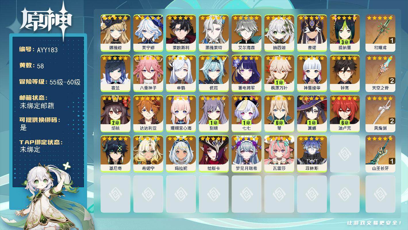 [15556081]【店主推荐捡漏号】60级/58黄/男主/31个五星角色/4个五星武器 0命娜维娅,0命芙宁娜,0命莱欧斯利,0命那维莱特,0命艾尔海森,0命纳西妲,0命赛诺,3命提纳里,0命夜兰,0命八重神子,0命申鹤,0命优菈,0命雷电将军,1命枫原万叶,0命神里绫华,0命钟离,2命胡桃,0命达达利亚,0命珊瑚宫心海,1命刻晴,1命七七,满命琴,1命莫娜,满命迪卢克,0命基尼奇,0命希诺宁,0命玛拉妮,0命恰斯卡,0命梦见月瑞希,0命瓦雷莎,0命菲林斯,精1和璞鸢,精2天空之脊,精2风鹰剑,精1山王长牙