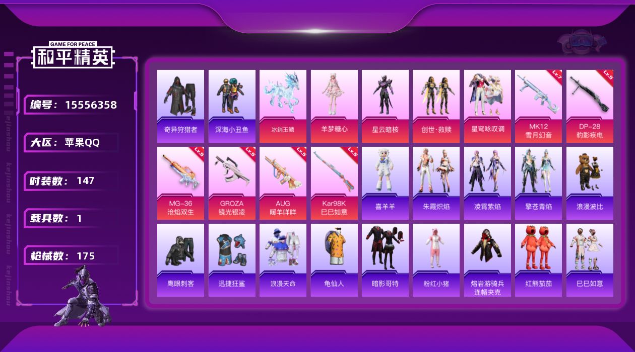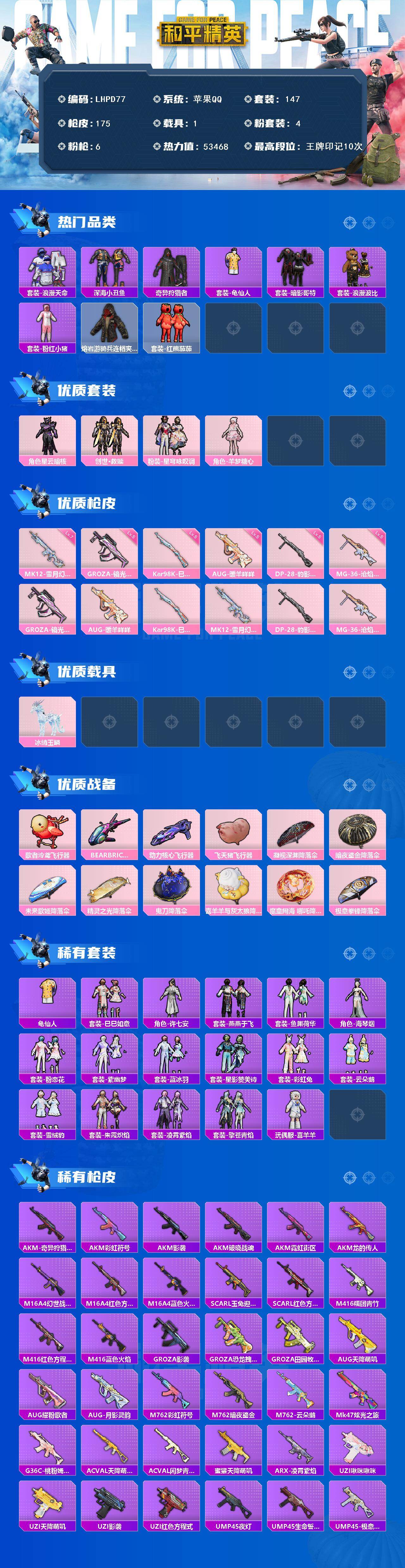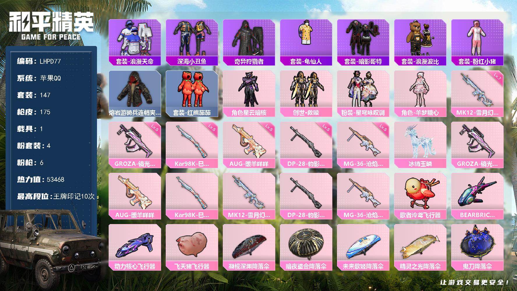 [15556358]【特价出售/店主推荐】苹果 手Q-4粉装-6特效枪-1载具-5粉色飞行器-53468热力值-10王牌印记-147套装-175枪皮【热门品类】:套装-浪漫天命,套装-深海小丑鱼,套装-奇异狩猎者,套装-龟仙人,套装-暗影哥特,套装-浪漫波比,套装-粉红小猪,熔岩游骑兵连帽夹克,套装-红熊茄茄【粉色套装】:角色-星云暗核,套装-创世·救赎,粉装-星穹咏叹调,角色-羊梦糖心【粉色枪皮等级】:GROZA-镜光银凌(五级),AUG-暖羊咩咩(五级),Kar98K-巳巳如意(五级),MK12-雪月幻音(七级),DP-28-豹影疾电(五级),MG-36-沧焰双生(五级)【粉色载具】:冰绡玉鳞【粉色枪皮】:GROZA-镜光银凌,AUG-暖羊咩咩,Kar98K-巳巳如意,MK12-雪月幻音,DP-28-豹影疾电,MG-36-沧焰双生【粉色飞行器】:歌者泠鸢飞行器,BEARBRICK飞行器,动力核心飞行器,飞天猪飞行器