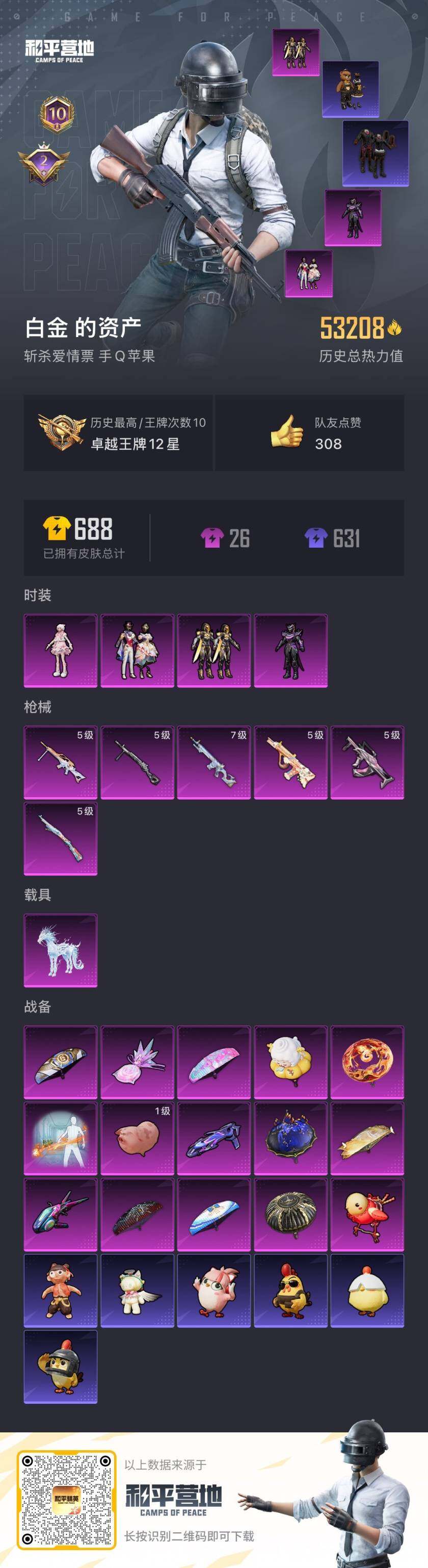 - PX_2104891-(可二次实名) 三字ID-巡查员-3卓越-2传奇-1绝世印记-浪漫天命-满级星穹咏叹调-龟仙人- 鹰眼刺客- 狂沙舞者- 漫步者-安卓Q-28589热力值 6王牌印记 历史绝世王牌10星 72套装 93枪皮 【1稀有】 浪漫天命 【2粉装】 未来歌姬 创世救赎 【2特效枪】 AKS-74U-星穹咏叹调 (7级) Kar98K-巳巳如意 (5级) 【1飞行器】 千面幻镜飞行器