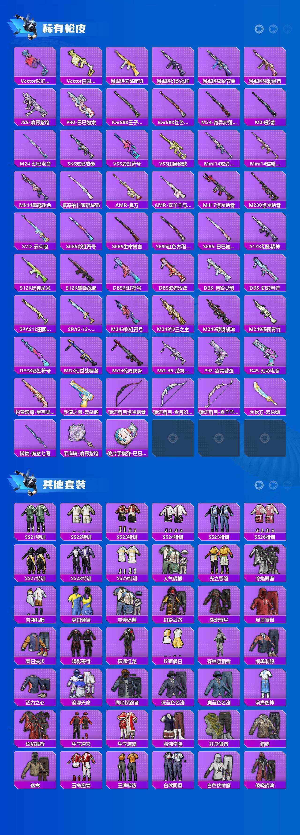 - [11913175]7粉装 8特效枪 5载具 14印记 可二次 可修改实名 优质装备:玛莎拉蒂MC20(幻星粉),二级玛莎拉蒂MC20(幻星粉),阿斯顿·马丁DBS(绿),阿斯顿·马丁DBX(蓝),合金龙骨(绿),特斯拉Roadster(水滴蓝),AKM炫紫旋律,AWM花间之火,M416心之恋语,梦幻火箭(新101)(新火箭少女101粉色套装),古堡领主,深海曼妙,极致幻想,银刃赛罗,Vector环太平洋,Kar98K未来歌姬,七级M416-心之恋语,萨利娅,AUG-暖羊咩咩,MK14-甜梦熊击,Kar98K-巳巳如意 热门装扮:飒粉甜心,奇迹天团,大橘为重 载具:空客H135-蔚蓝之翼 六级特效枪:六级Vector-环太平洋 五级特效枪:五级Kar98K-伏魔团,五级Kar98K-巳巳如意,五级MK14-甜梦熊击,五级AUG-暖羊咩咩 四级特效枪:四级AWM-花间之火,四级Kar98K-未来歌姬 紫色装扮:SS22特训,SS23特训,娇憨猪猪,萌趣咩咩,SS21特训,绚烂繁星,SS31特训套装,SS2特训,SS5特训,人气偶像,冰原使者,,冰川特警,决胜时刻,冷焰舞者,凛冬战士,刚毅裁决者,北国孤狼,千禧之恋,旭日情侣,SS30特训套装,SS33特训套装,青涩时光,顶瓜瓜,SS20特训,梦起落英,青春冒险家,潮流游乐家,SS15特训,暗夜傀儡,SS16特训,爆裂葡萄,快乐星愿,银白舞王,SS13特训,骁骑迪迦,浪漫樱花,星梦畅游,治愈之星,科技之星,SS14特训,萌趣颜团子,SS19特训,吉莉礼服,天籁歌者,瑞龙福将,团圆交子,SS17特训,SS18特训,阳光火鸡,都市漫游者,都市魅力,酒红色名流,酷潮明星,野性战心,金鼠迎春,长空猛禽,雨林探路者,雪山征服者,雪山精英,霓虹街区,青年教官,缤纷果语,荣耀,蓝彩潮人,蓝色运动,虎虎生威吉莉,街头潮人,西部风情,超能勇士,跃动心情,风行保卫者,飞行日记,龙腾端午,魅力单车,鹤鸣,麻辣教官,黄色伏地魔,黄色名流,黄色格斗者,黄色运动,黎明保卫者,黑色伏地魔,龙的传人,龟仙人,龙魂突击队,蝶变,沙漠毒蛇,朋克治安官,极速红龙,柠萌假日,格斗先锋,橘黑制服,沙漠兵团,活力之心,涂山之恋,深蓝色名流,幻影武者,圣诞大吉,坚韧舞者,夏日音浪,夜莺强袭者,完美偶像,帅气教官,幻世战舞者,怒火燎原,战地督导,战地菁英,探宝勇士,湖蓝色名流,绮丽